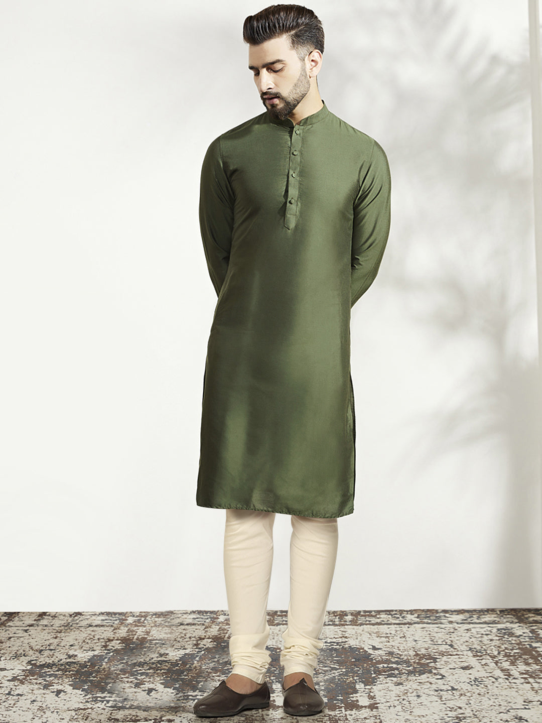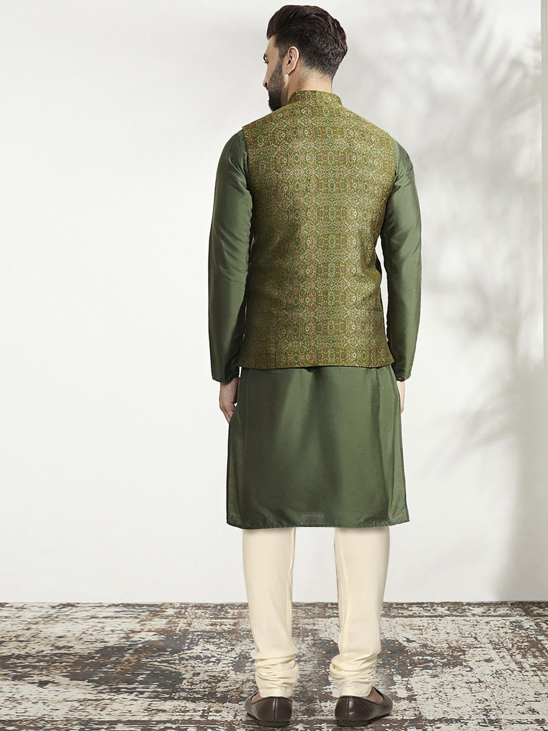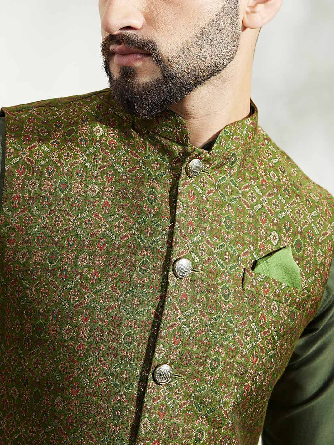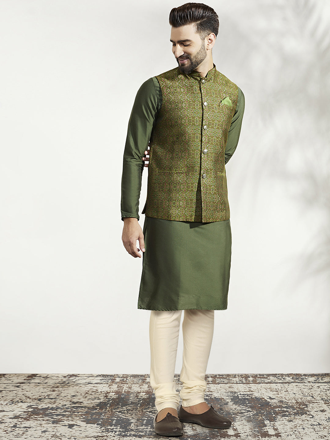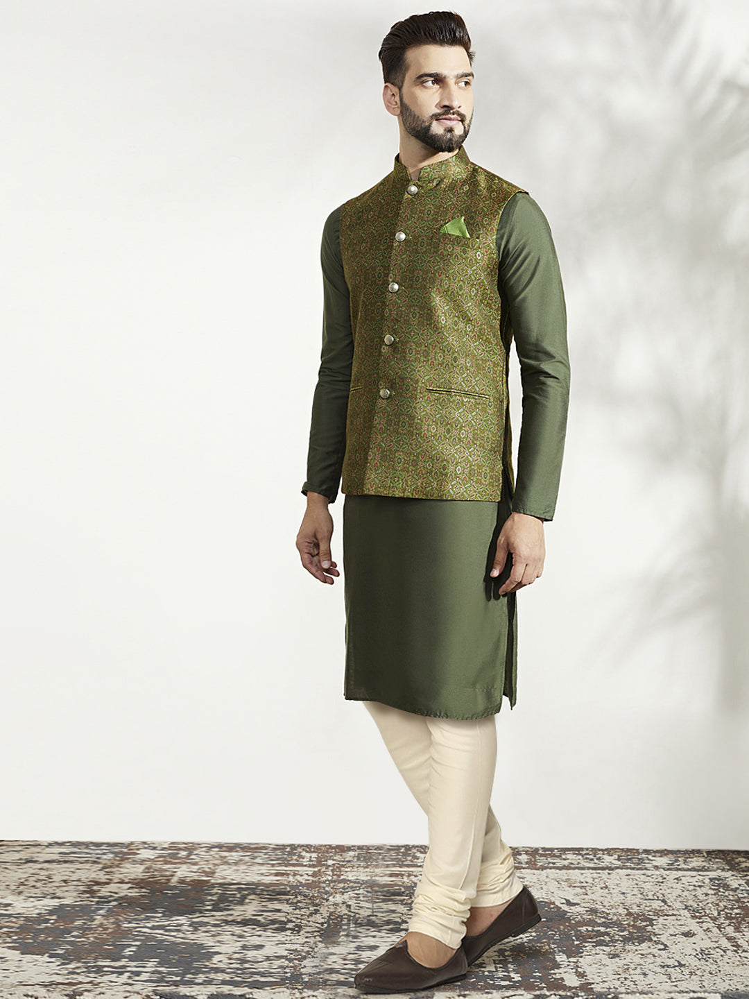 This Kurta Jacket Set with Olive Color is an elegant mandarin collar style that is perfect for occasional wear. With a full sleeve Woven Design design and comfortable fabric, it will make you look stylish.