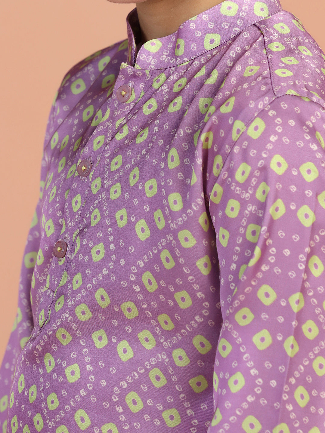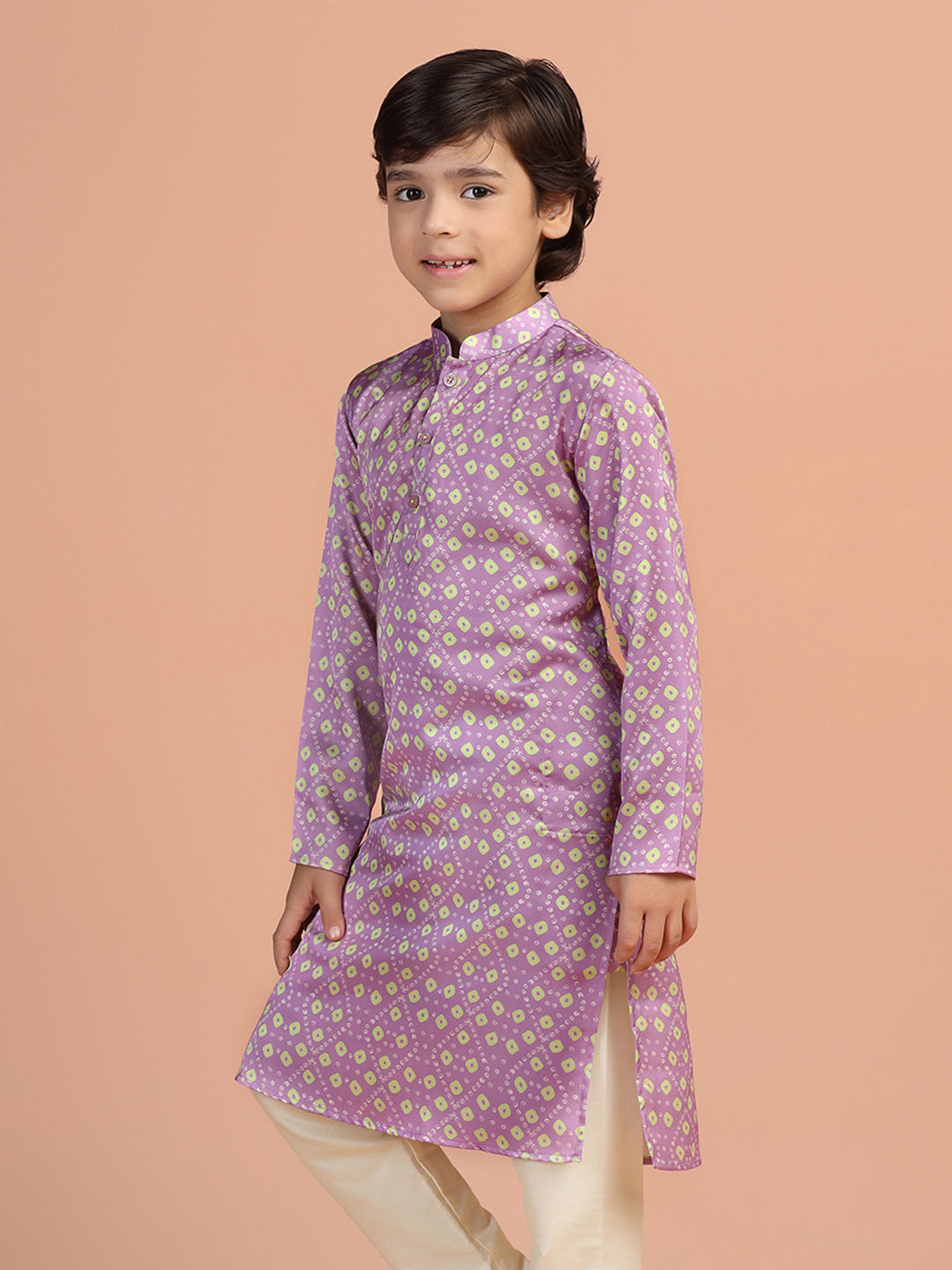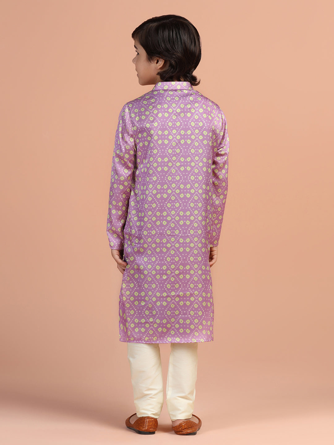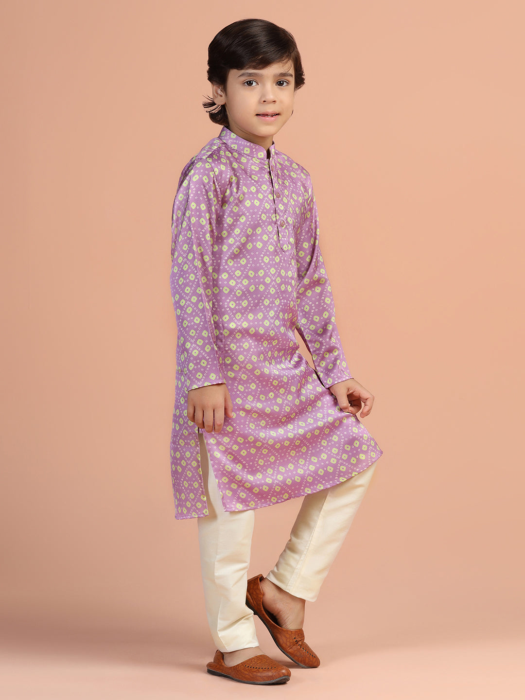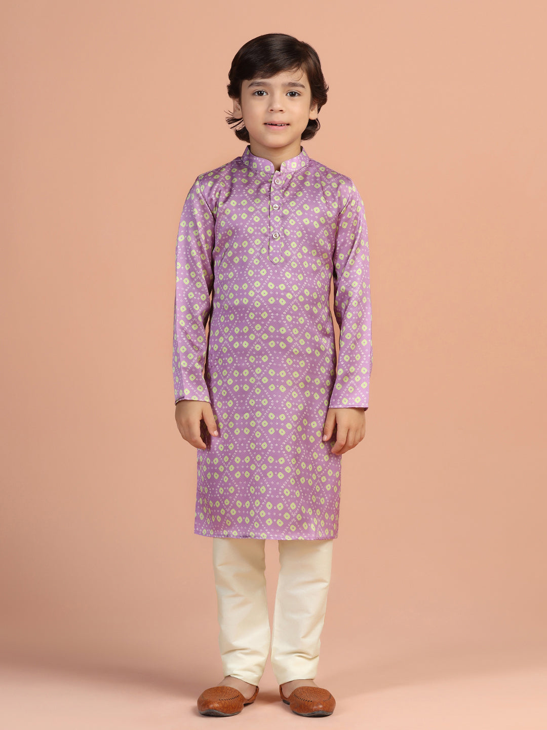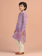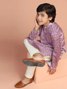 Lavender and gold printed satin kurta pyjama set for boys – elegant, comfortable, and perfect for festive celebrations.