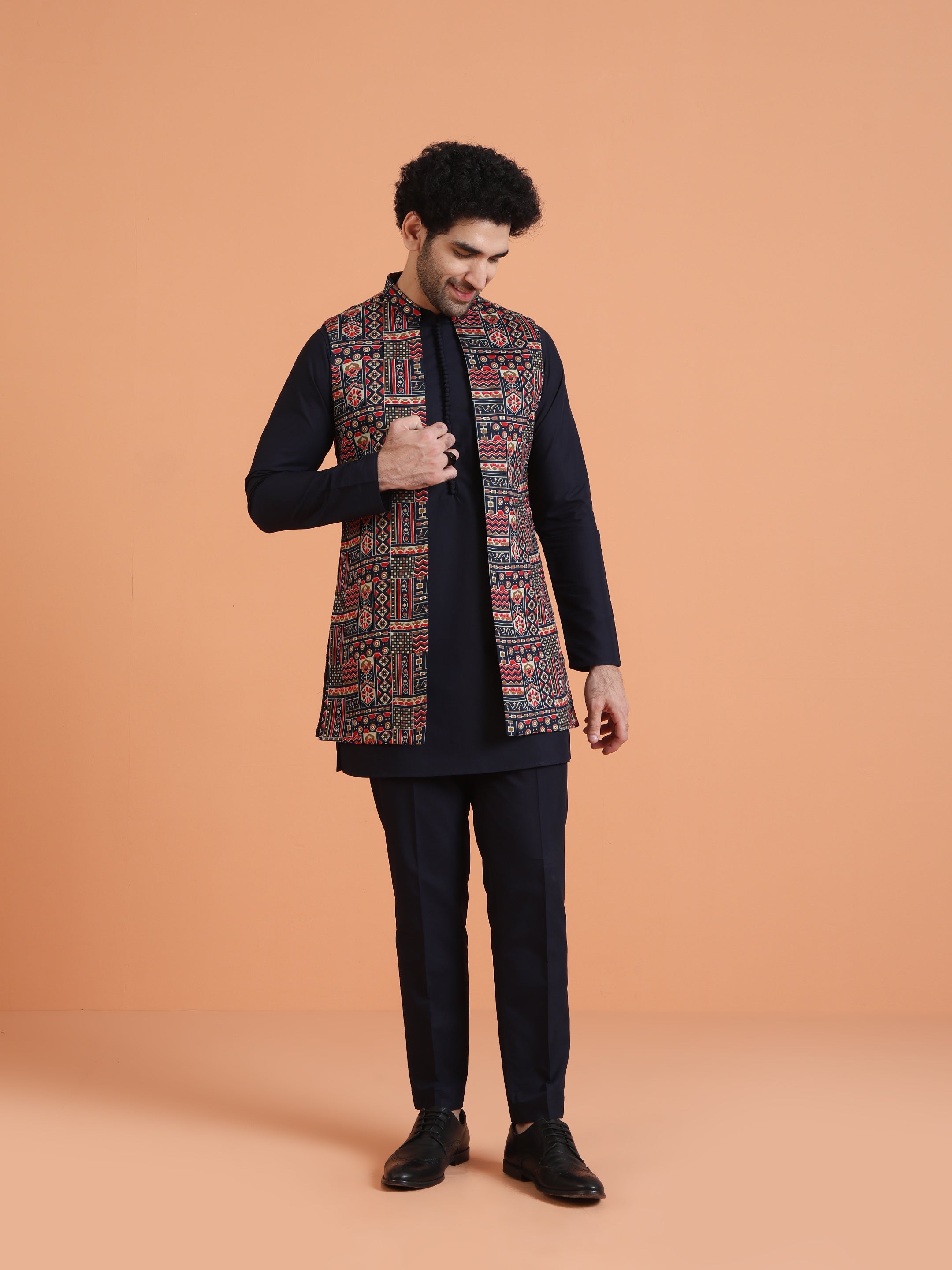 Navy blue printed jacket with mid kurta and trouser set. Crafted in cotton silk blend with geometric motifs for Indo-western wedding & festive occasions.