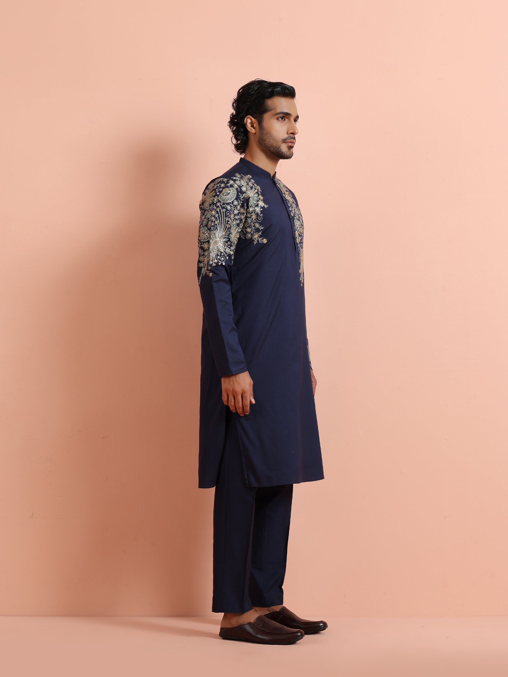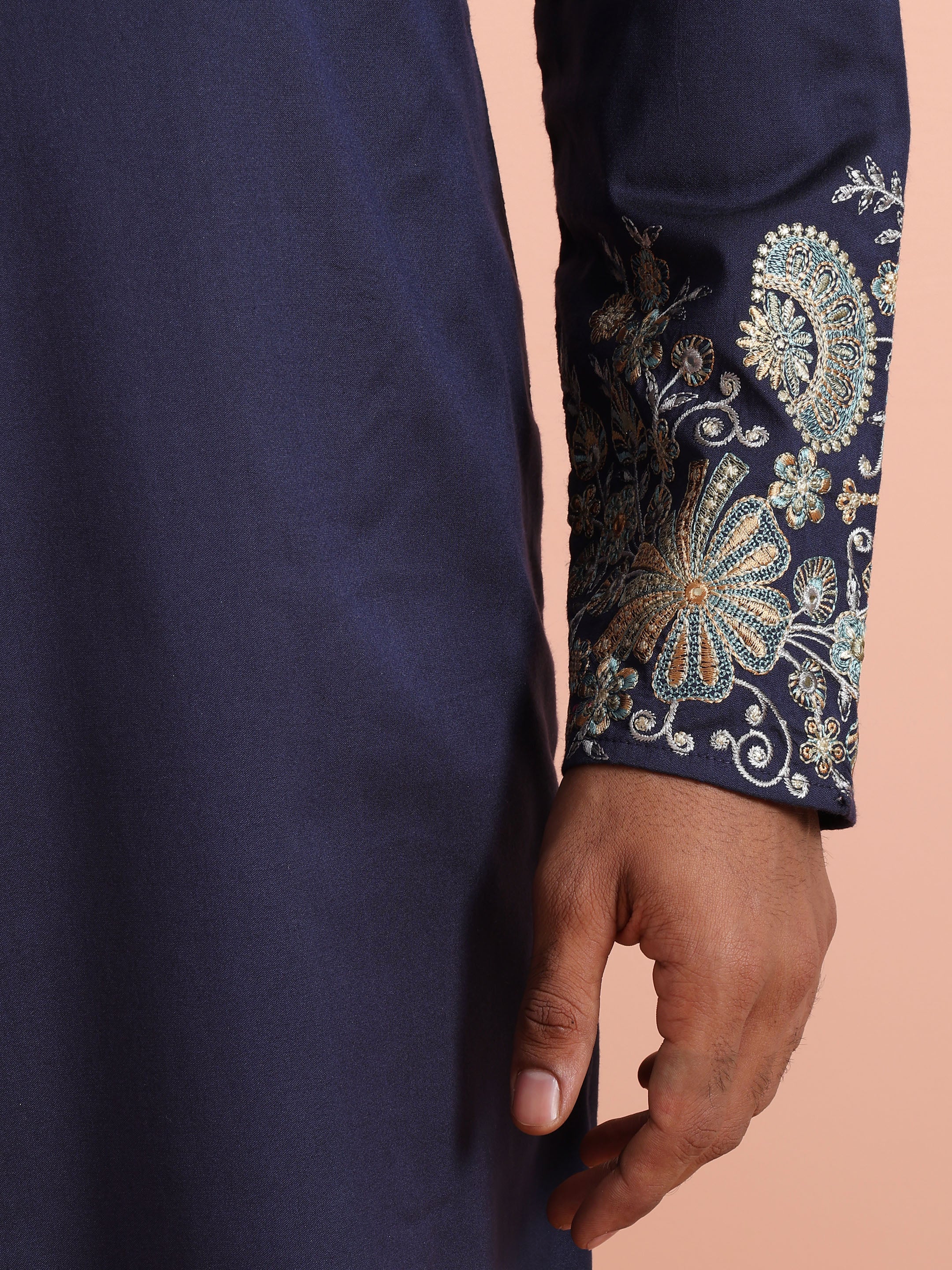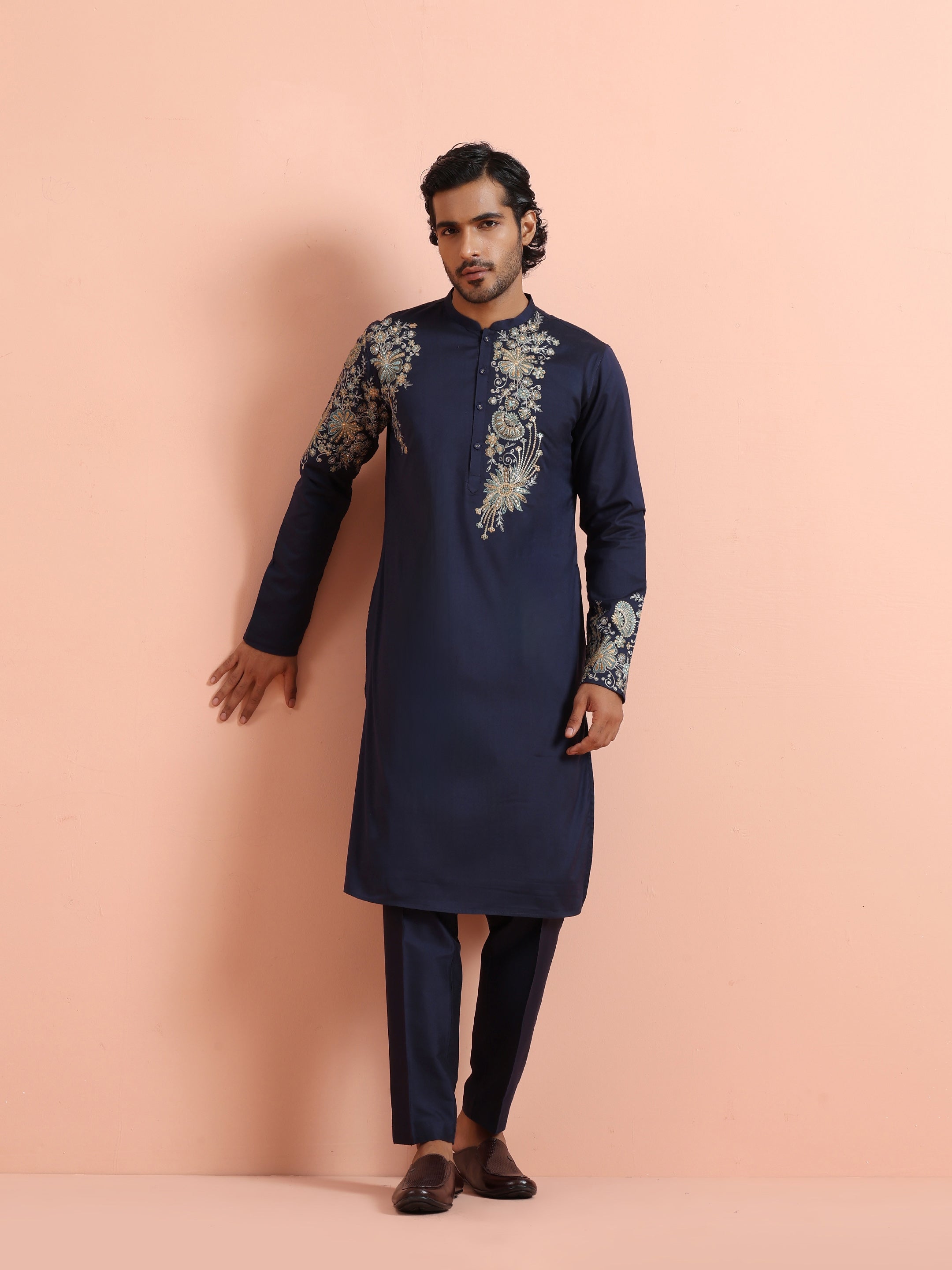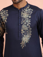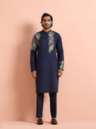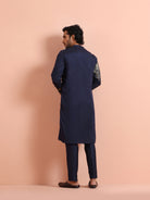 Navy blue silk blend kurta trouser set with intricate floral embroidery. Elegant festive & wedding wear outfit for a royal ethnic statement.