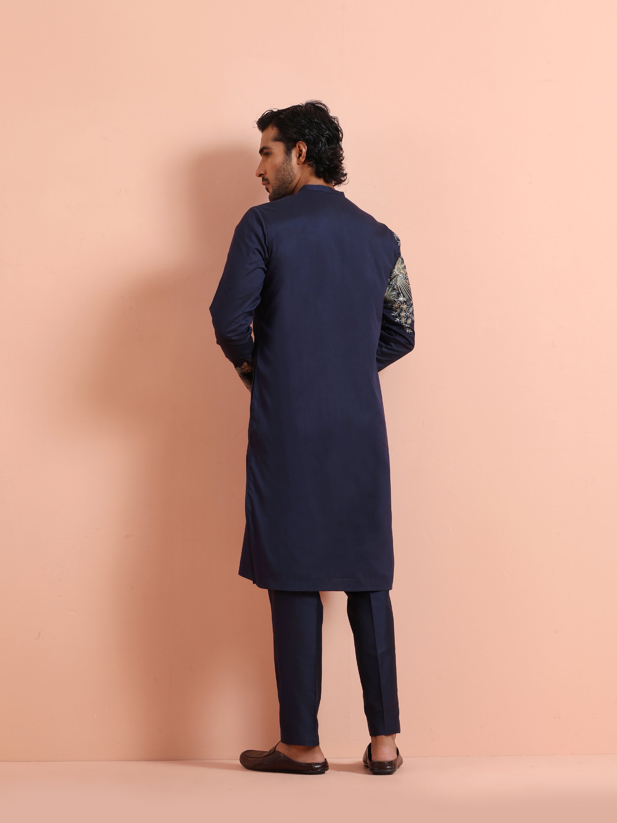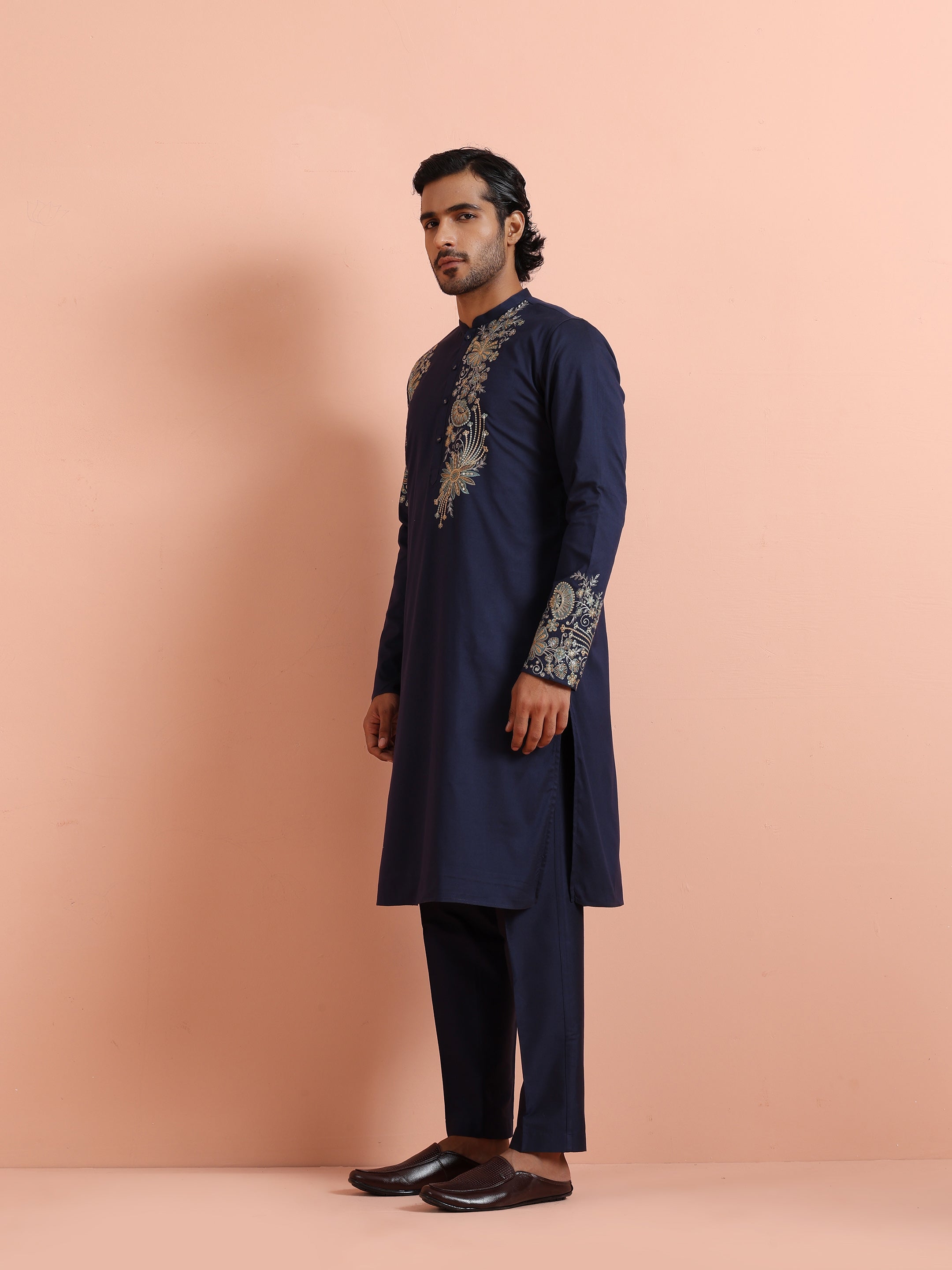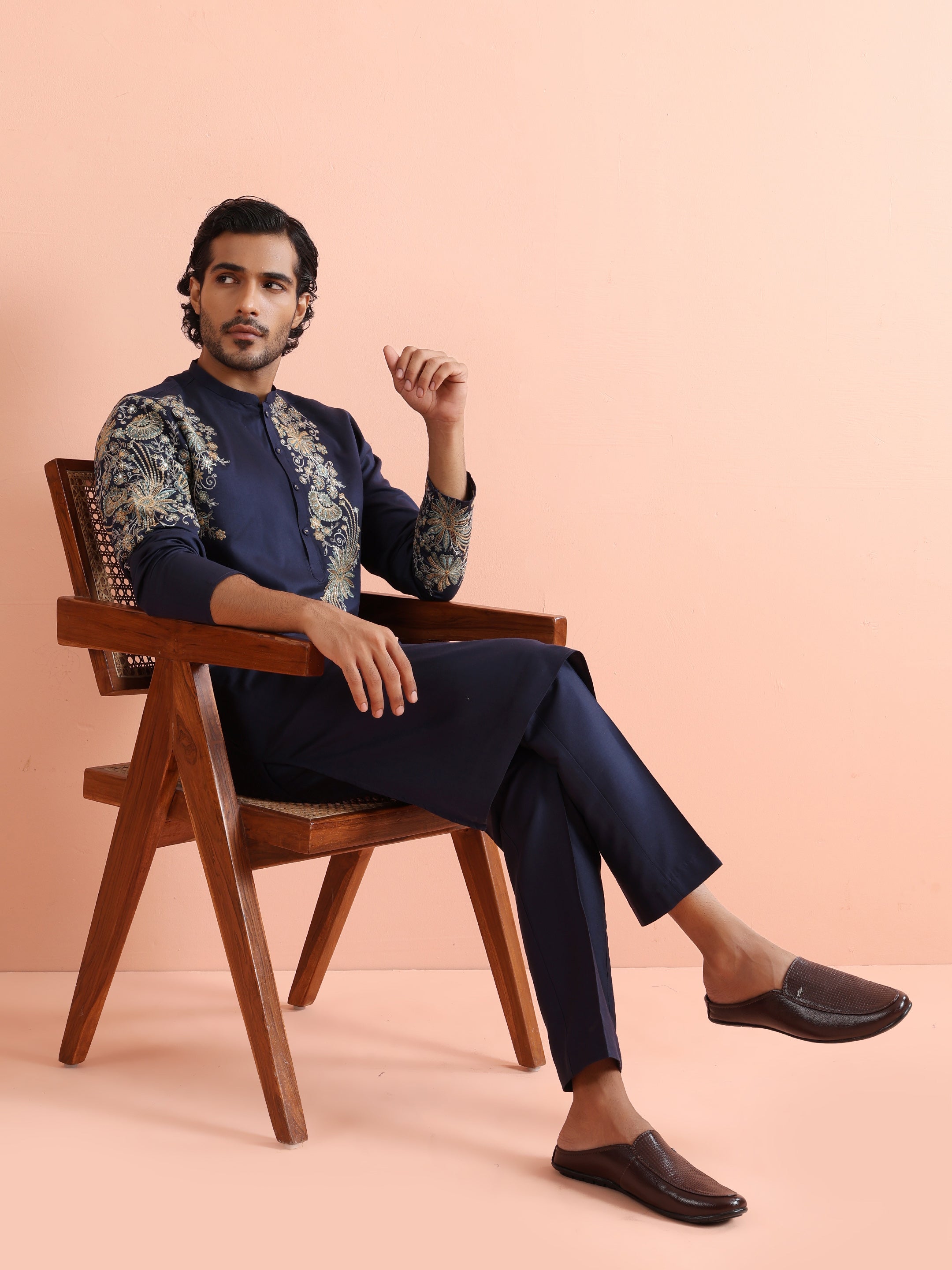Navy blue silk blend kurta trouser set with intricate floral embroidery. Elegant festive & wedding wear outfit for a royal ethnic statement.