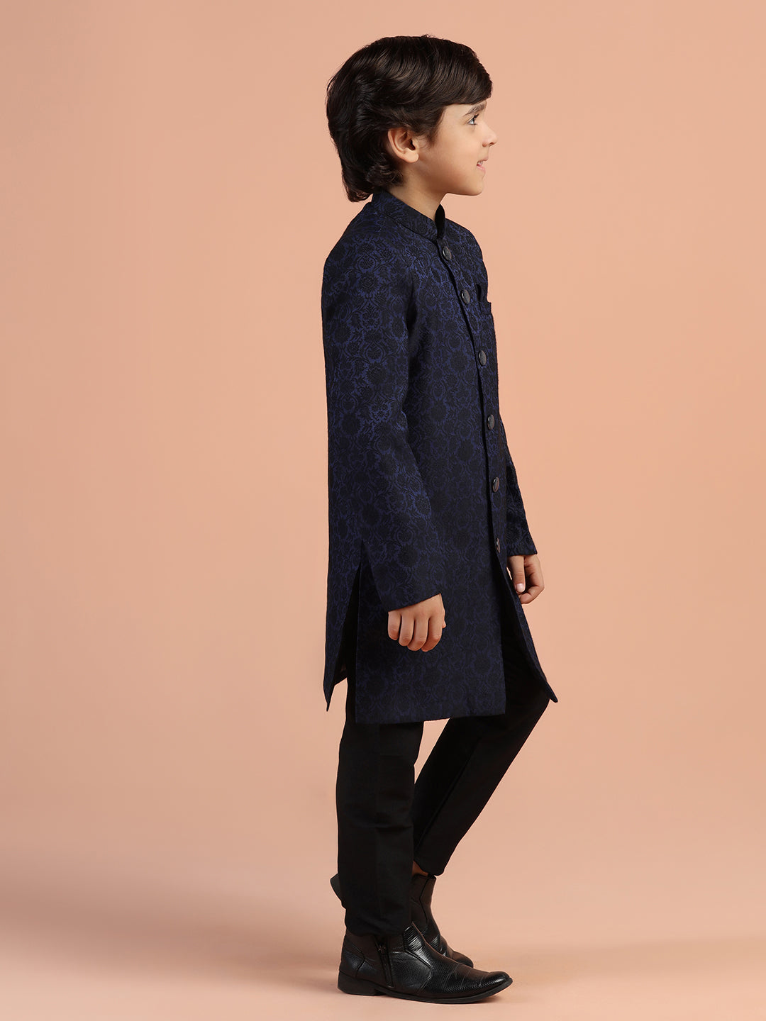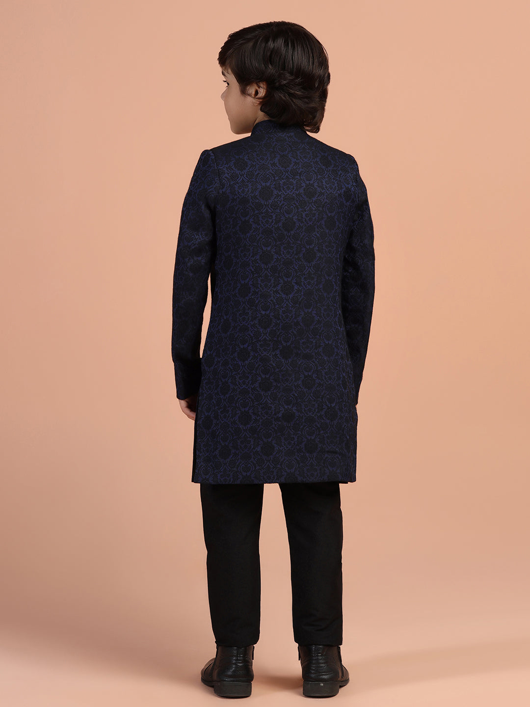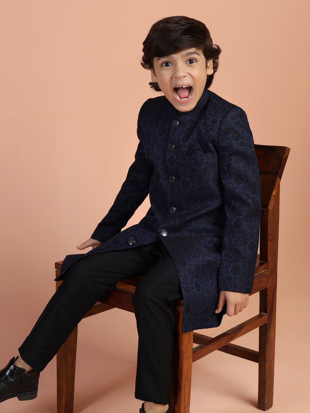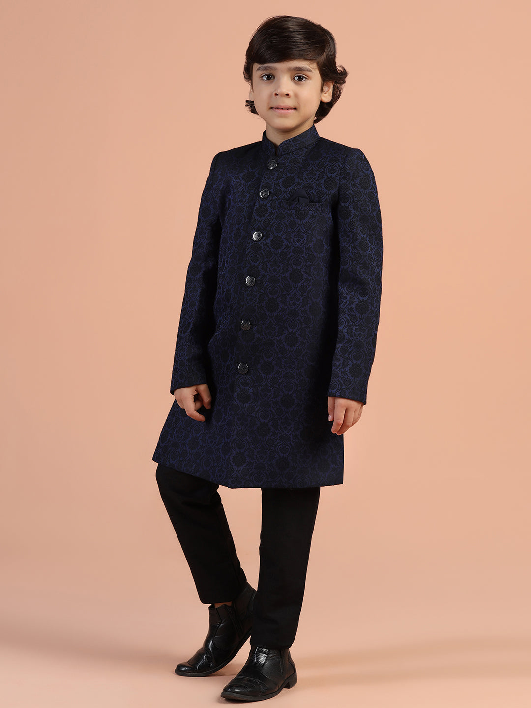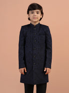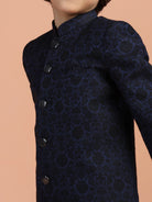 Navy blue jacquard kids sherwani pyjama set – regal, elegant, and perfect for weddings, receptions, and festive events.