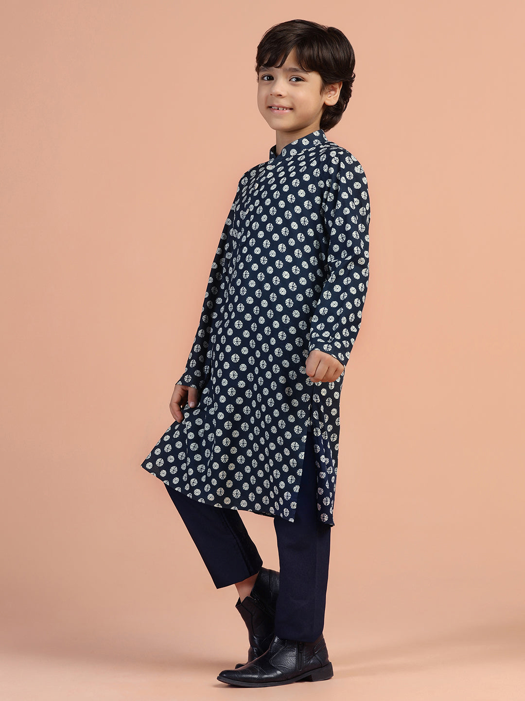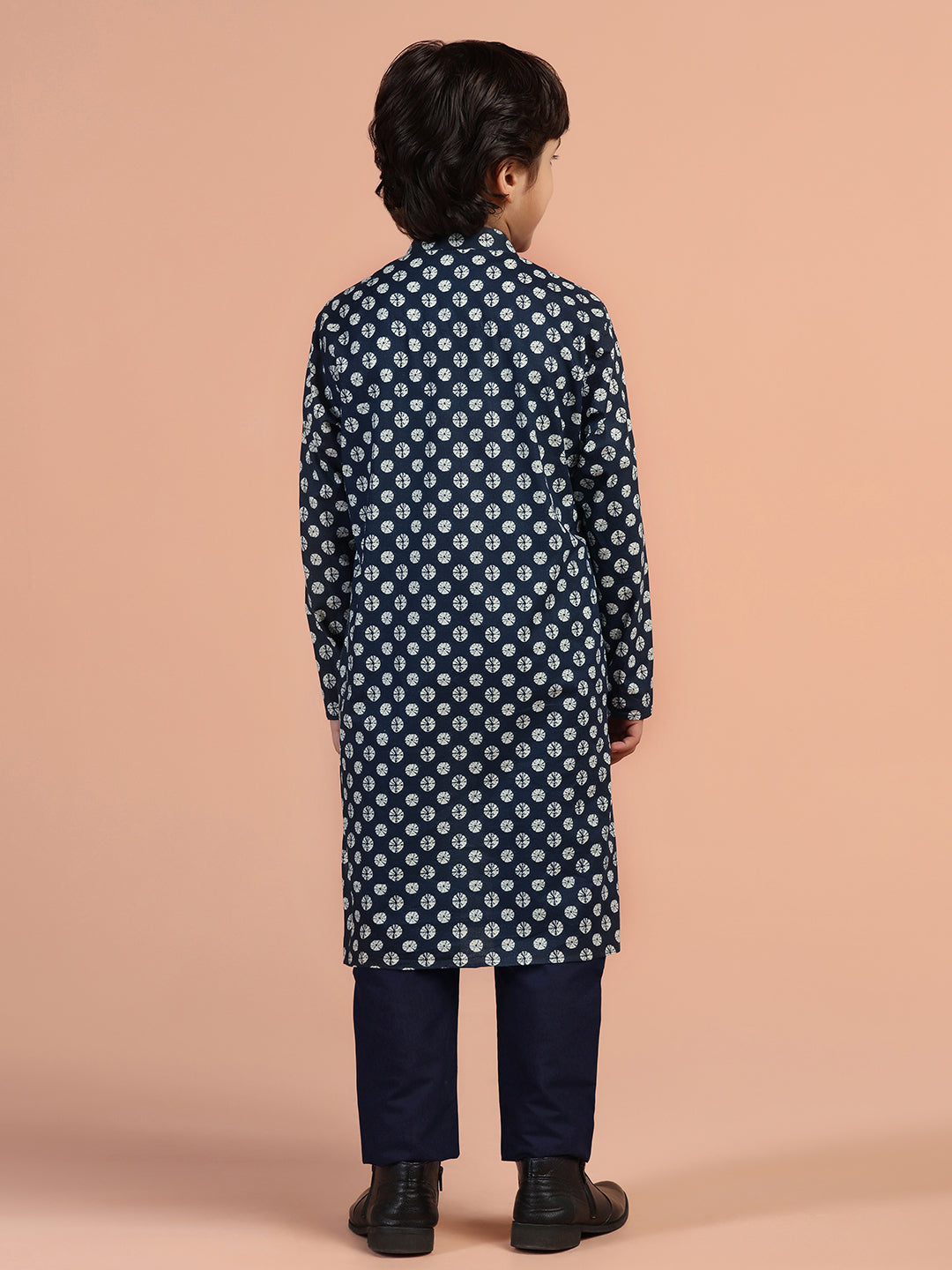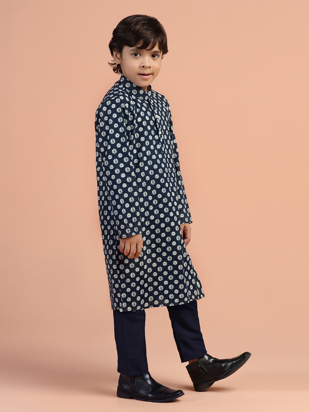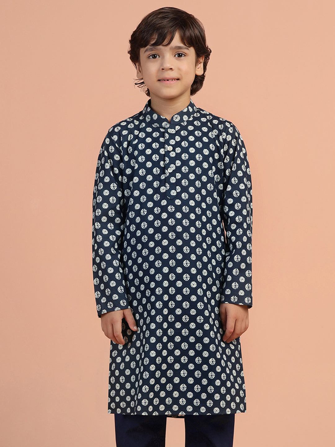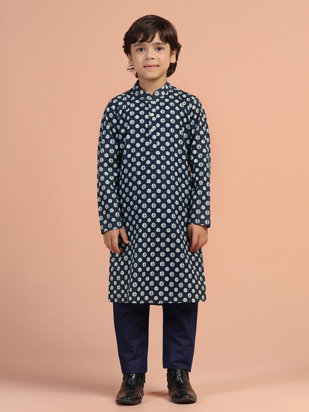 Navy blue printed cotton kurta pyjama set for boys – soft, breathable, and perfect for festive functions, family gatherings, or cultural events.
