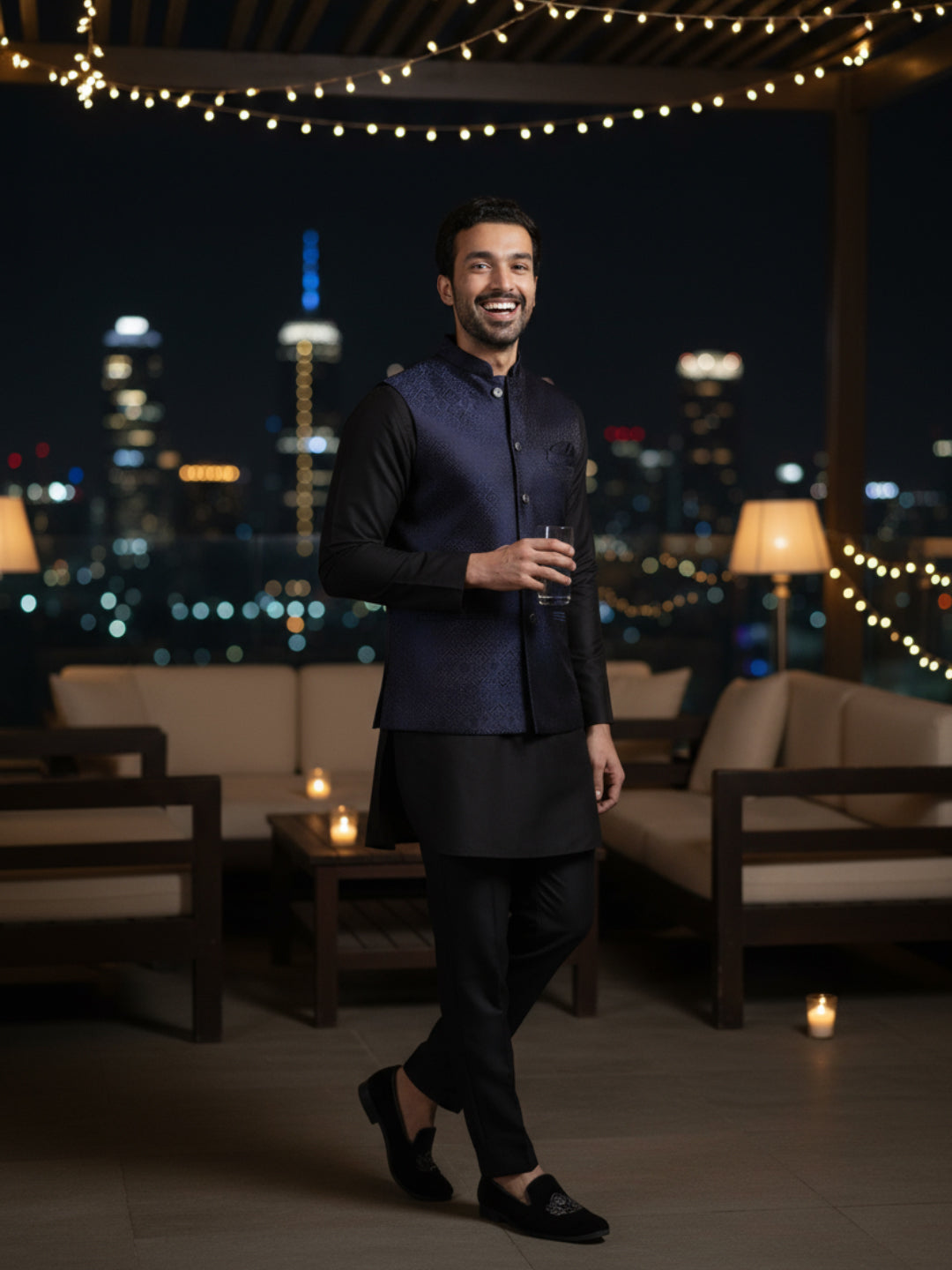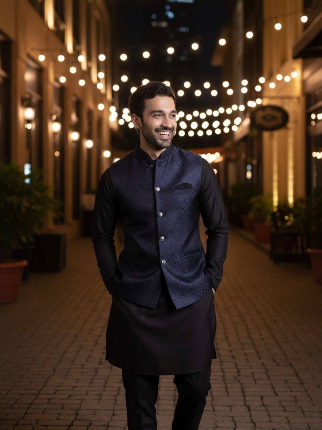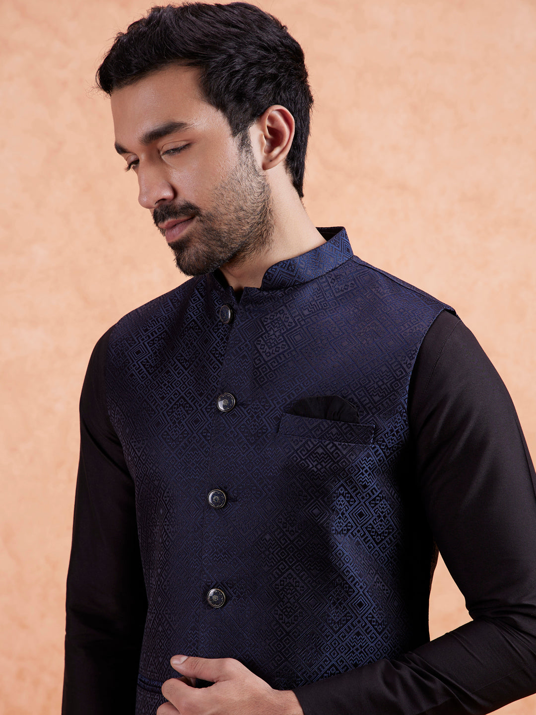 Navy Blue Jacquard Silk Blend Kurta Jacket Set