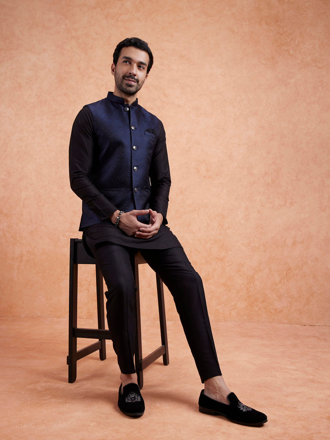 Navy Blue Silk Blend Textured Mid Kurta Jacket Trouser Set, Perfect festive ethnic wear for men, ideal festive and casual occasions.