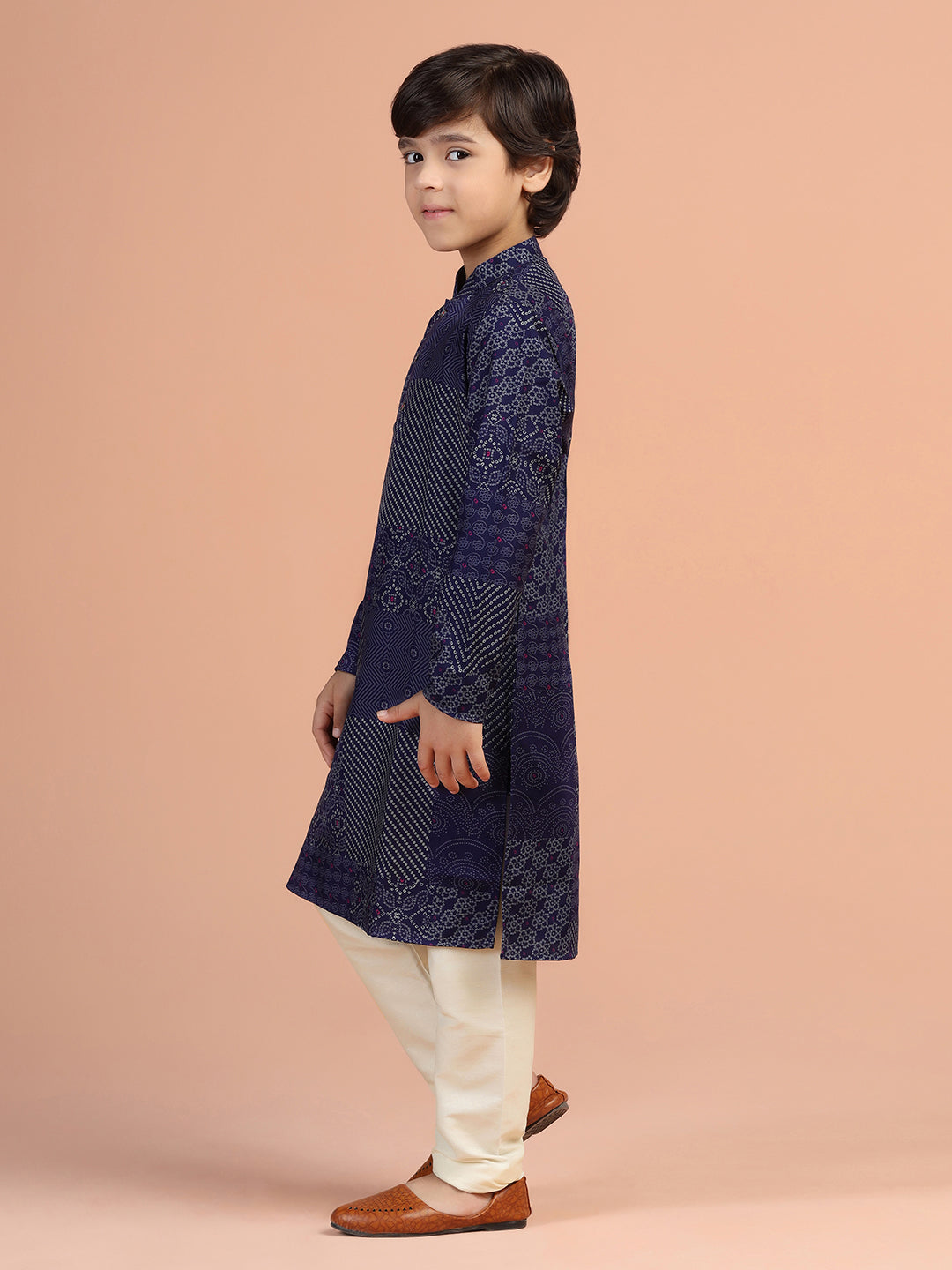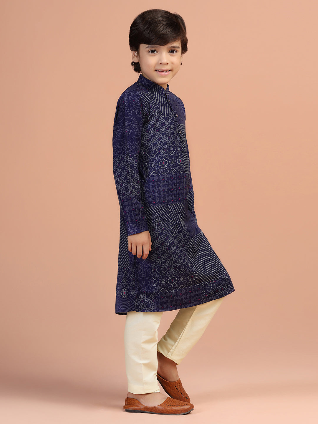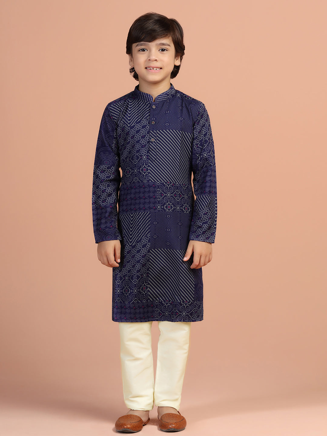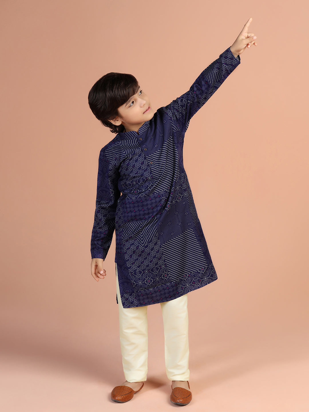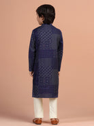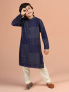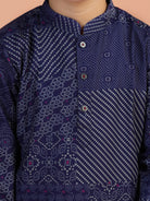 Navy printed kurta pyjama set for boys – stylish geometric pattern ethnic outfit in breathable cotton blend for weddings and festive wear.
