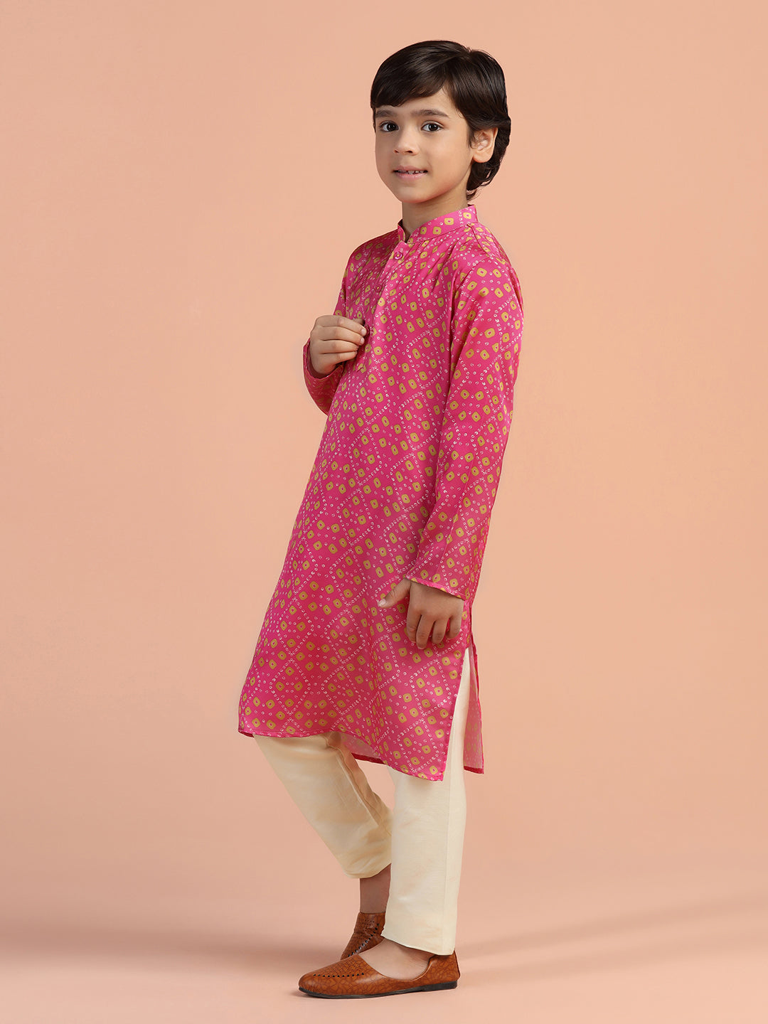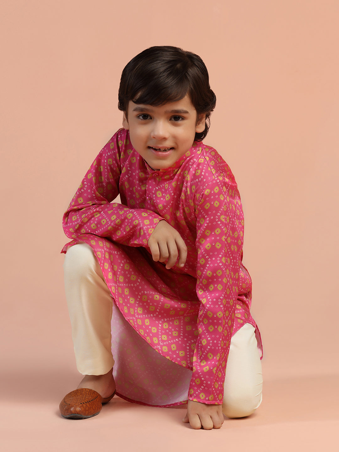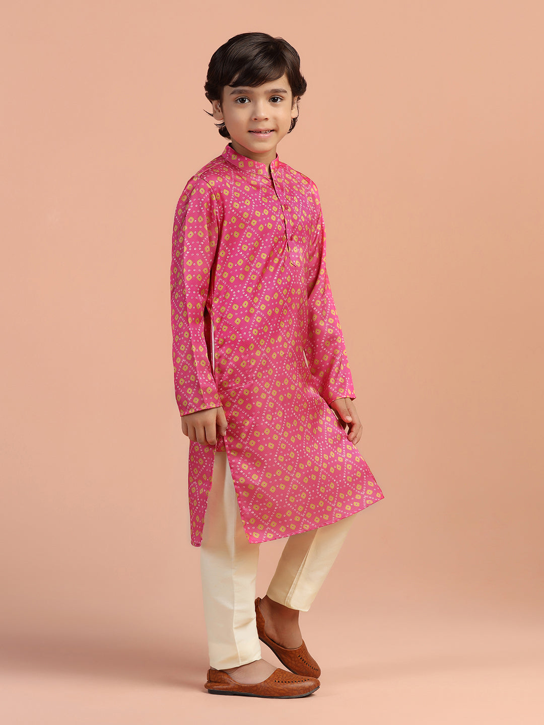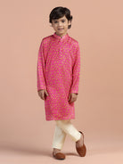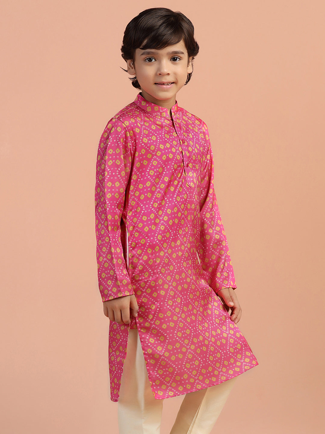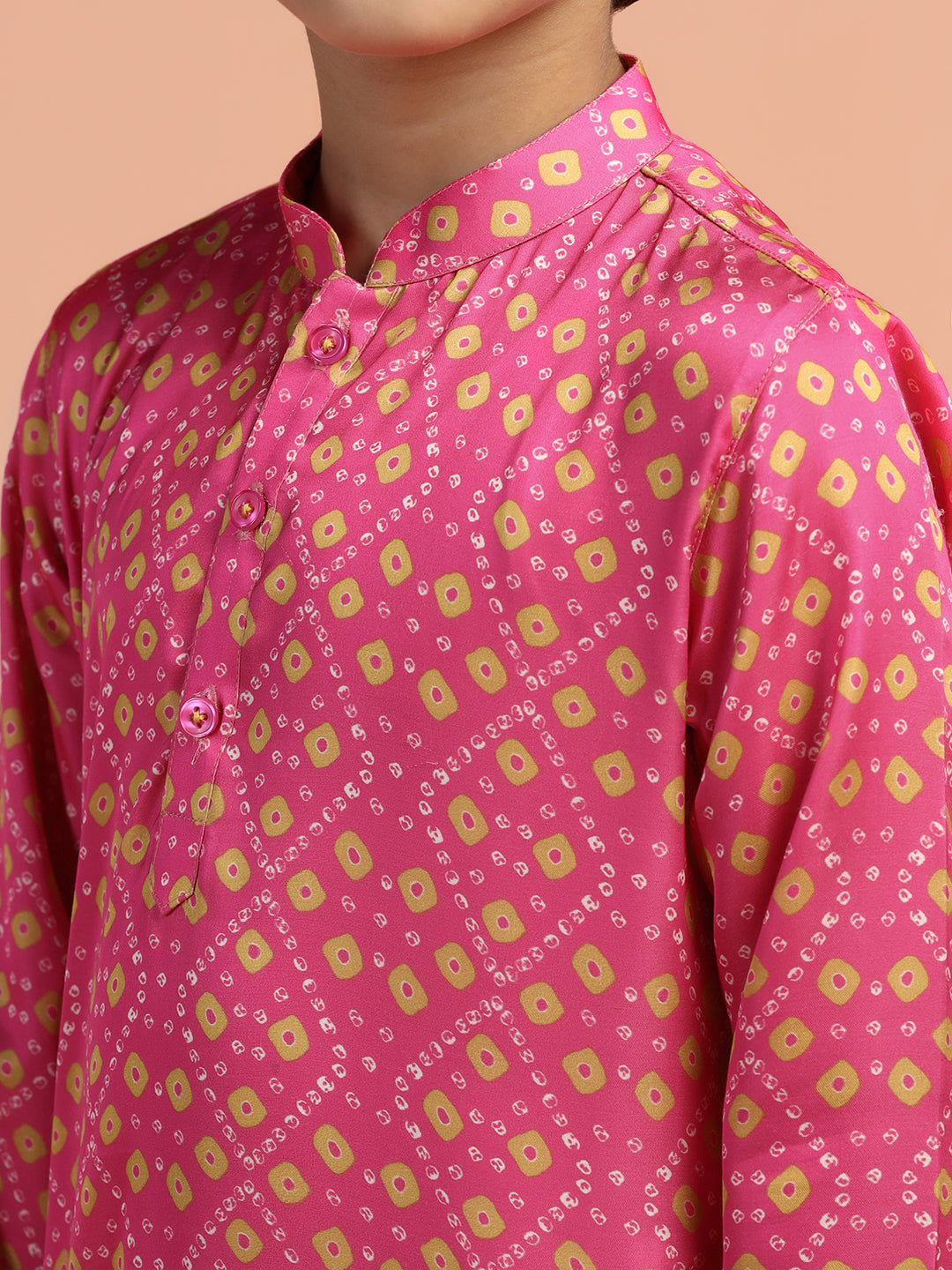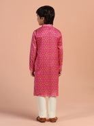 Vibrant pink and gold printed satin kurta pyjama set for boys – soft, festive, and perfect for celebrations.