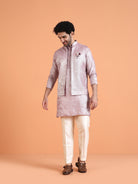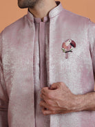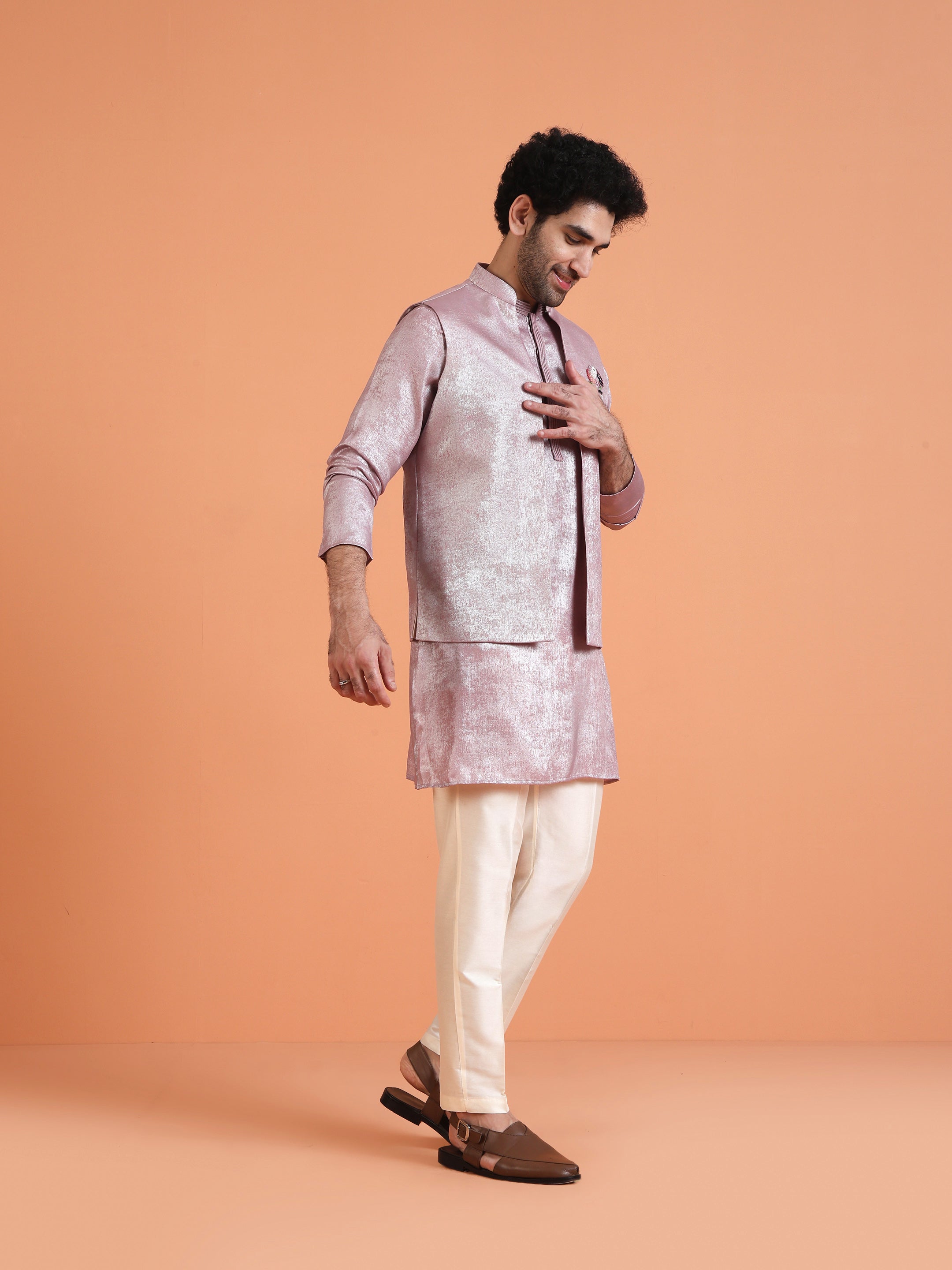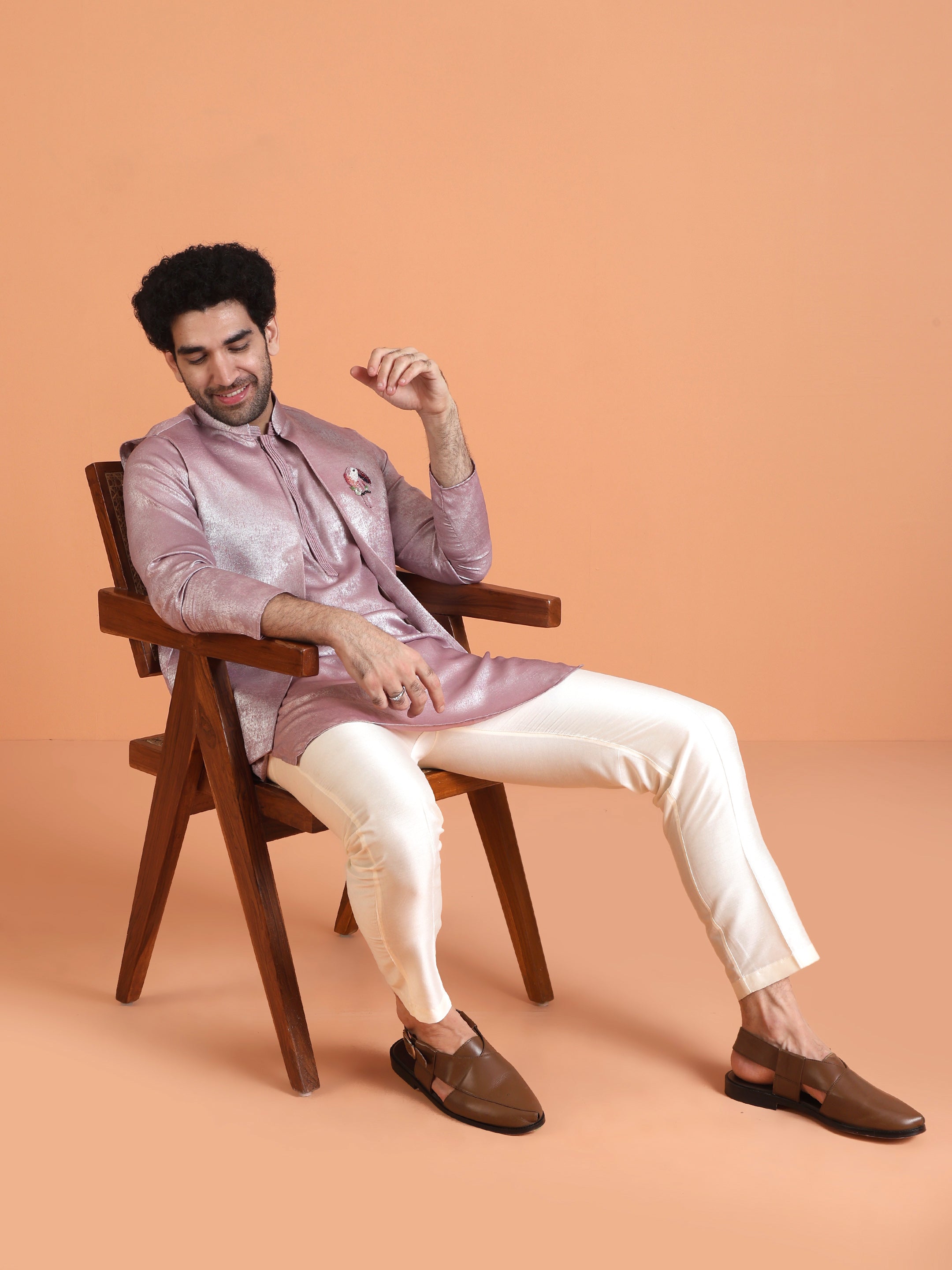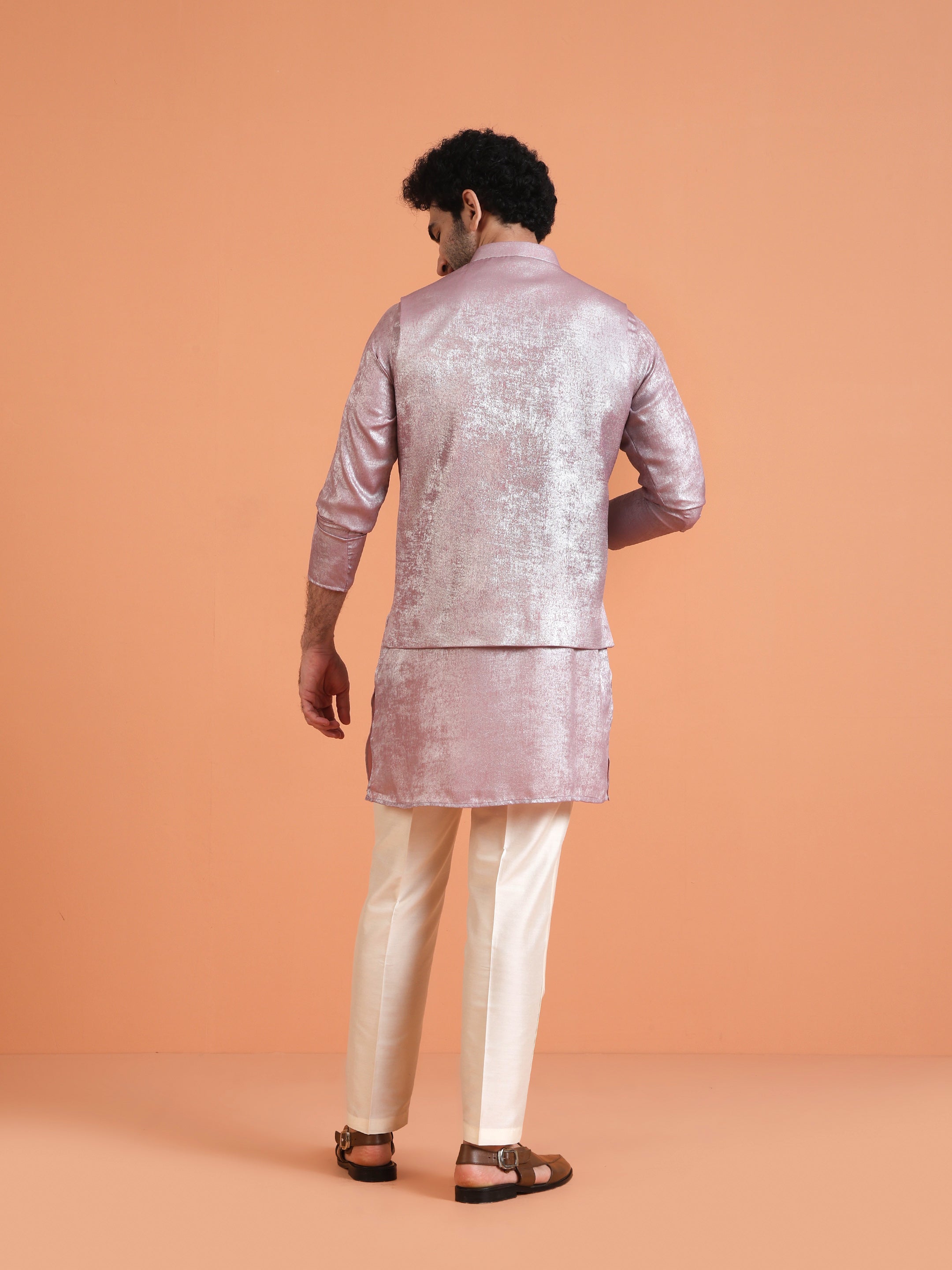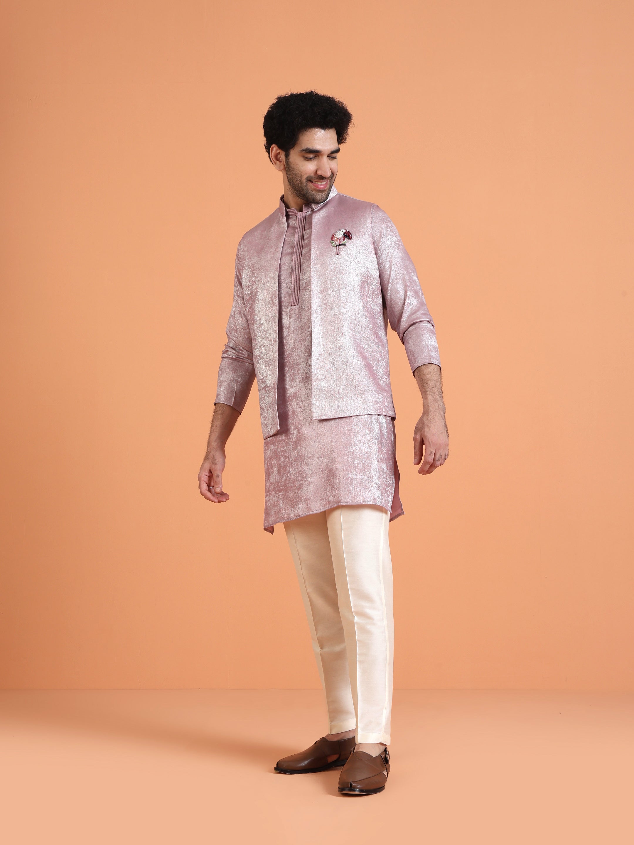 Pink metallic textured kurta trouser set with embellished brooch jacket. Ideal for wedding cocktails, roka & festive celebrations.