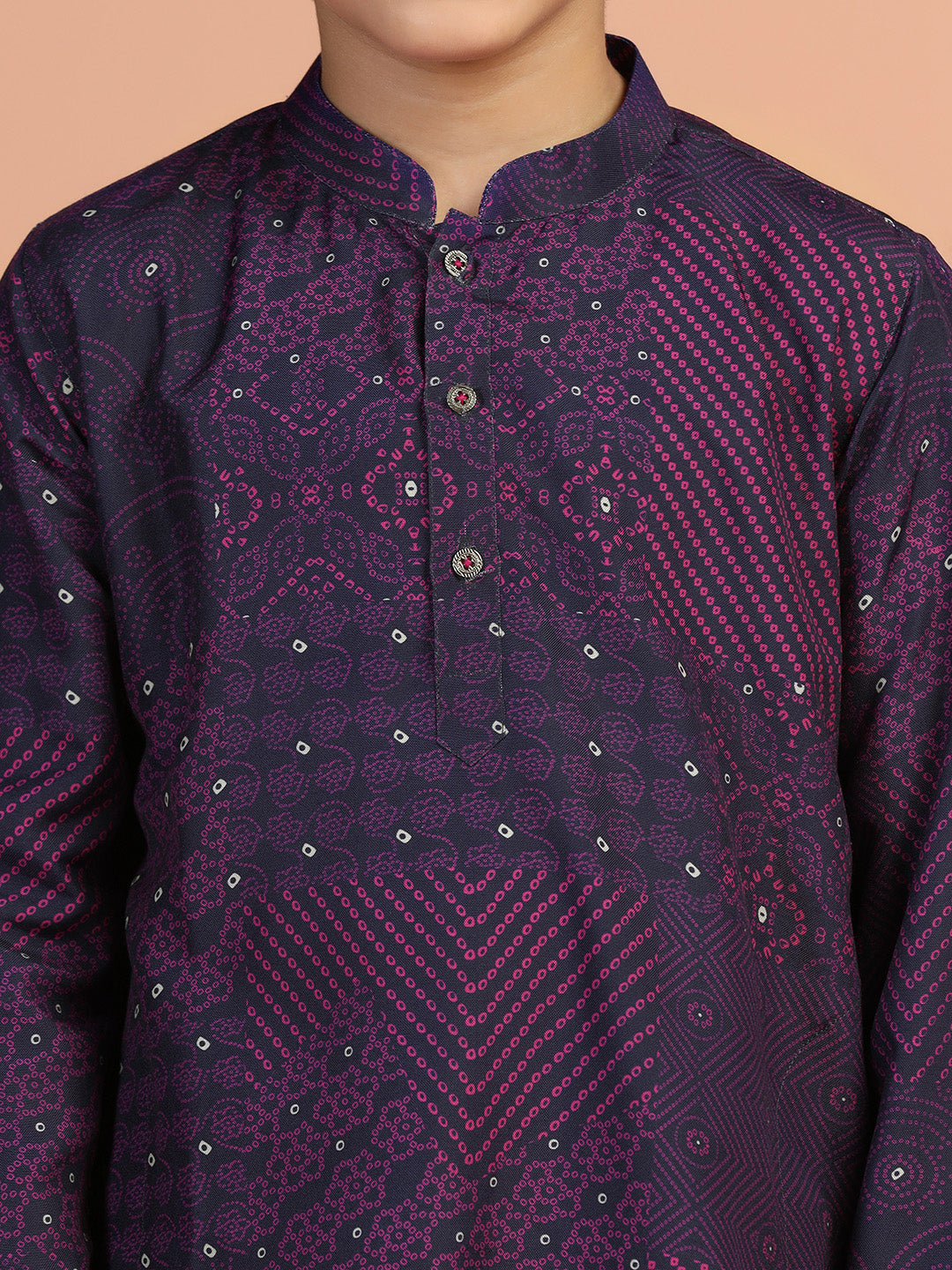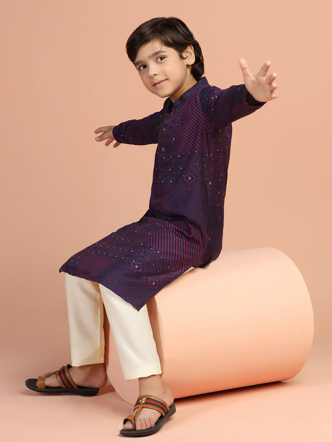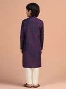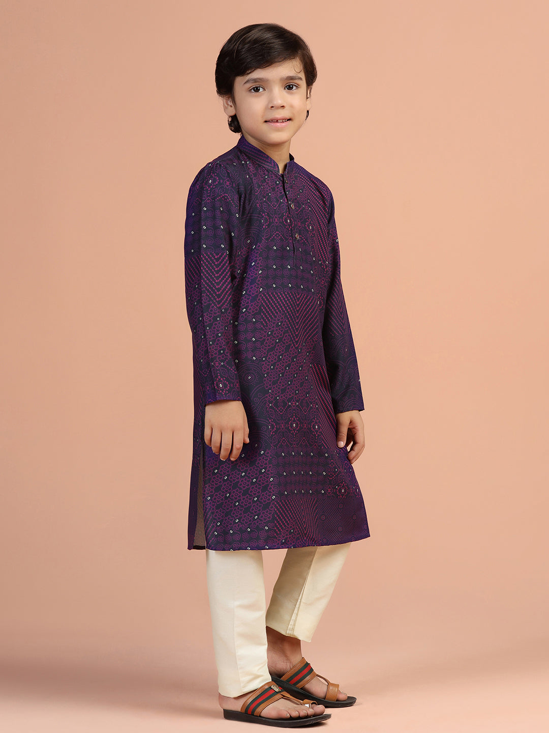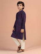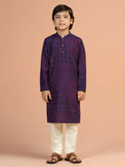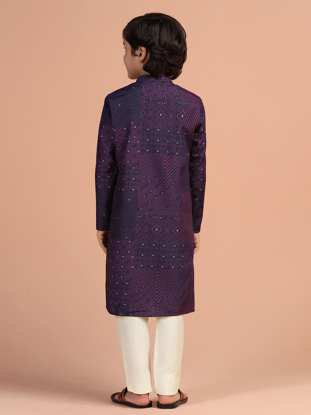 Purple printed kurta pyjama set for boys with mirror work-inspired detailing – festive ethnic wear that’s comfortable and elegant.