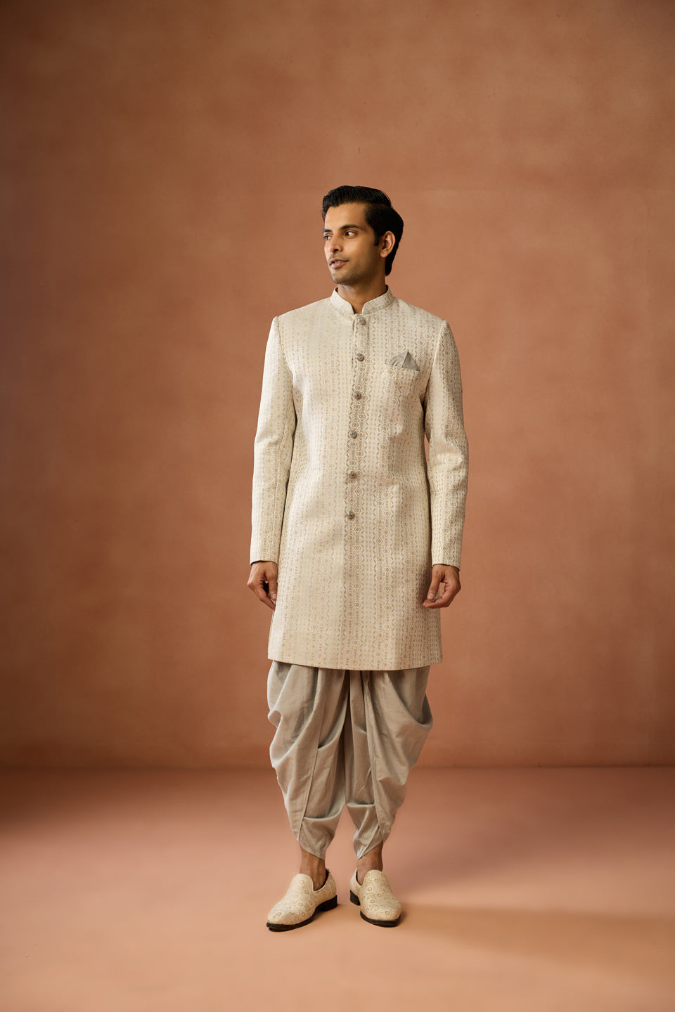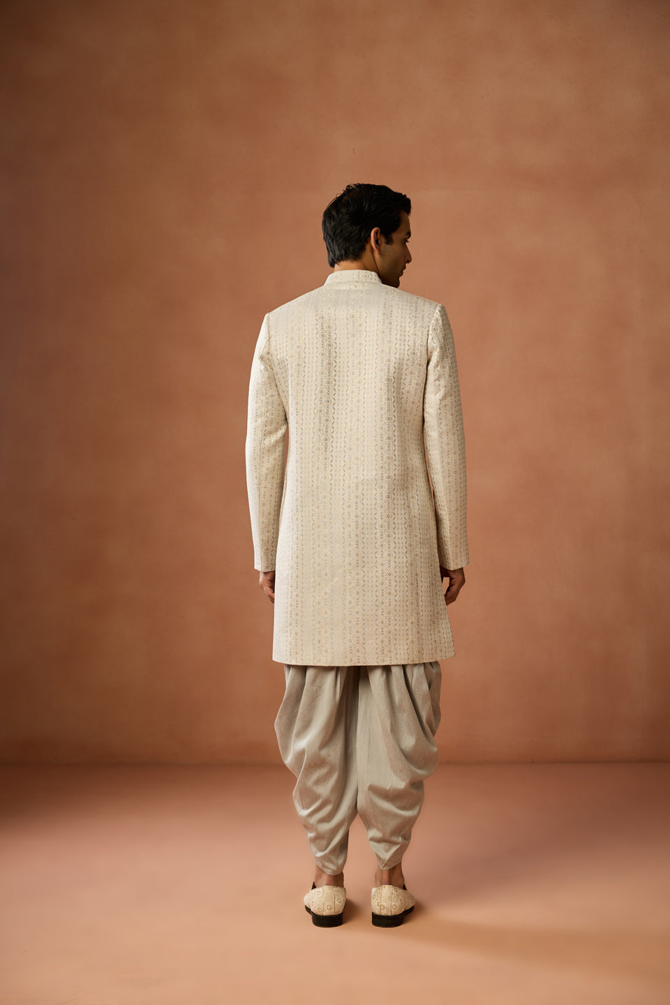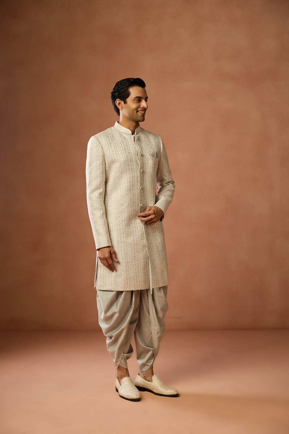Silver Silk Blend Jacquard Sherwani Dhoti Set, Perfect festive ethnic wear for men, ideal festive and casual occasions.