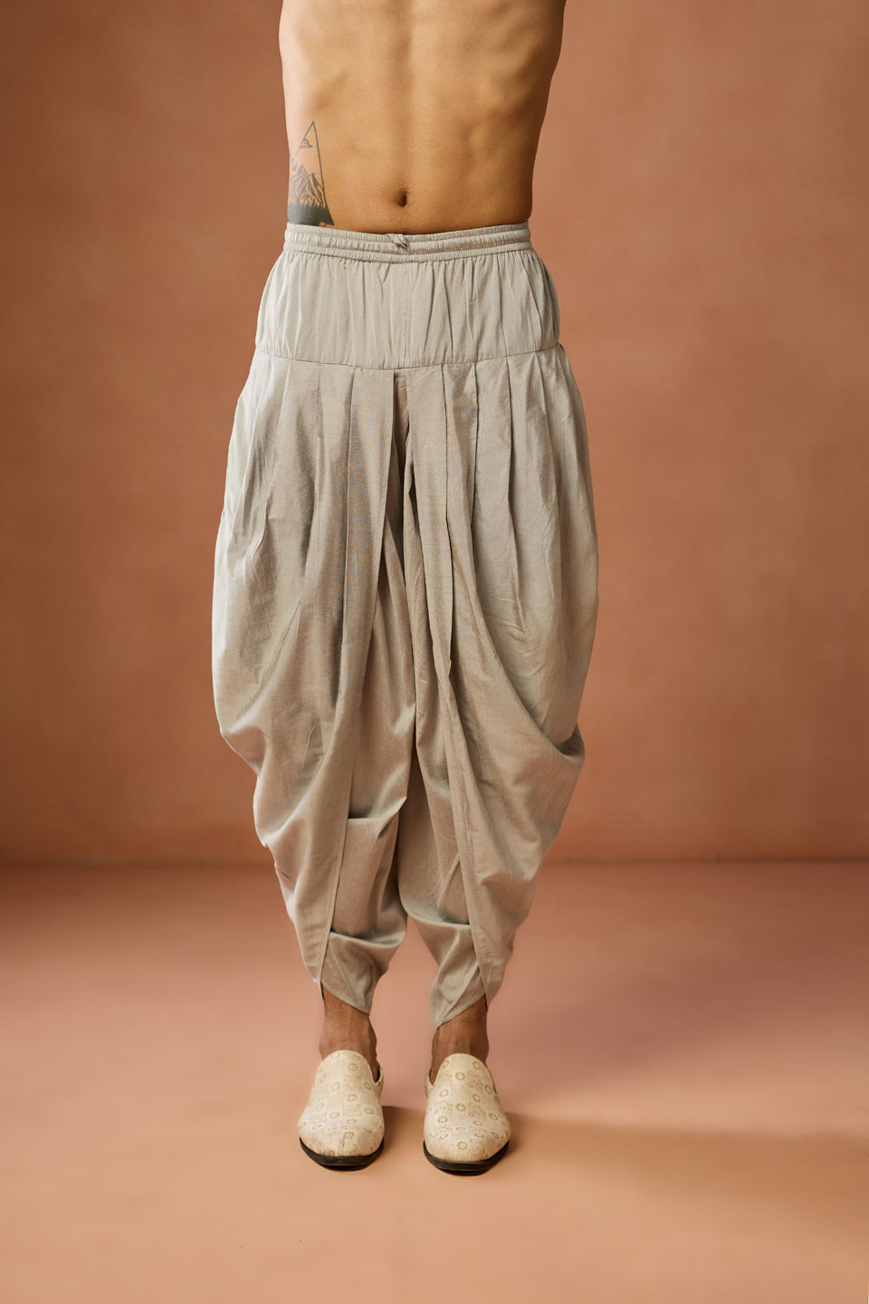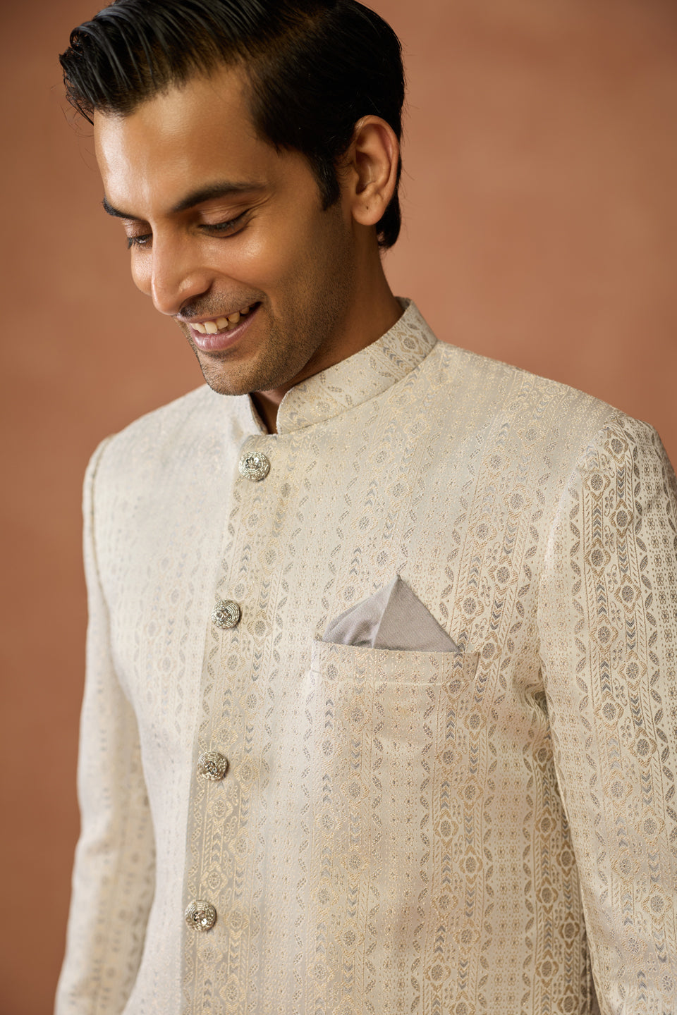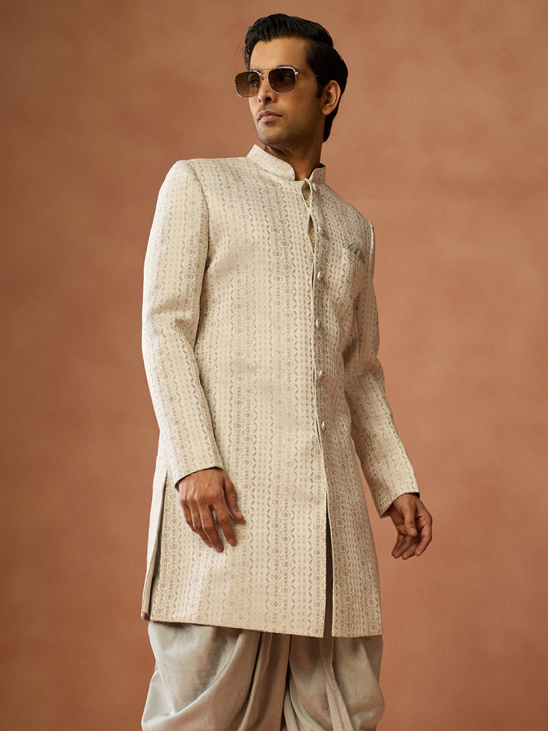 Silver Silk Blend Jacquard Sherwani Dhoti Set, Perfect festive ethnic wear for men, ideal festive and casual occasions.