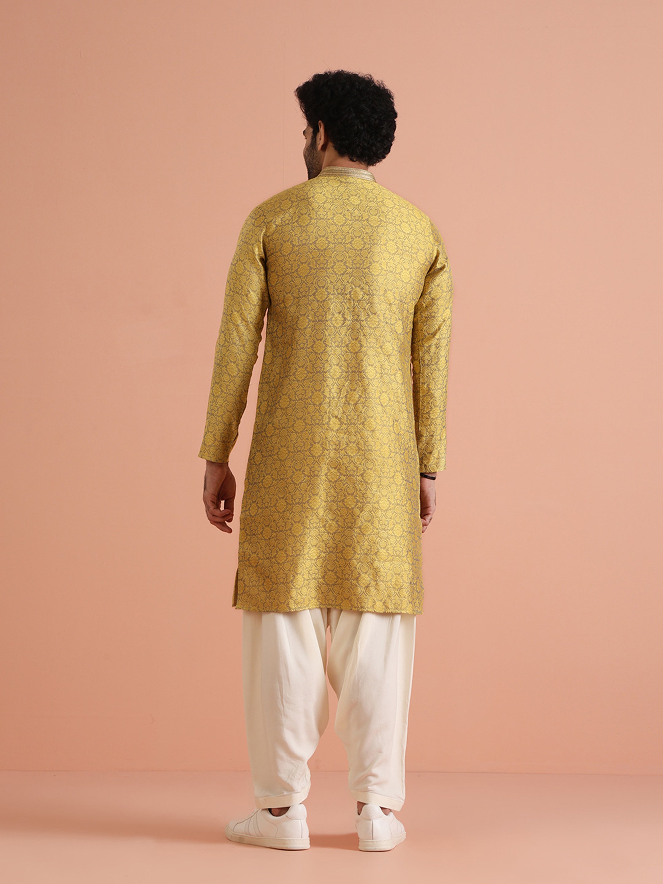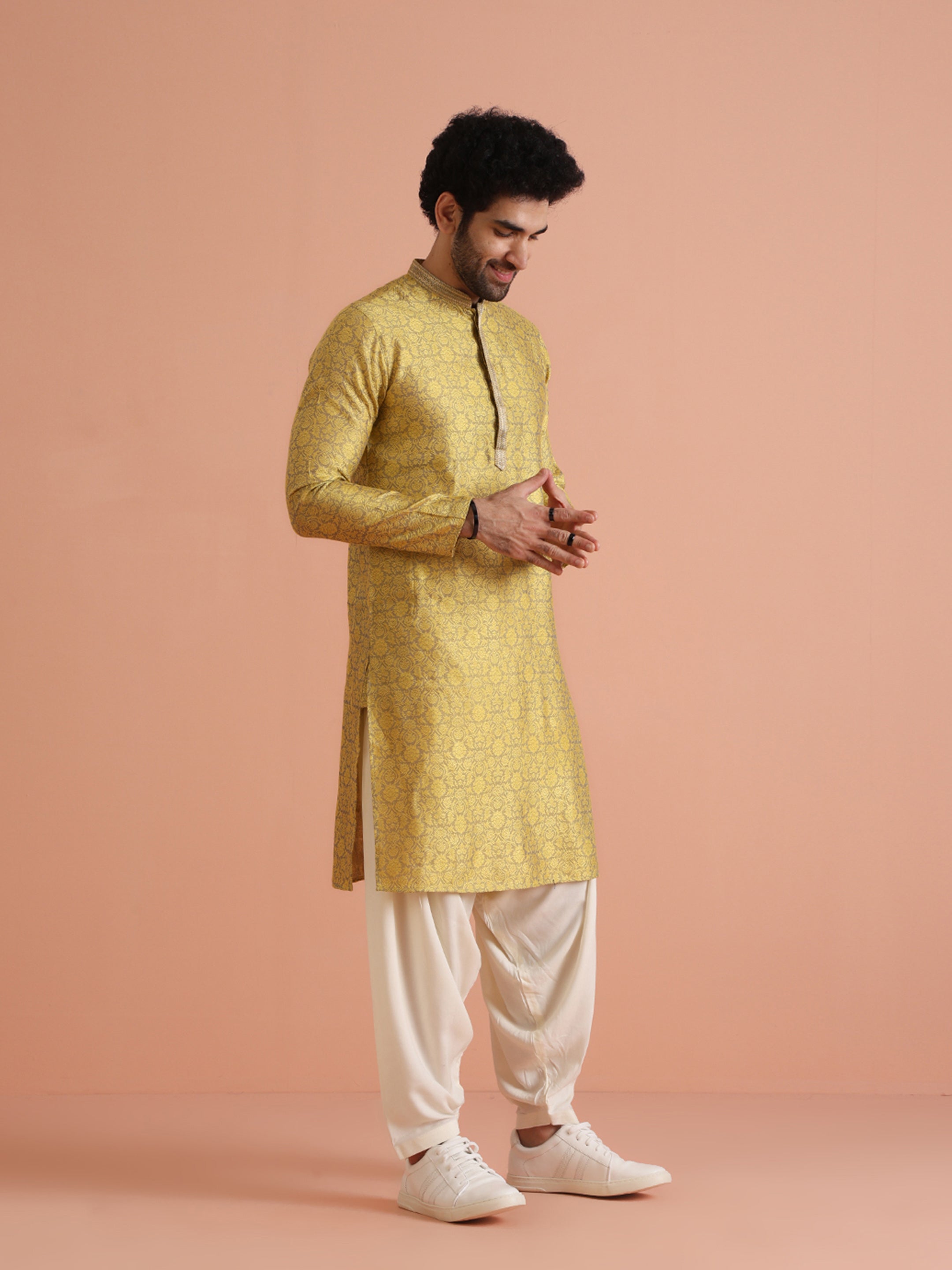 Experience classic elegance with this Men's Mustard Color Silk Blend Kurta Patiala Set. The Jacquard Pattern adds a refined touch, while the breathable fabric ensures comfort throughout the day. Ideal for festive events or casual wear, this Kurta Patiala Set is a wardrobe essential.