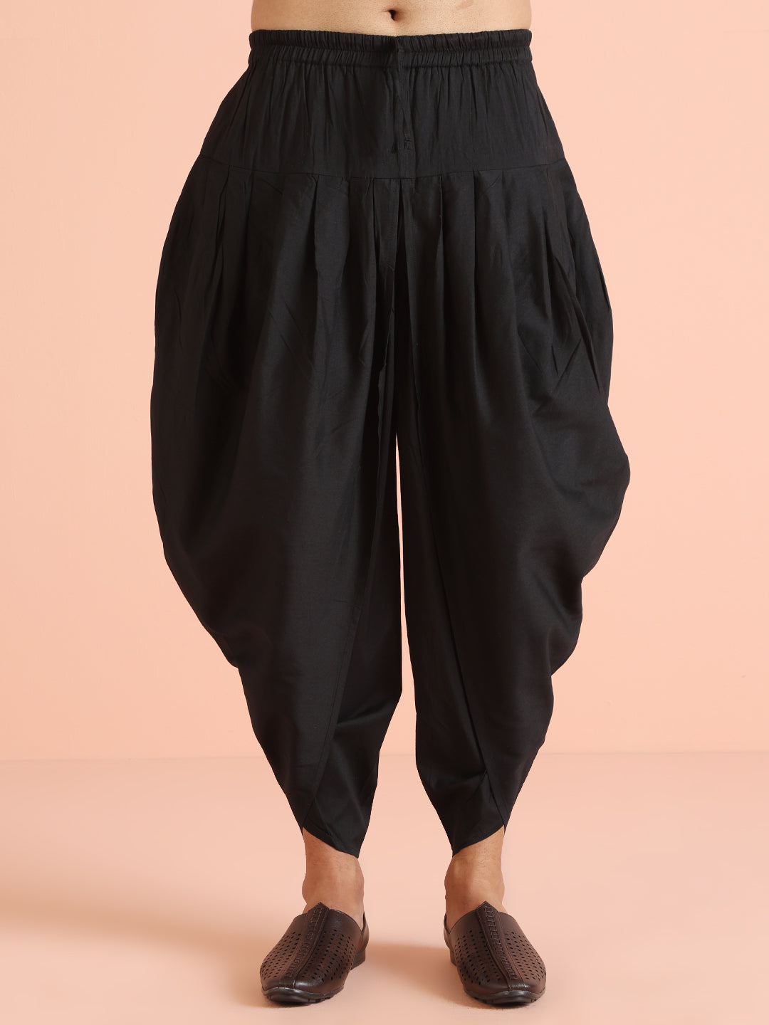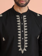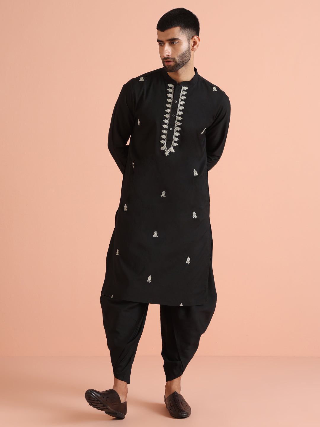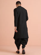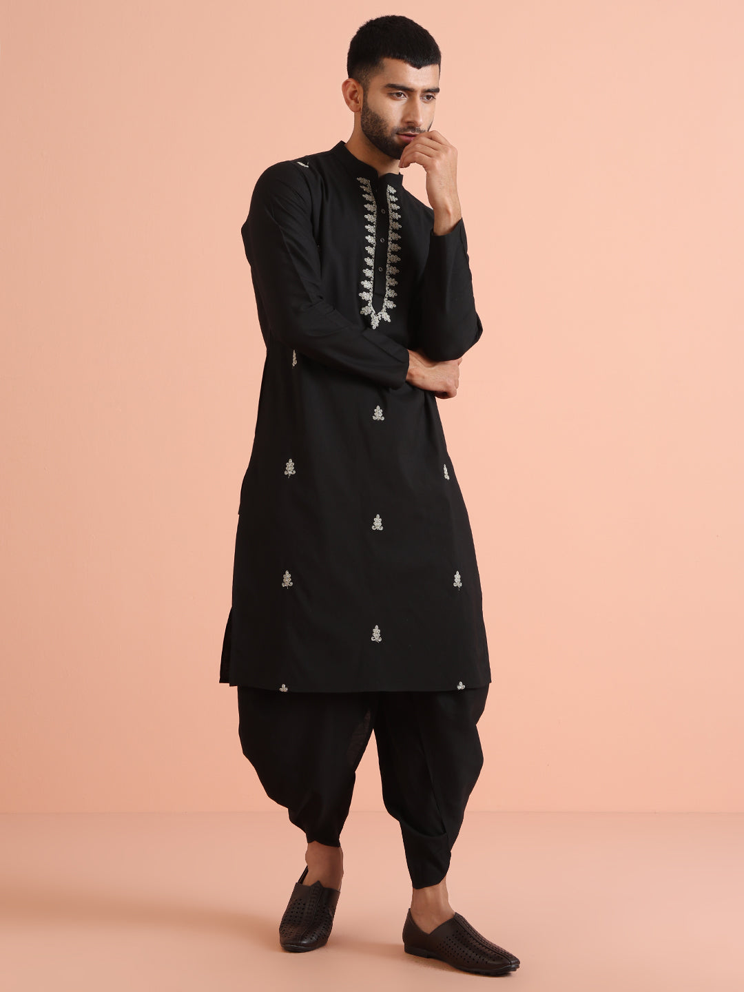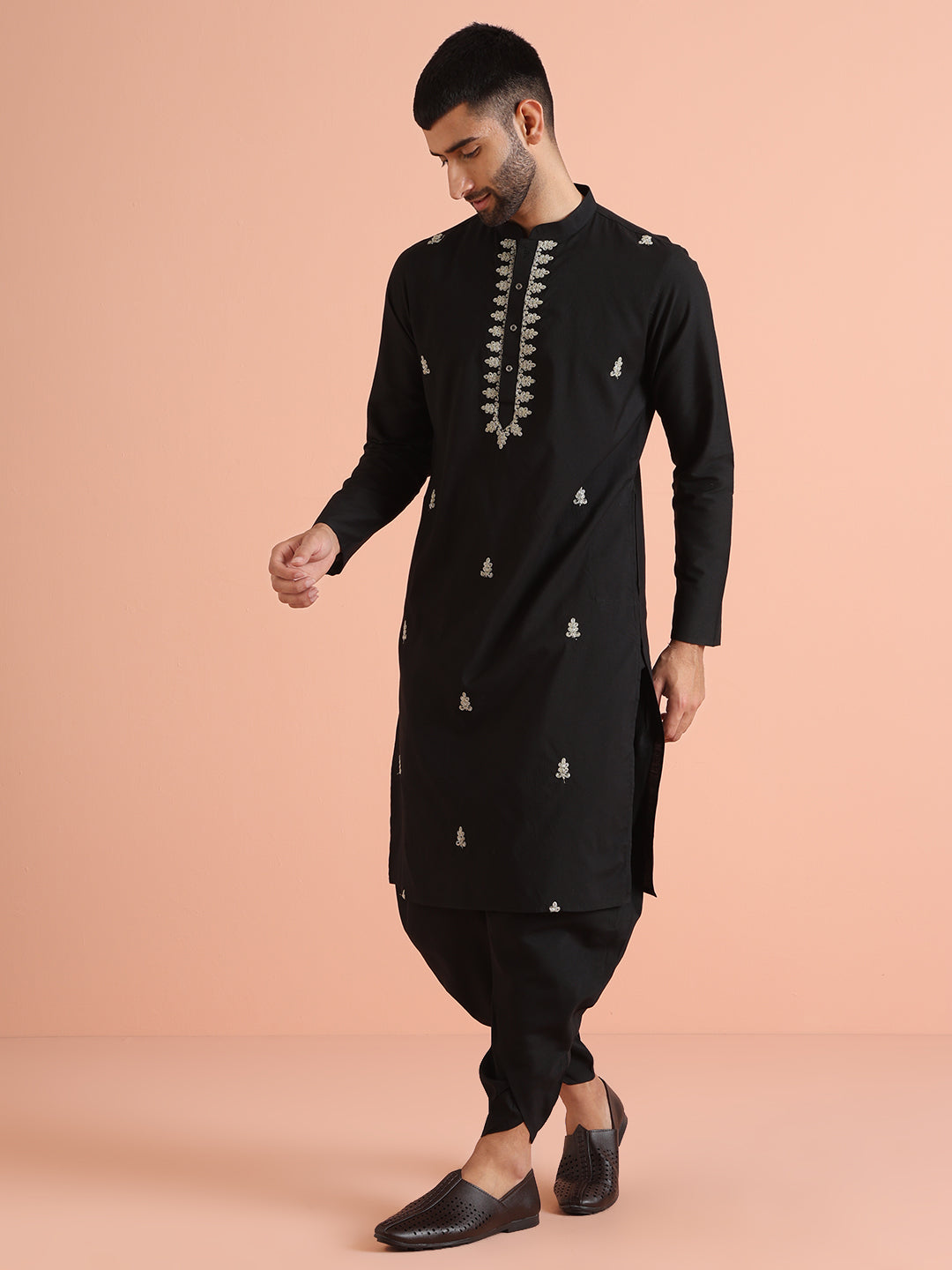 Black Cotton Blend Kurta Dhoti Set with intricate embroidery, perfect for festive and traditional occasions. Comfortable fit and elegant design. Ideal for Eid festival.