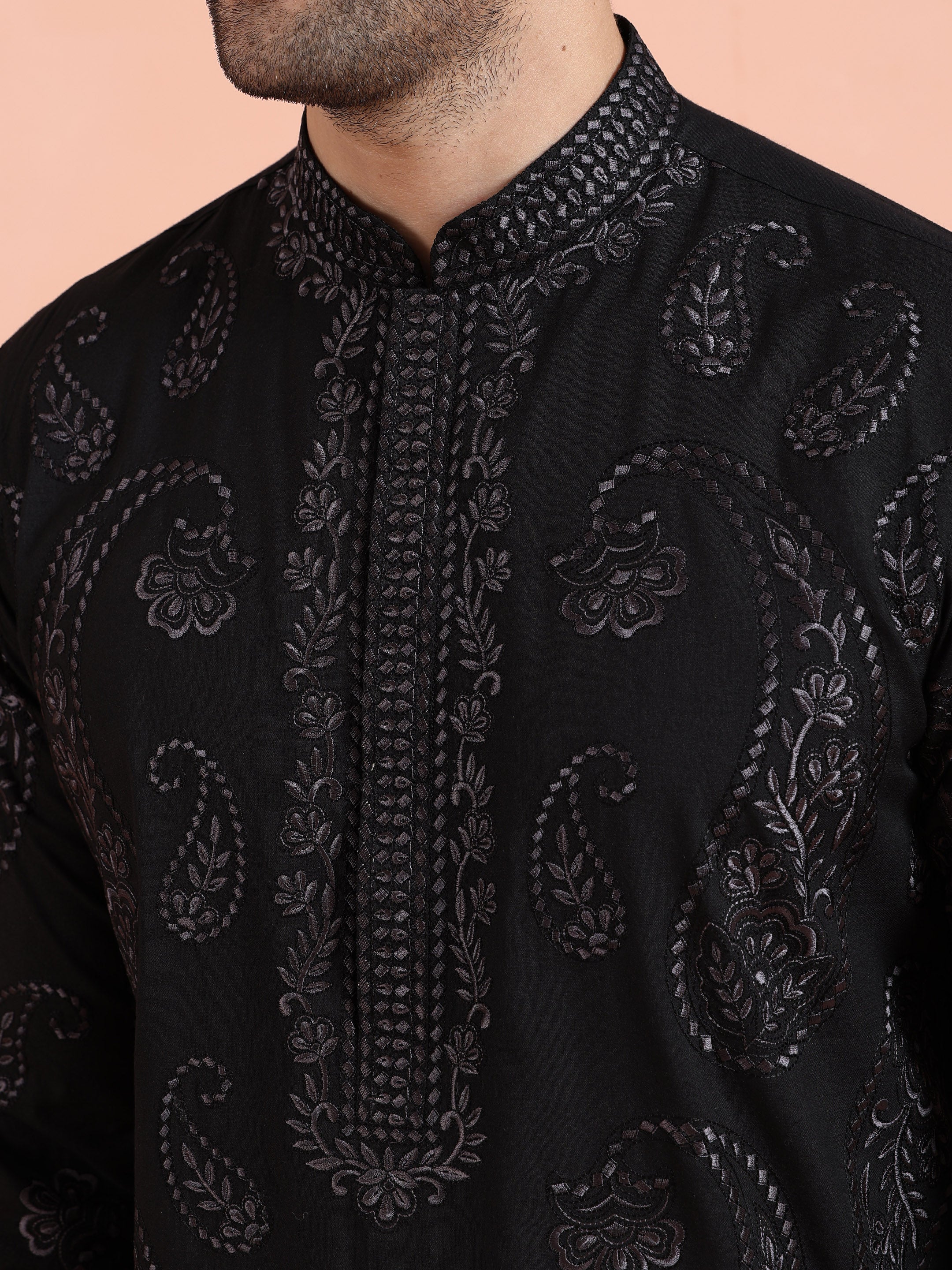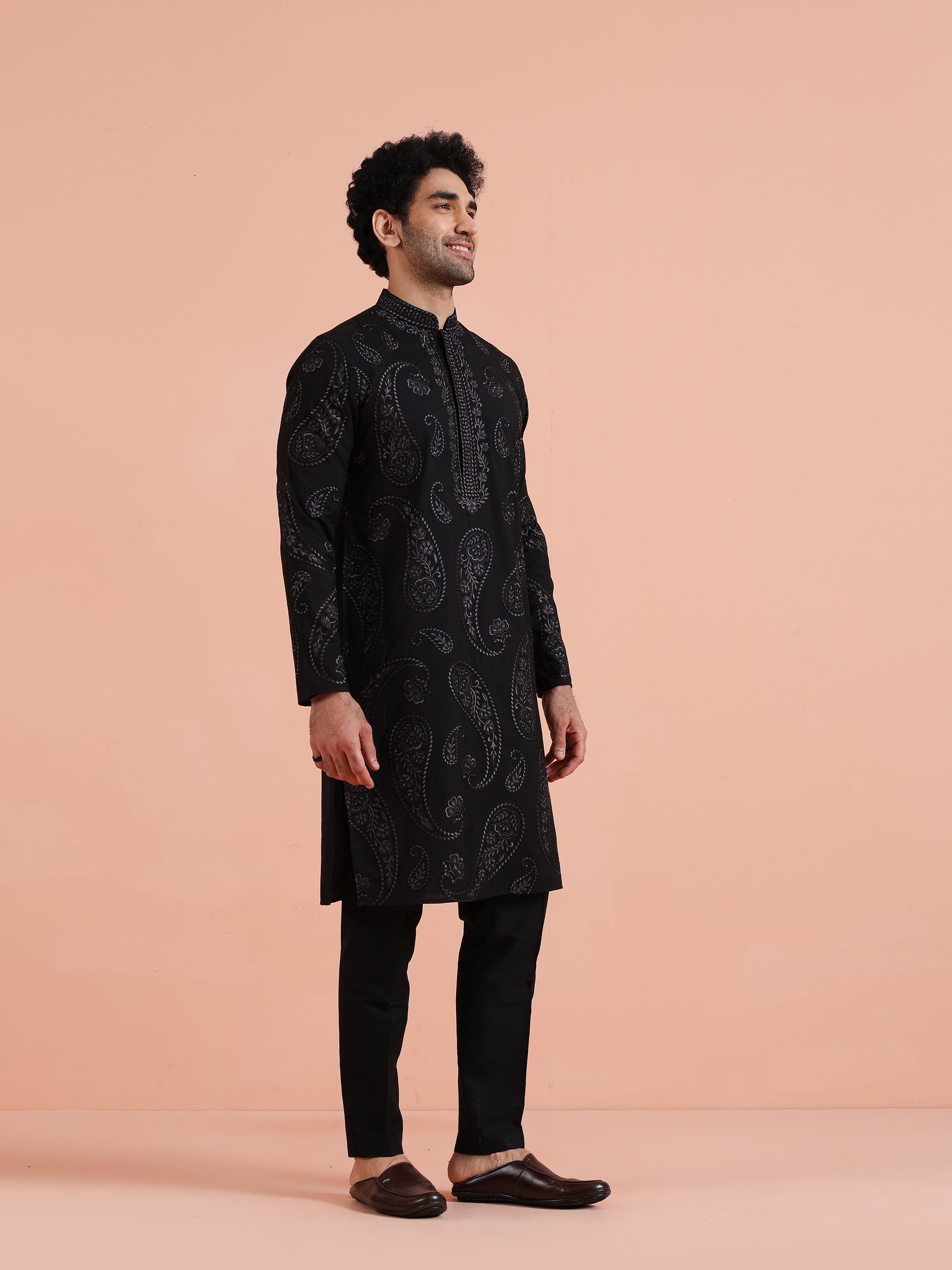 Black embroidered silk blend kurta for men. Features paisley motifs and long kurta design, perfect for weddings, festive & reception occasions.