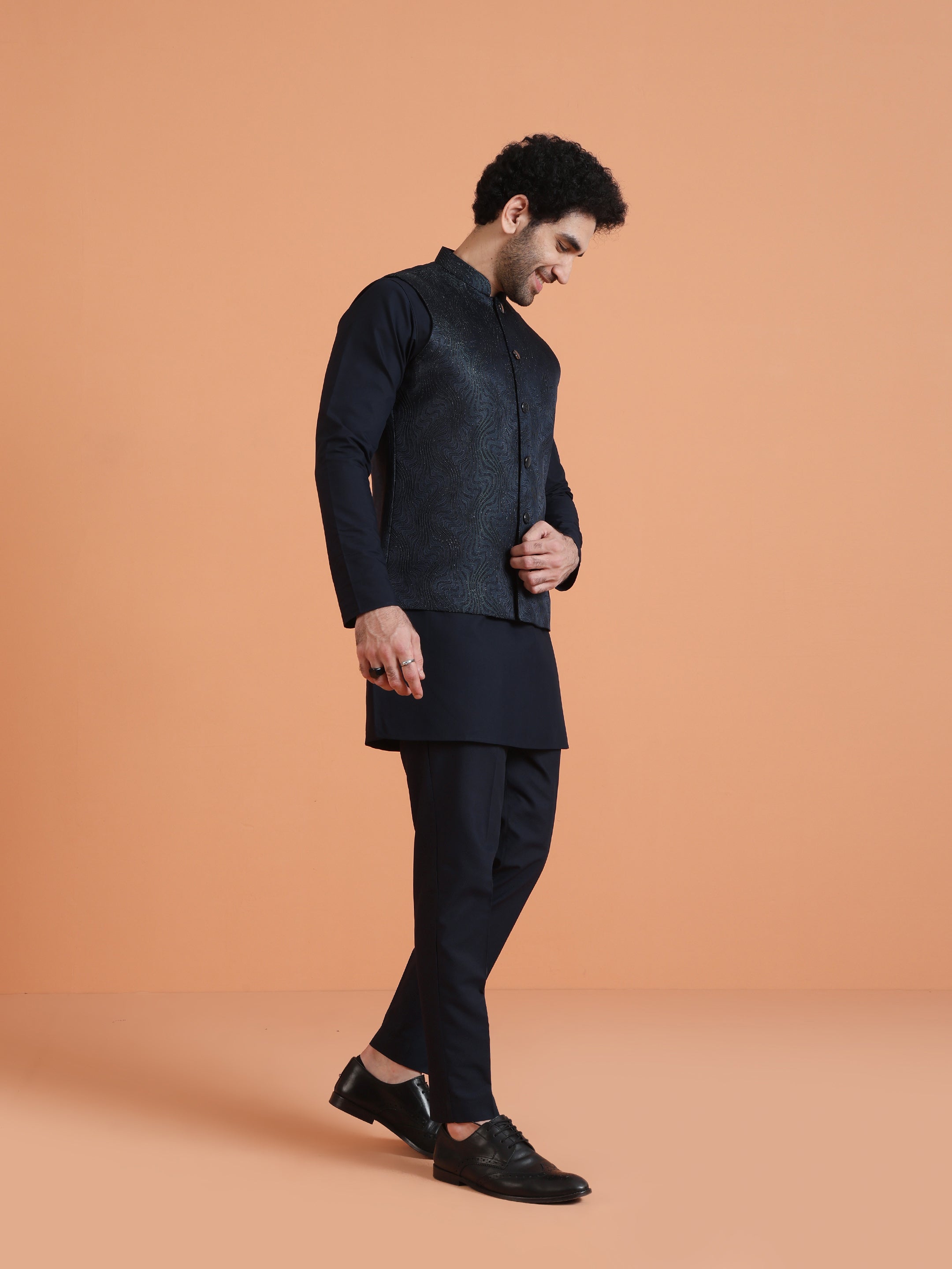 Kisah blue cotton silk Nehru jacket with metallic textured finish. Elegant sleeveless jacket ideal for layering at weddings, receptions & festive events.
