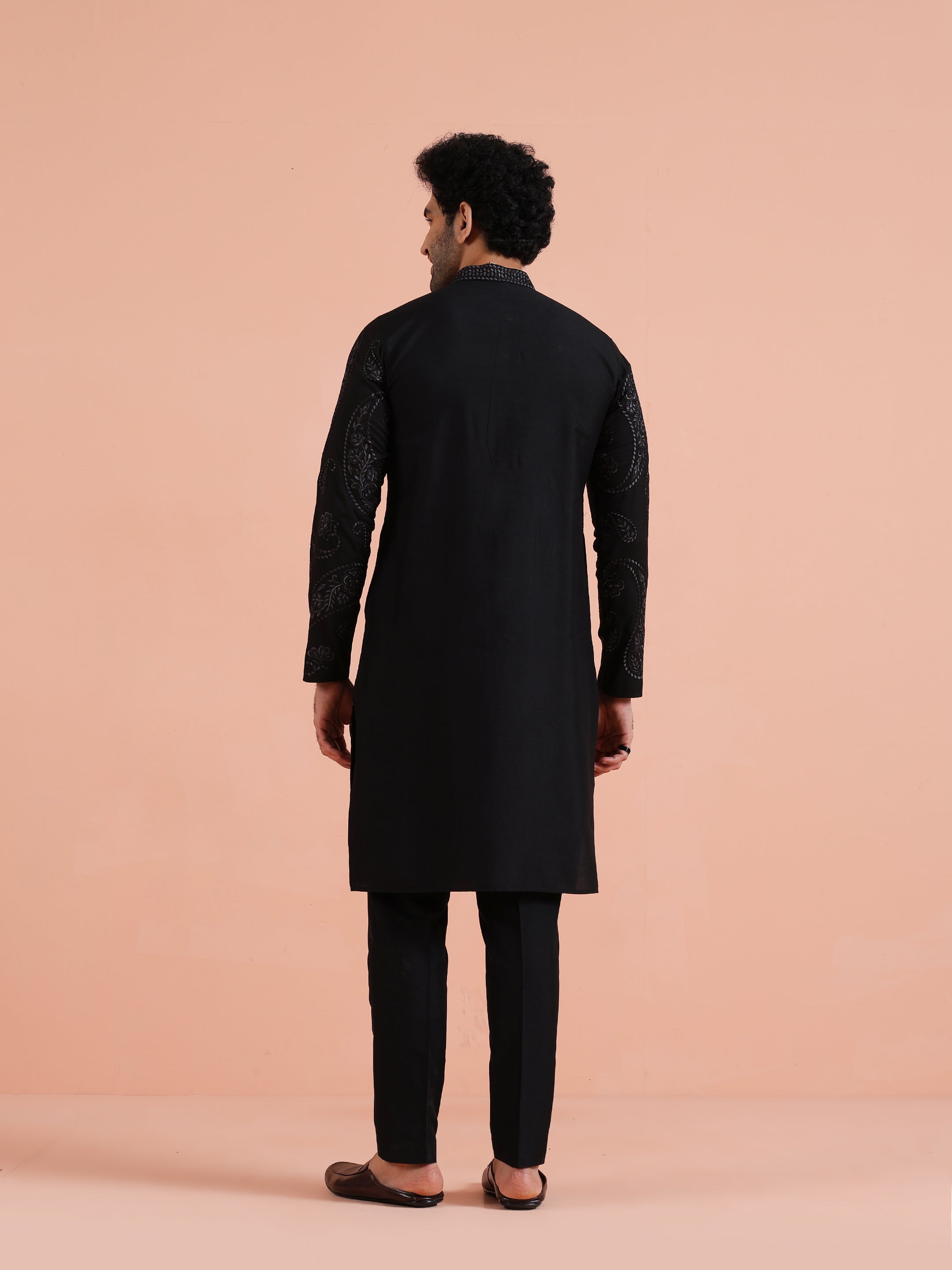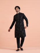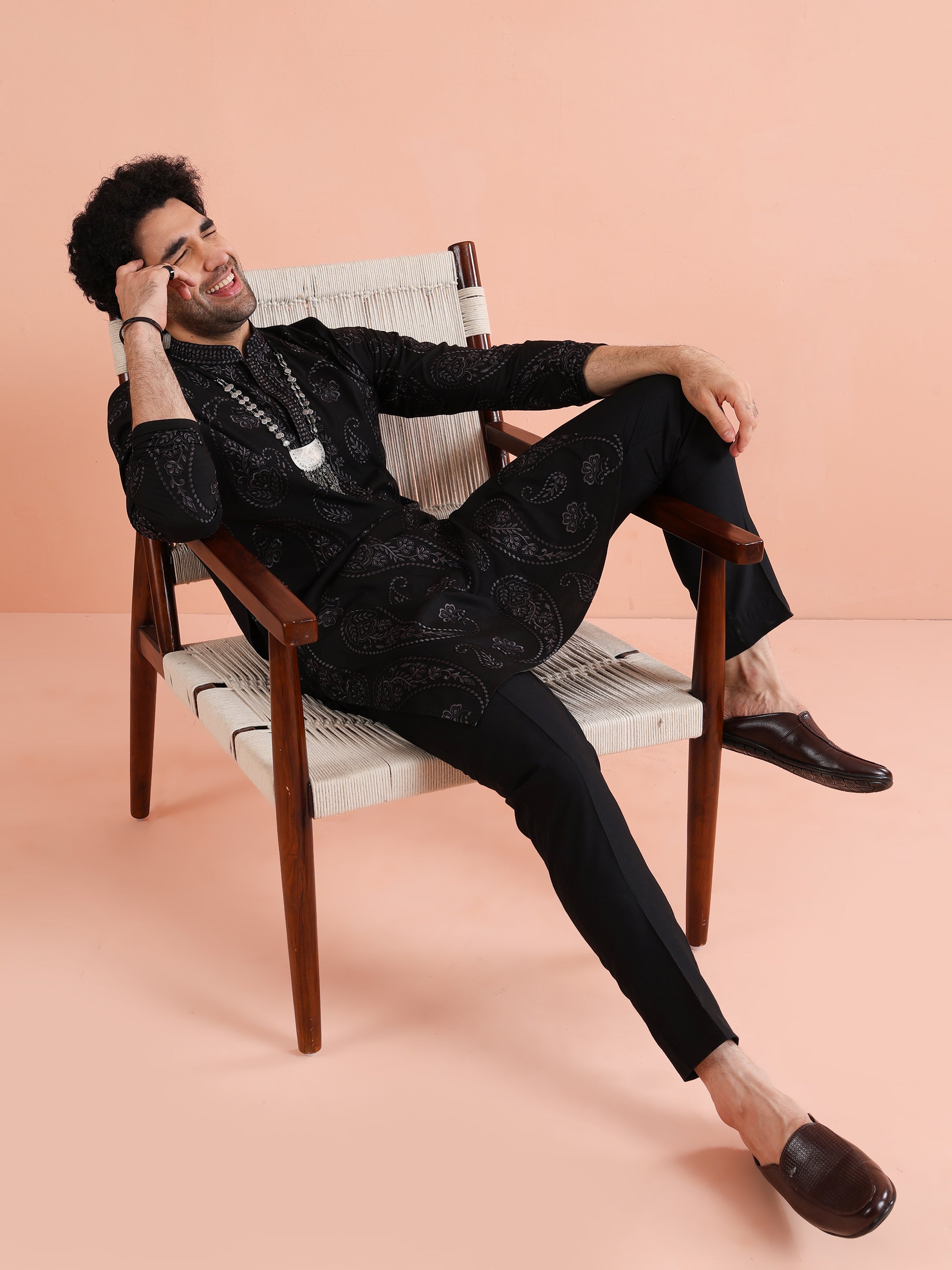 Black silk blend embroidered kurta trouser set for men with paisley motifs. Elegant festive outfit for weddings, receptions & cultural events.