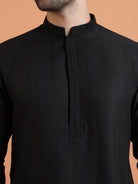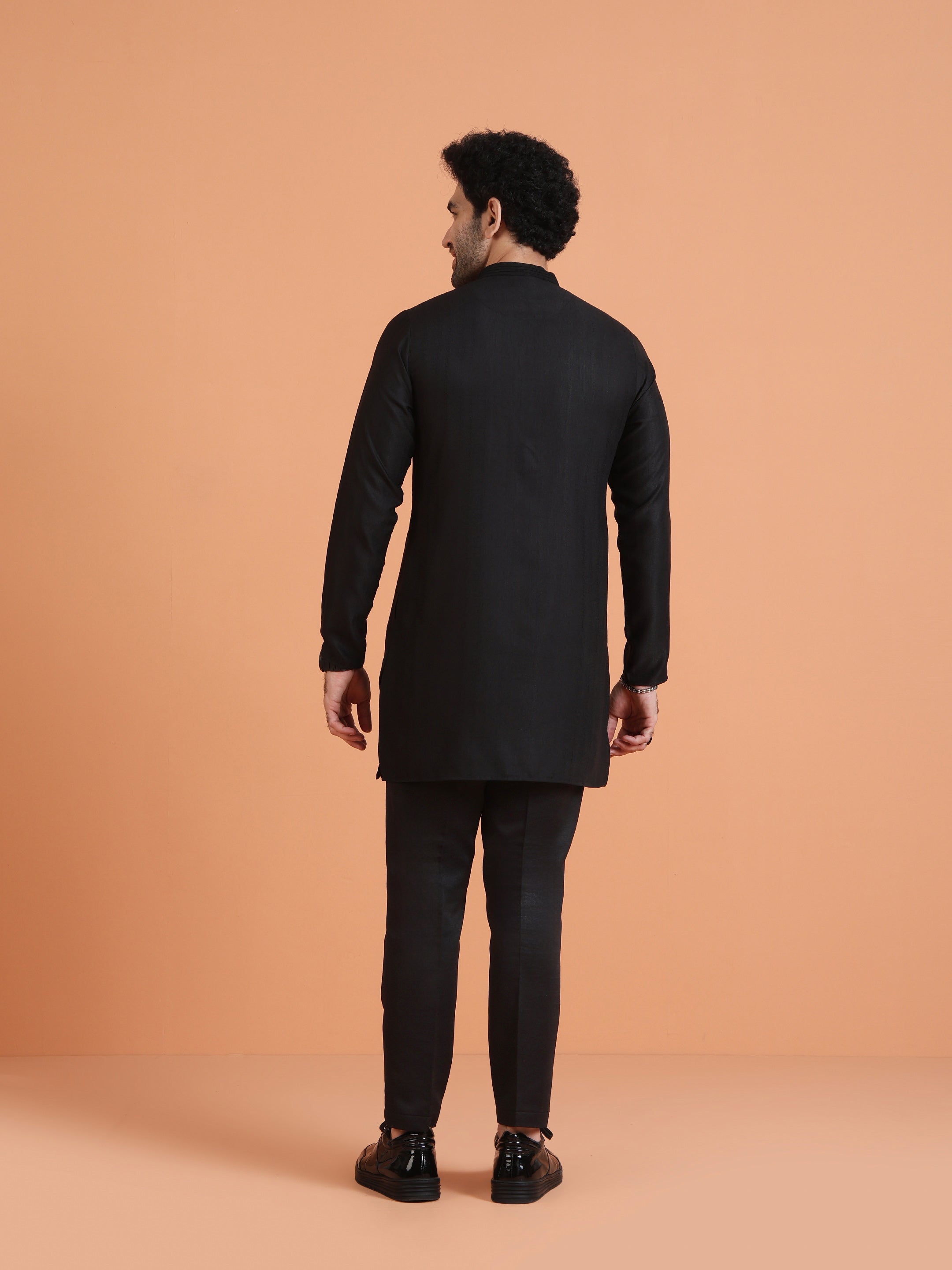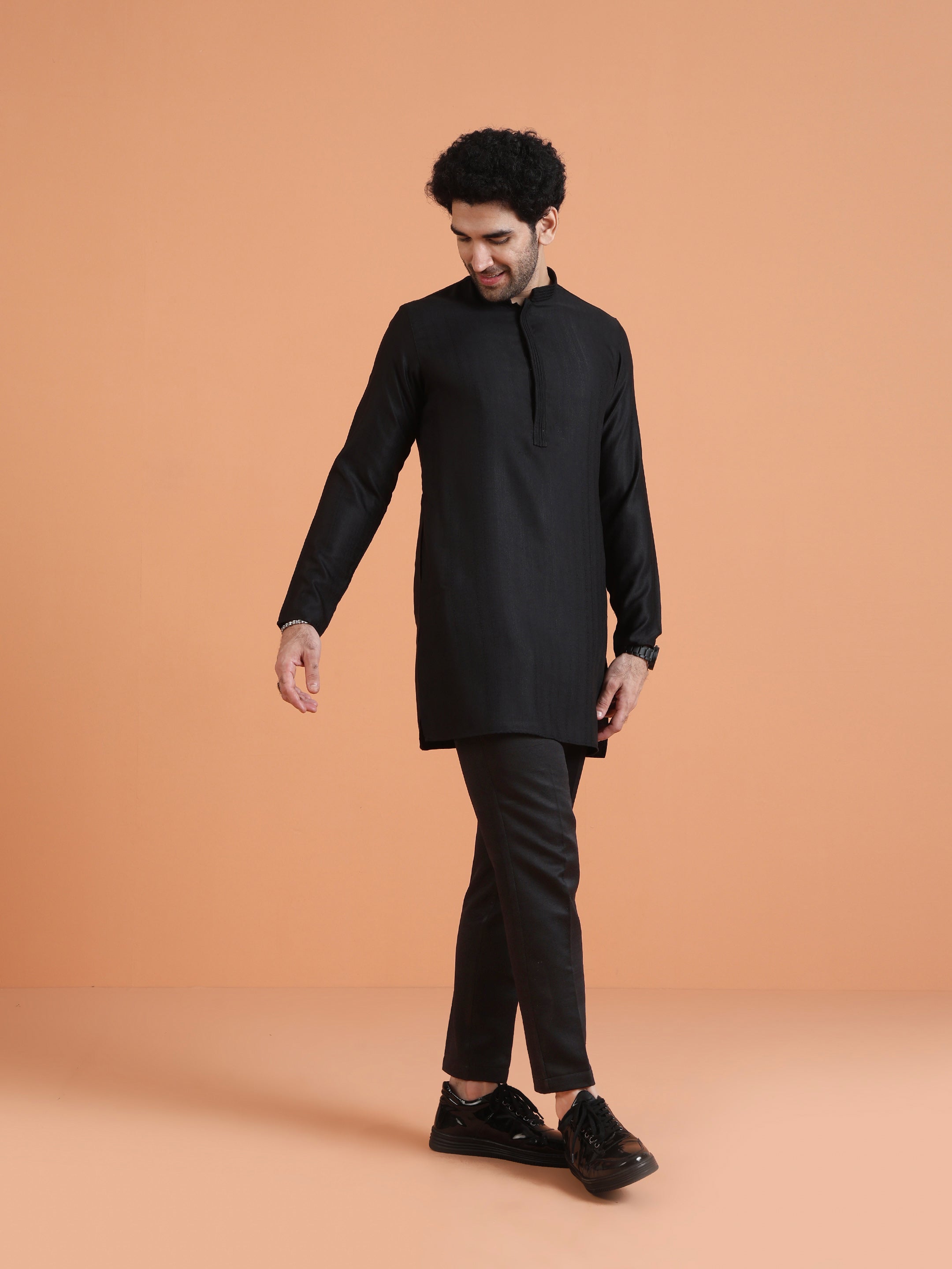 Black silk blend mid kurta with solid textured design, perfect for weddings, festive wear, and traditional celebrations.