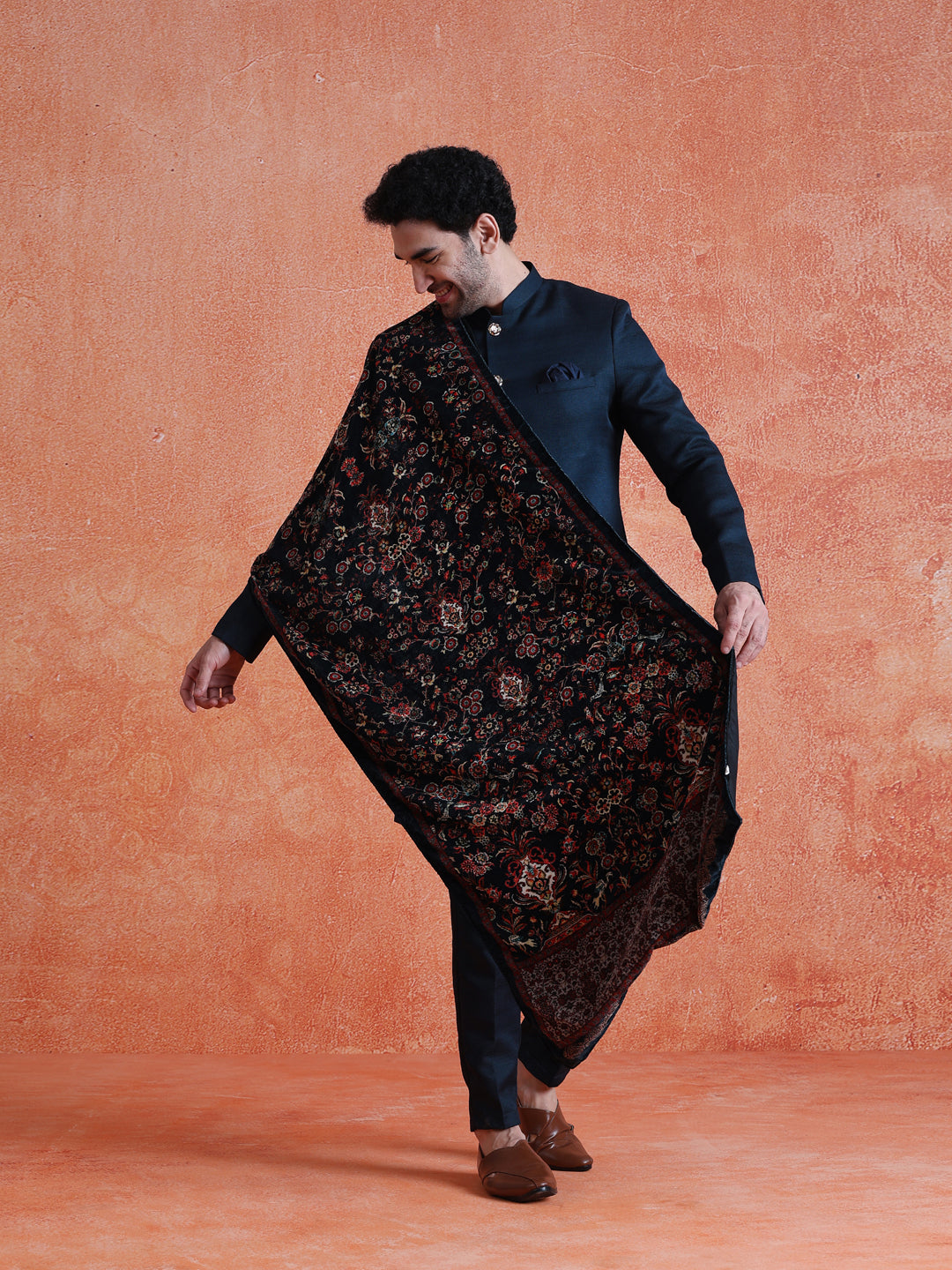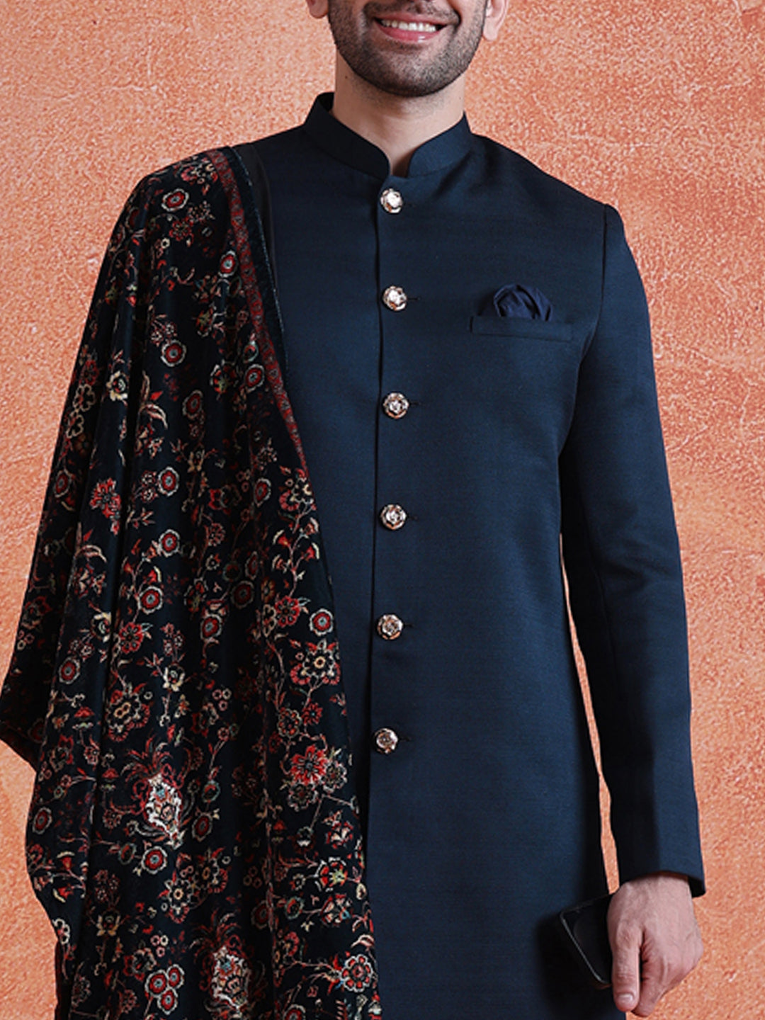 Elegant Sherwani Trouser Set With Dupatta in Blue Polyviscose fabric. Perfect for weddings and festive occasions with intricate velvet dupatta detailing.