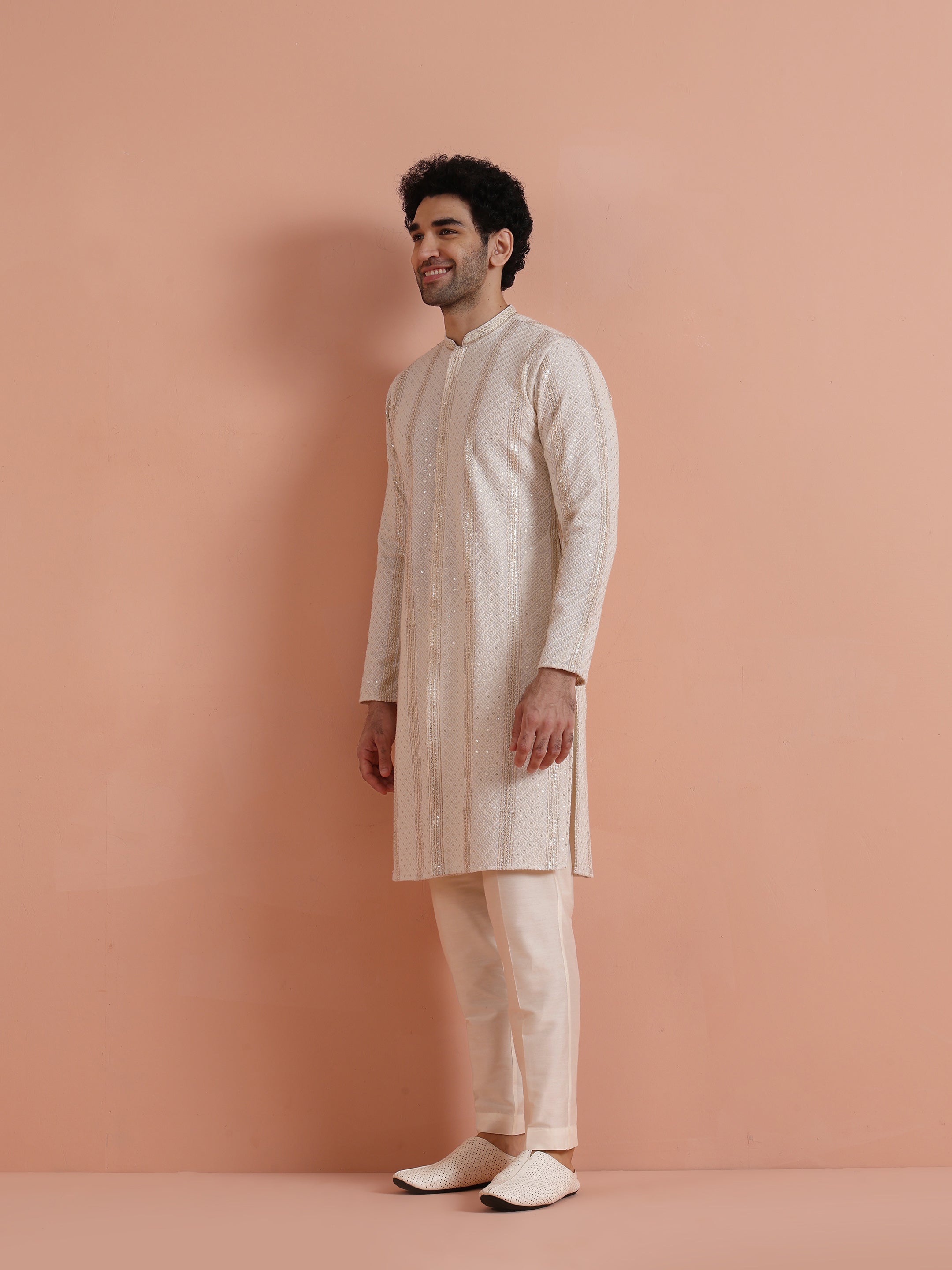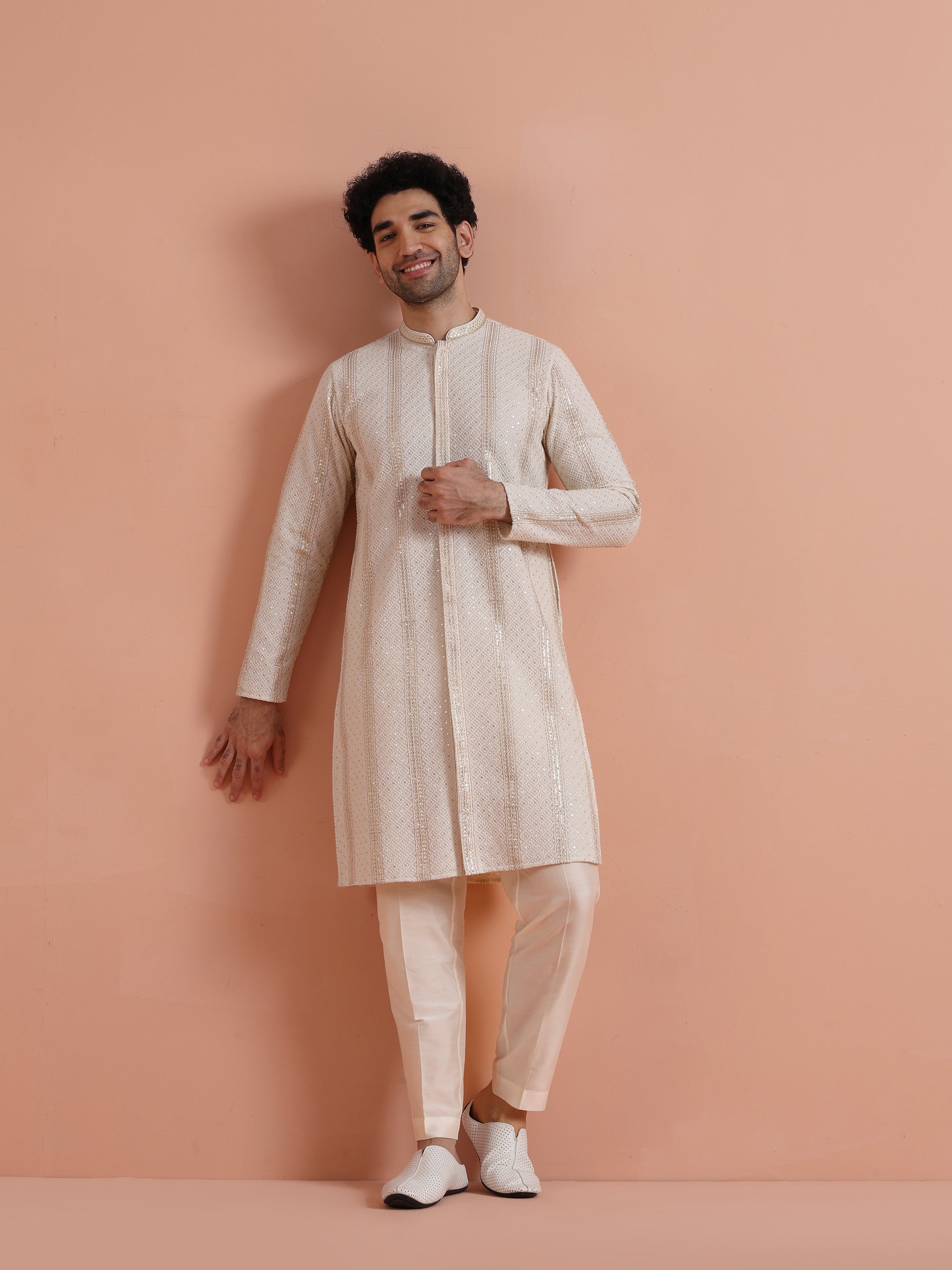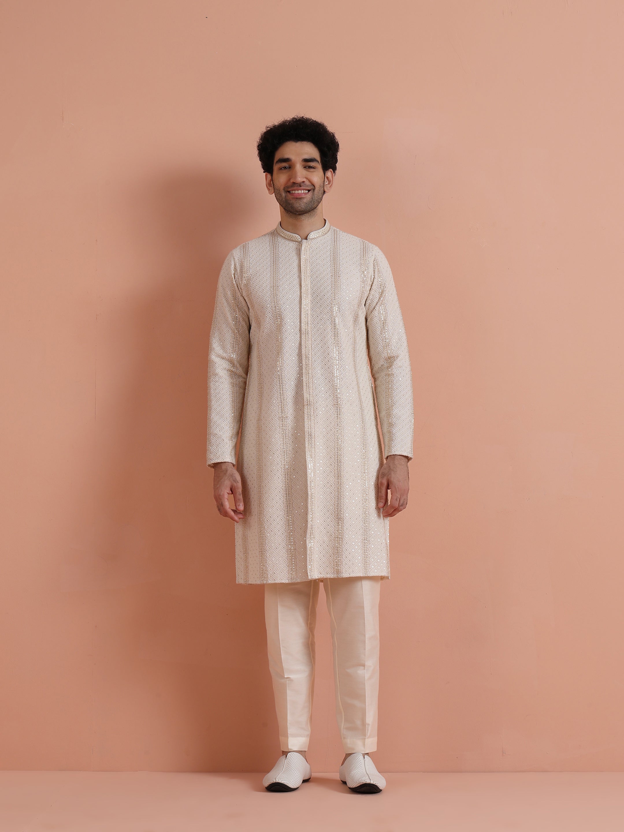 Cream georgette embroidered sequin kurta with cream trouser elegant ethnic kurta set for men, perfect for weddings, receptions, and festive celebrations.