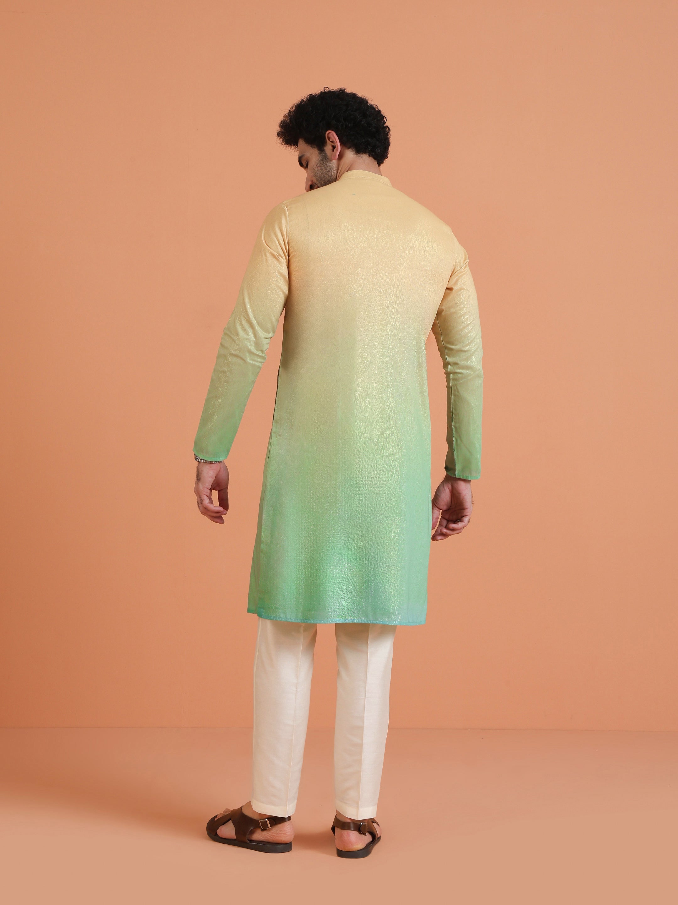Kisah Yellow-Green Ombre Dyed Kurta with Cream Trouser Set in silk blend. Festive outfit with pockets, ideal for Haldi and wedding functions.