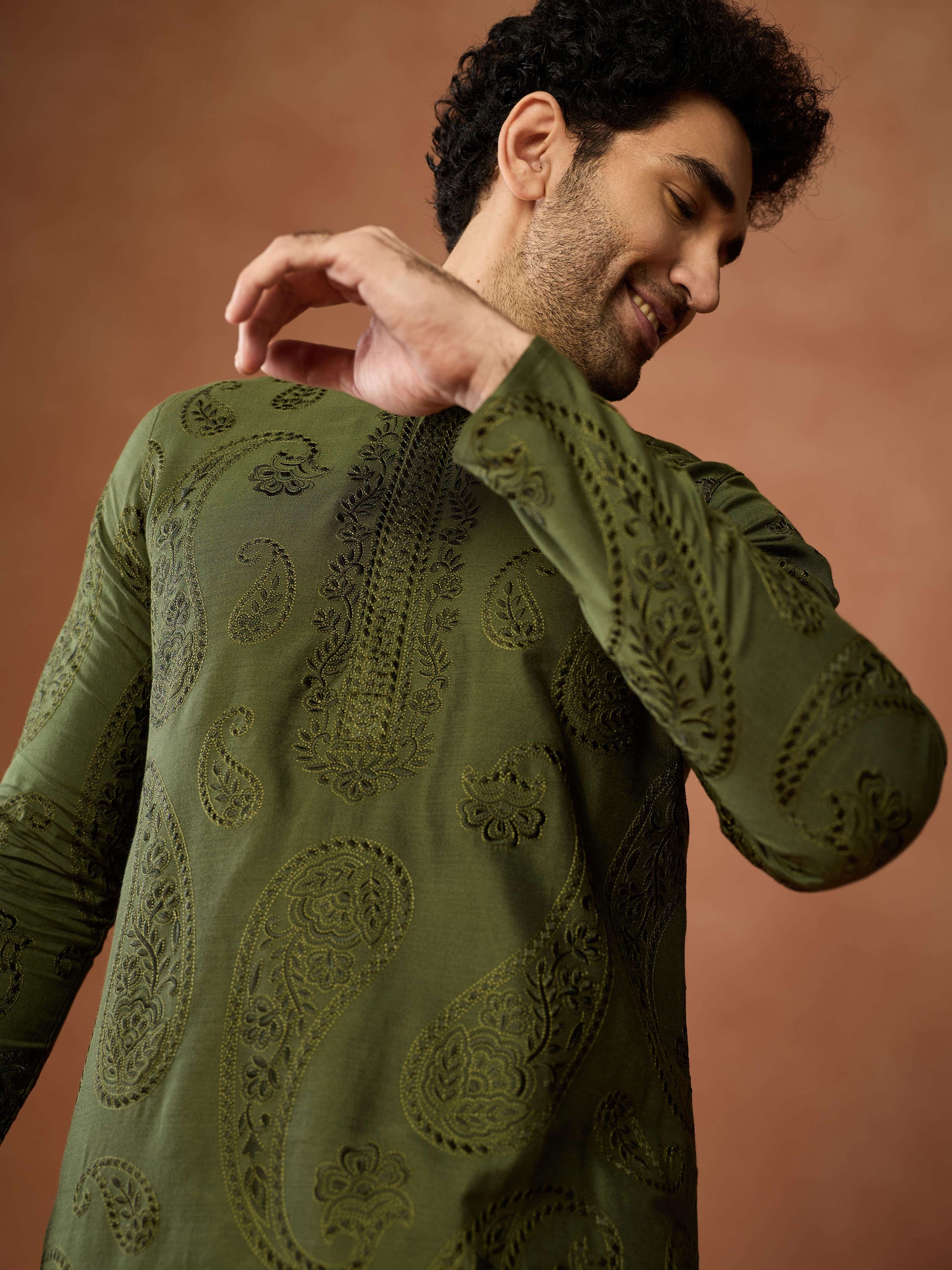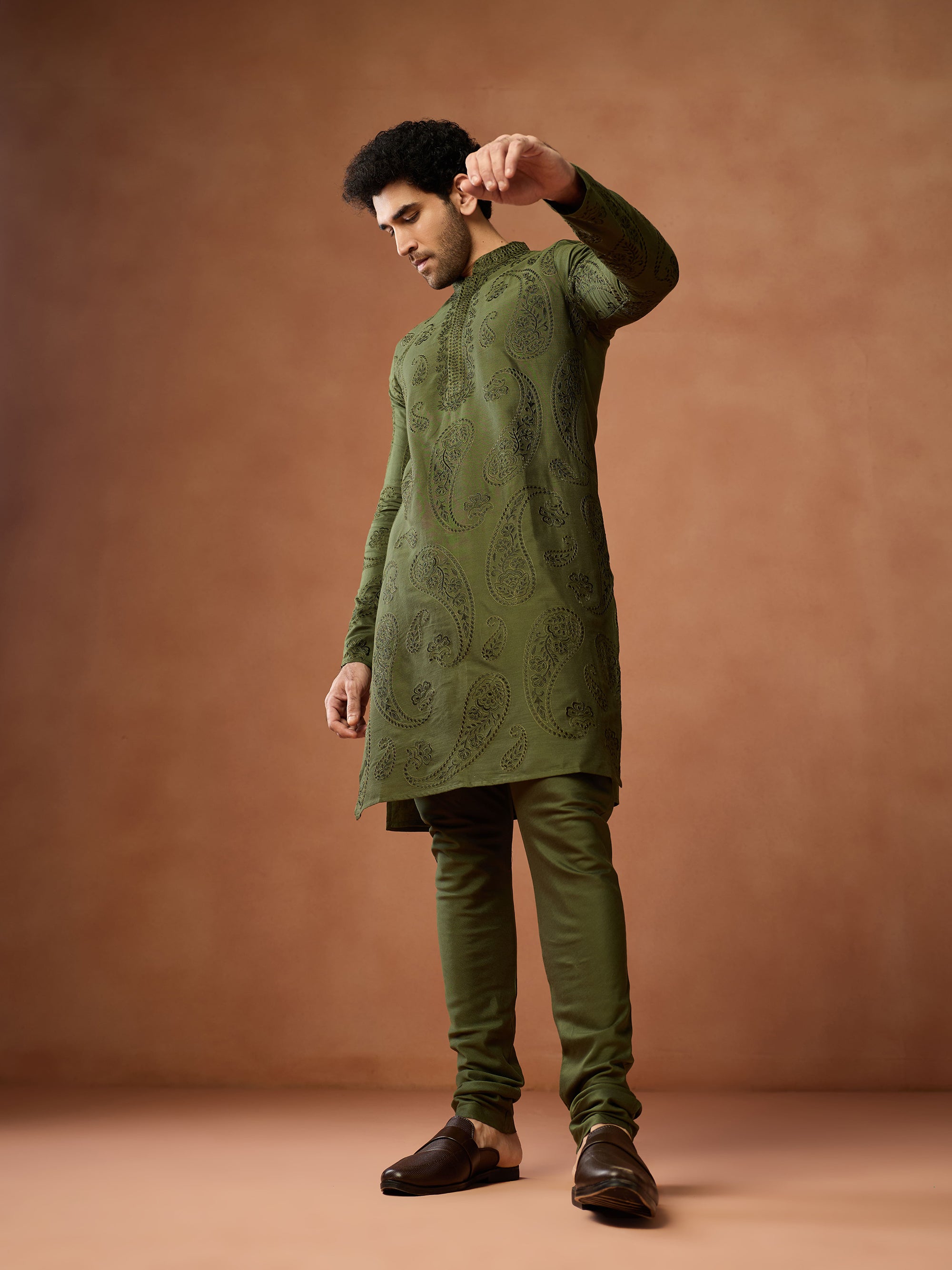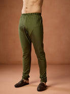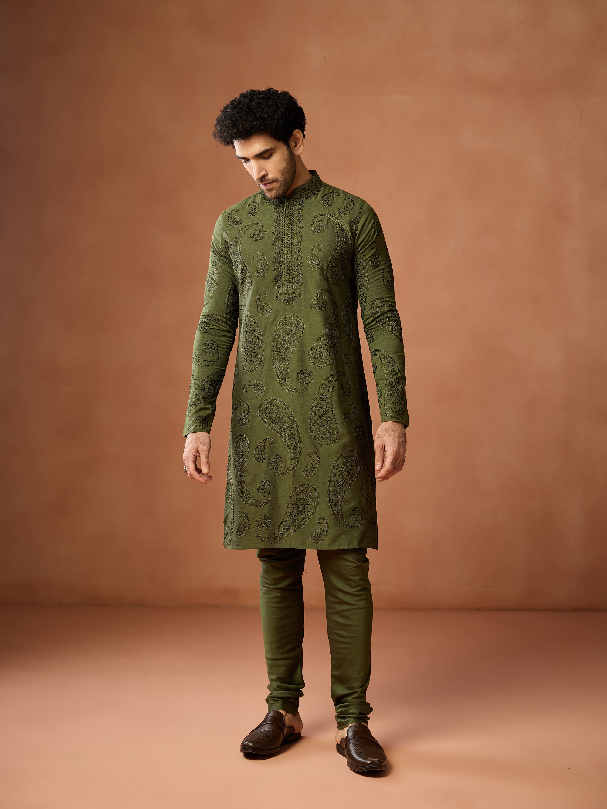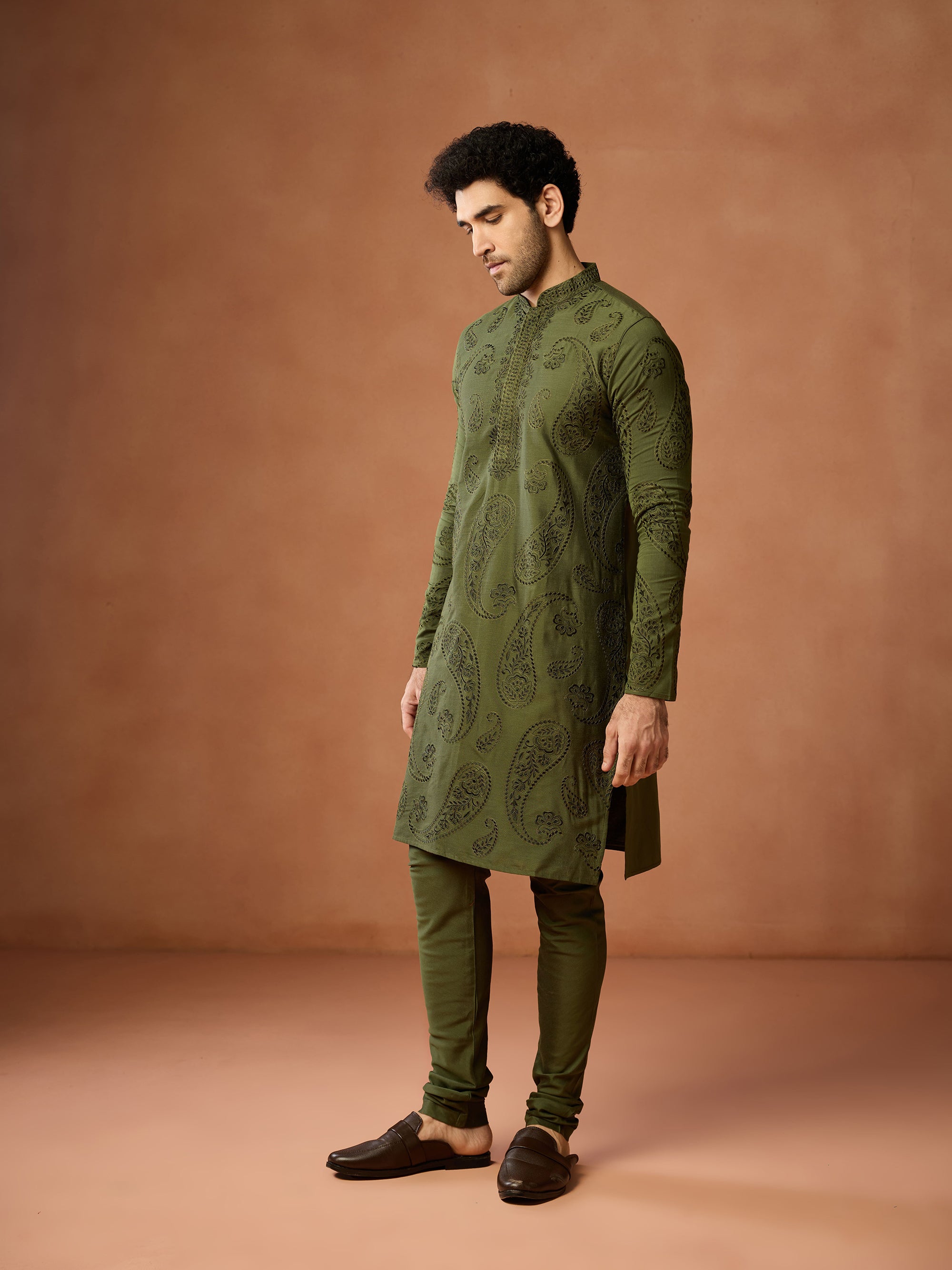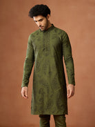 Green cotton embroidered kurta churidar set for men with paisley motifs. Elegant festive outfit for weddings, puja & traditional occasions.