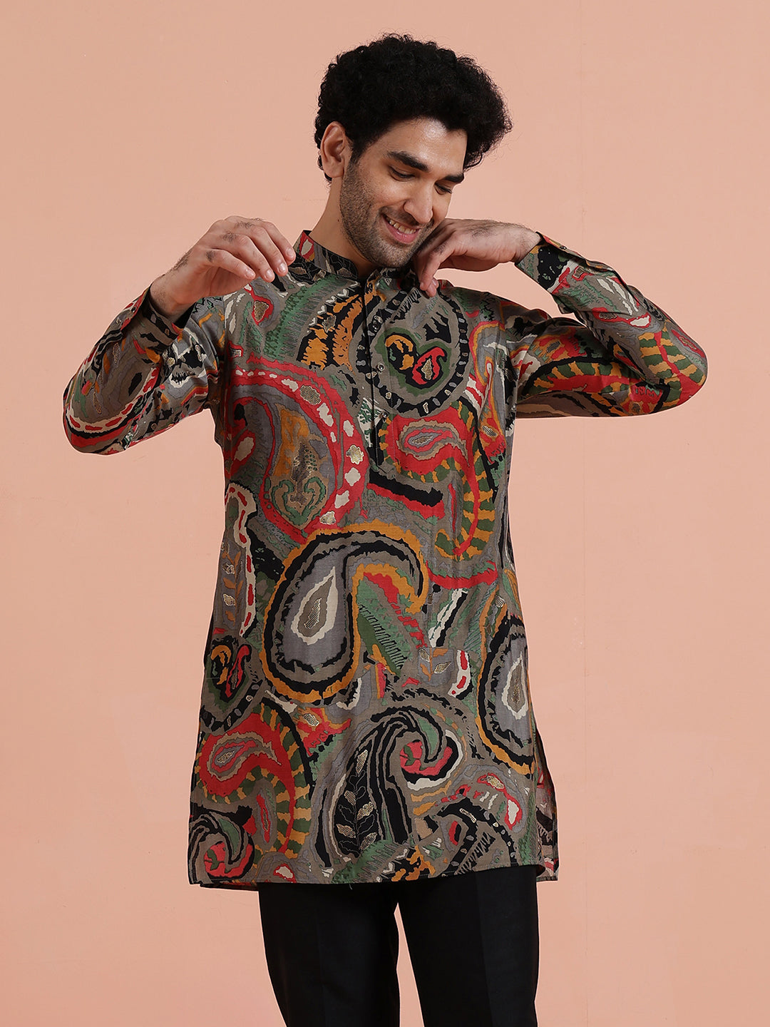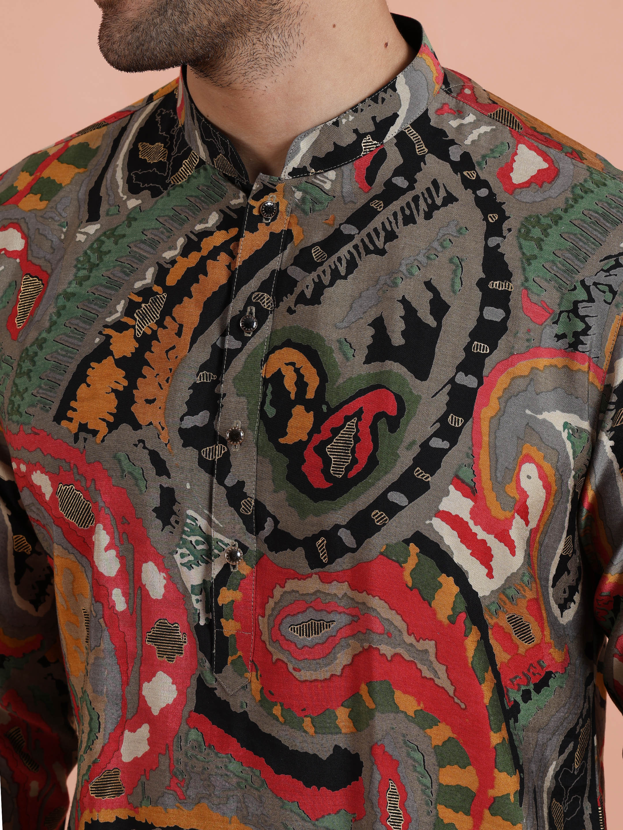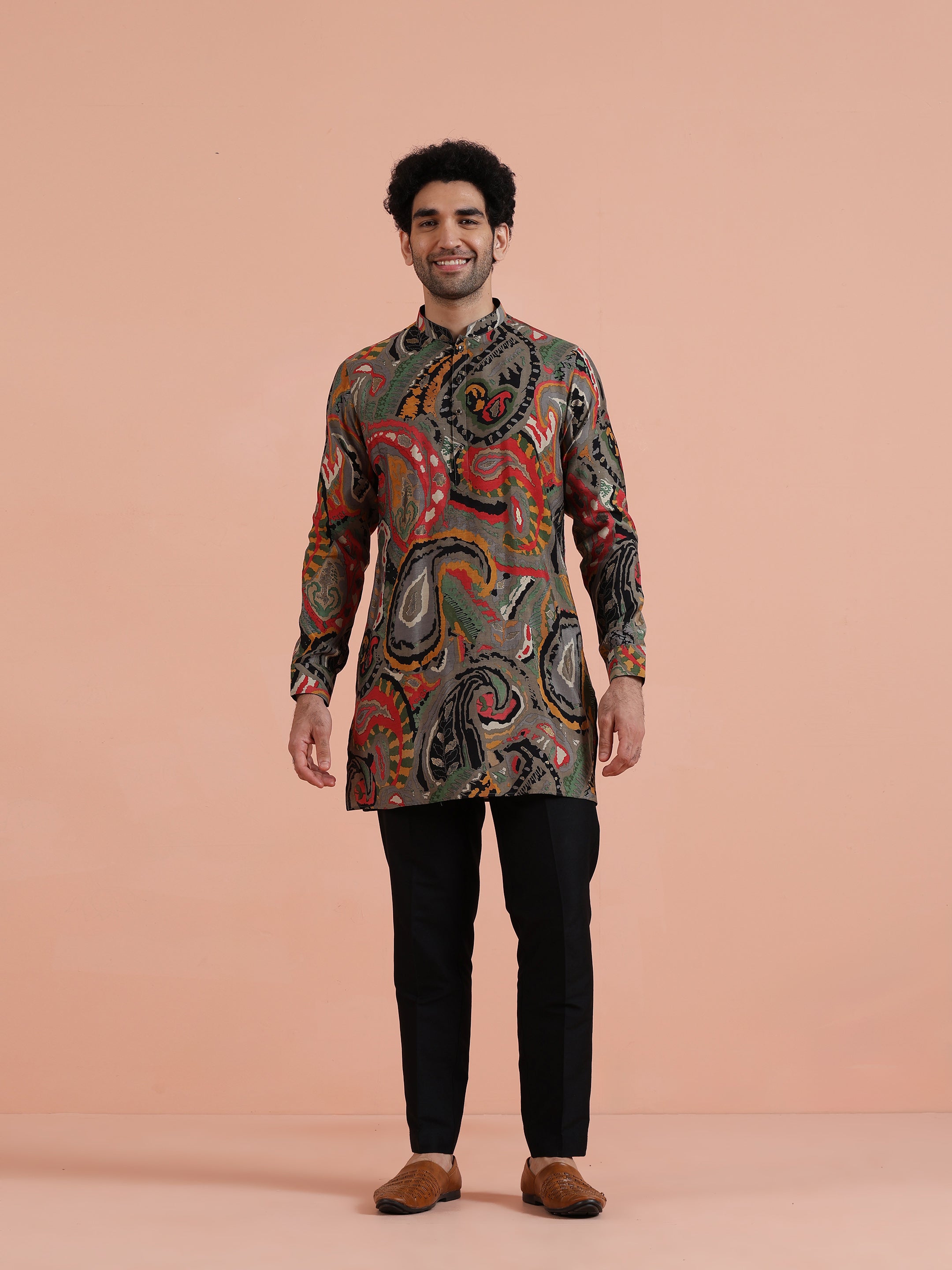Kisah Menss Multicolor Paisley Printed Kurta bold ethnic motifs with modern flair. Perfect festive kurta for weddings, parties, and cultural celebrations.