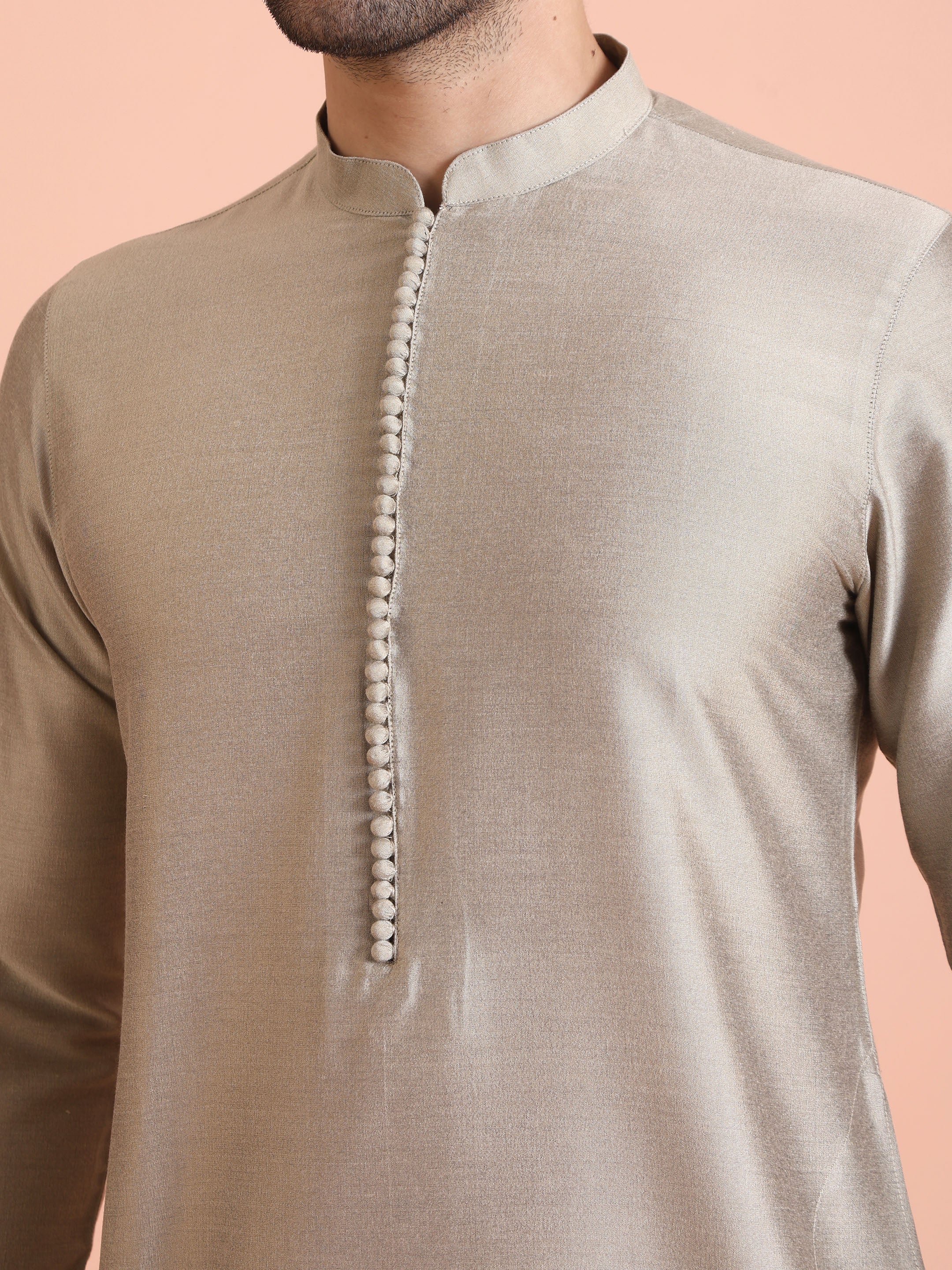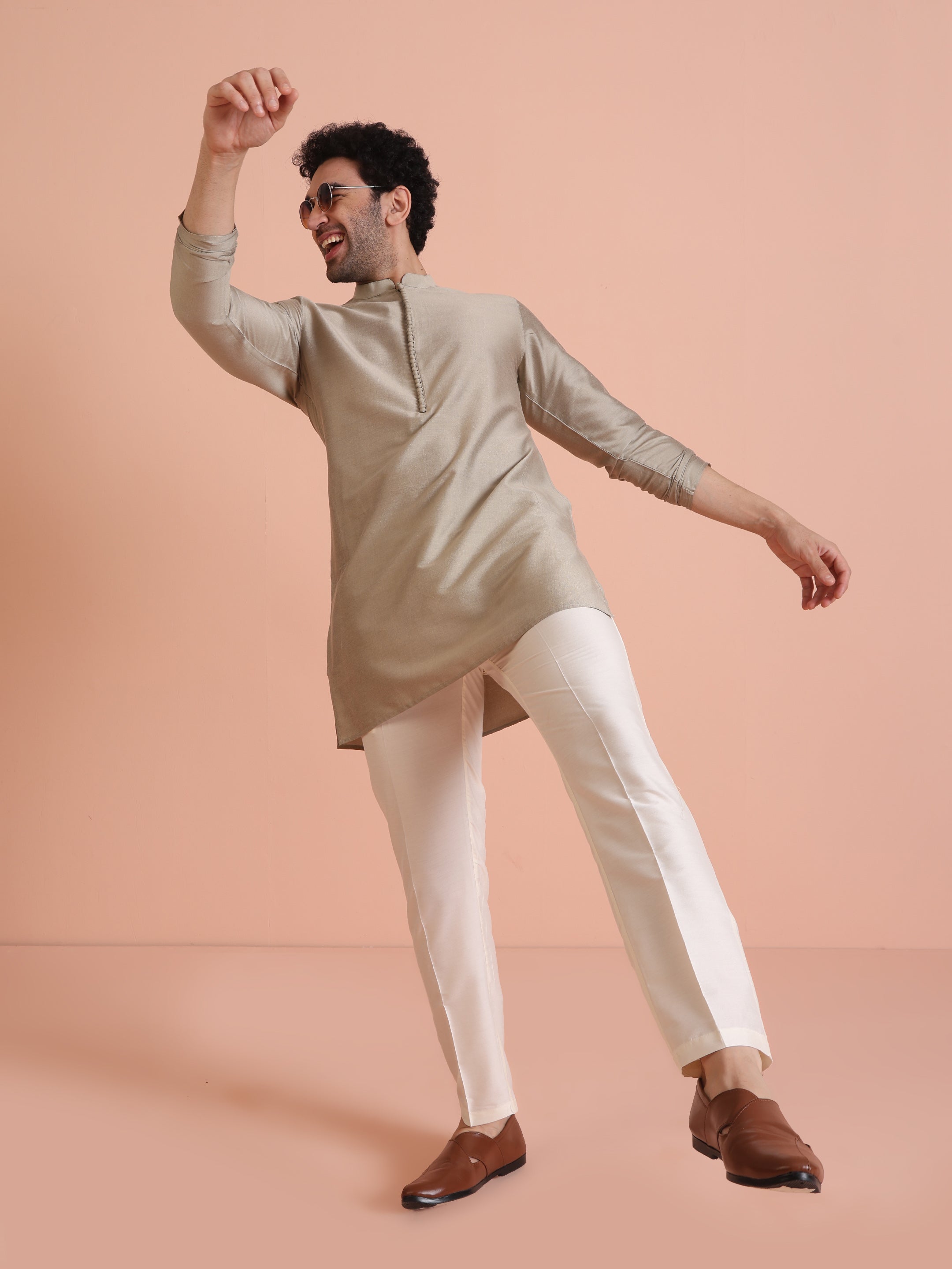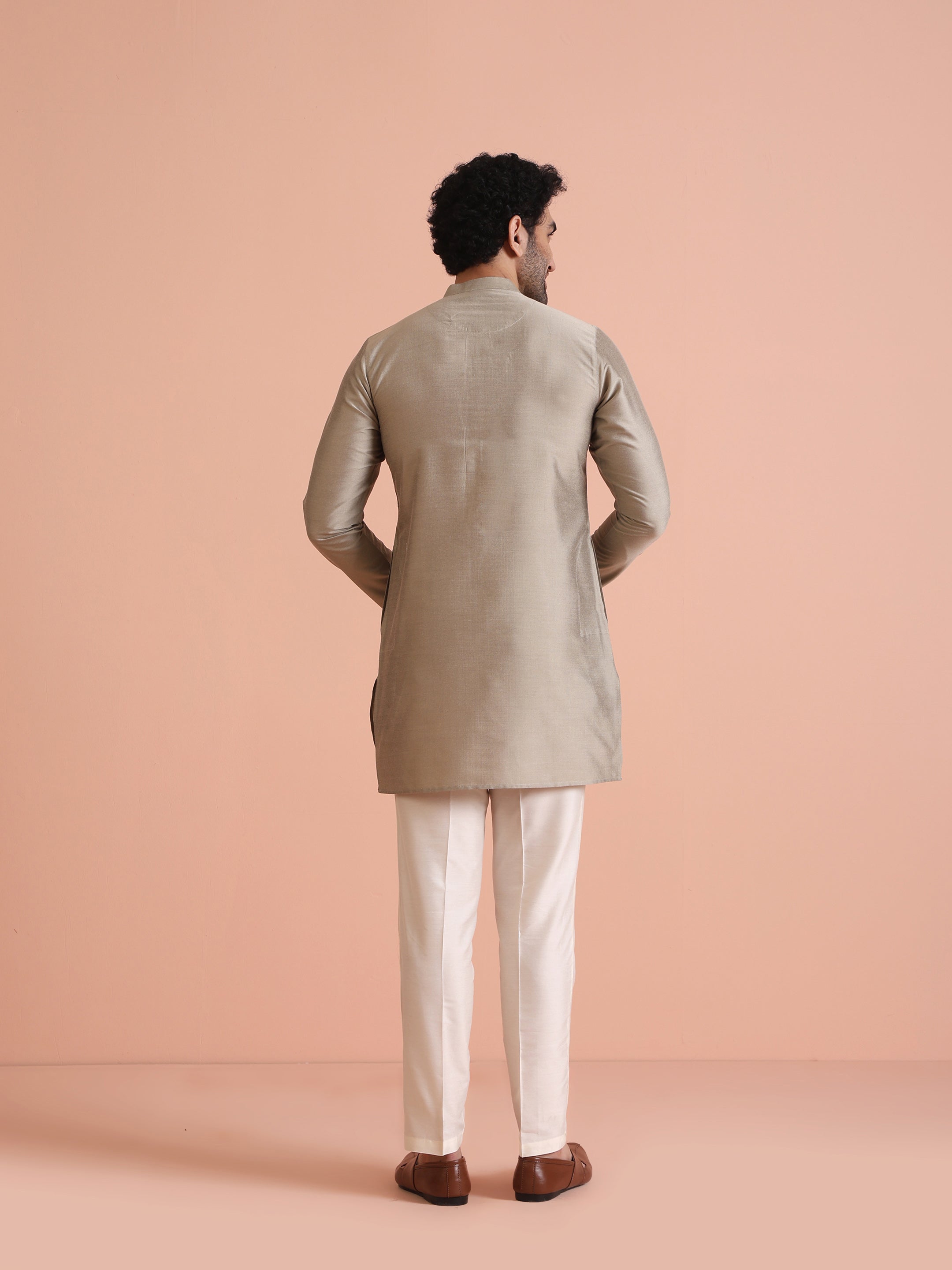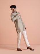 Grey poly silk solid kurta trouser set for men. Perfect blend of elegance and comfort for festive or semi-formal occasions.