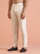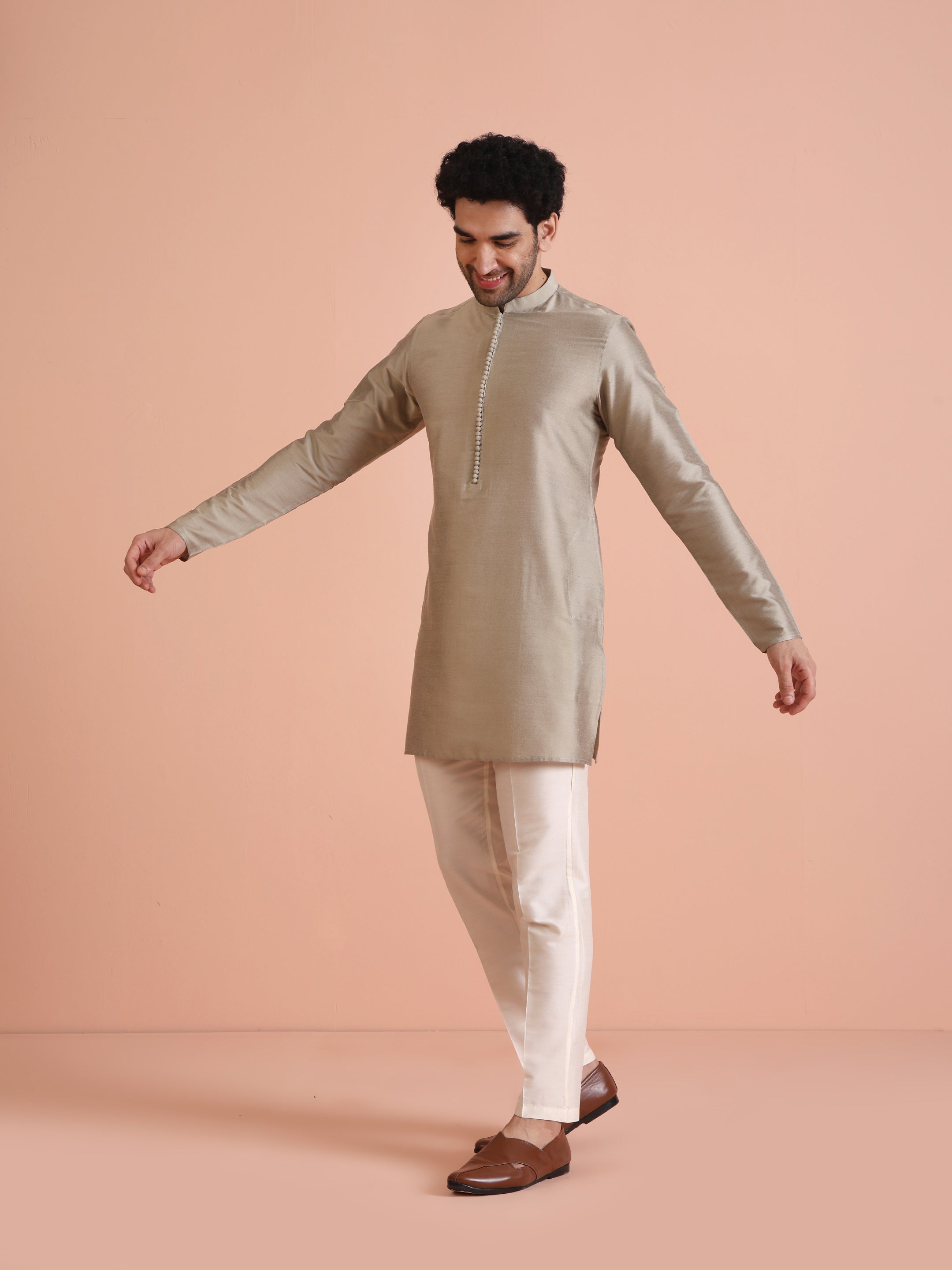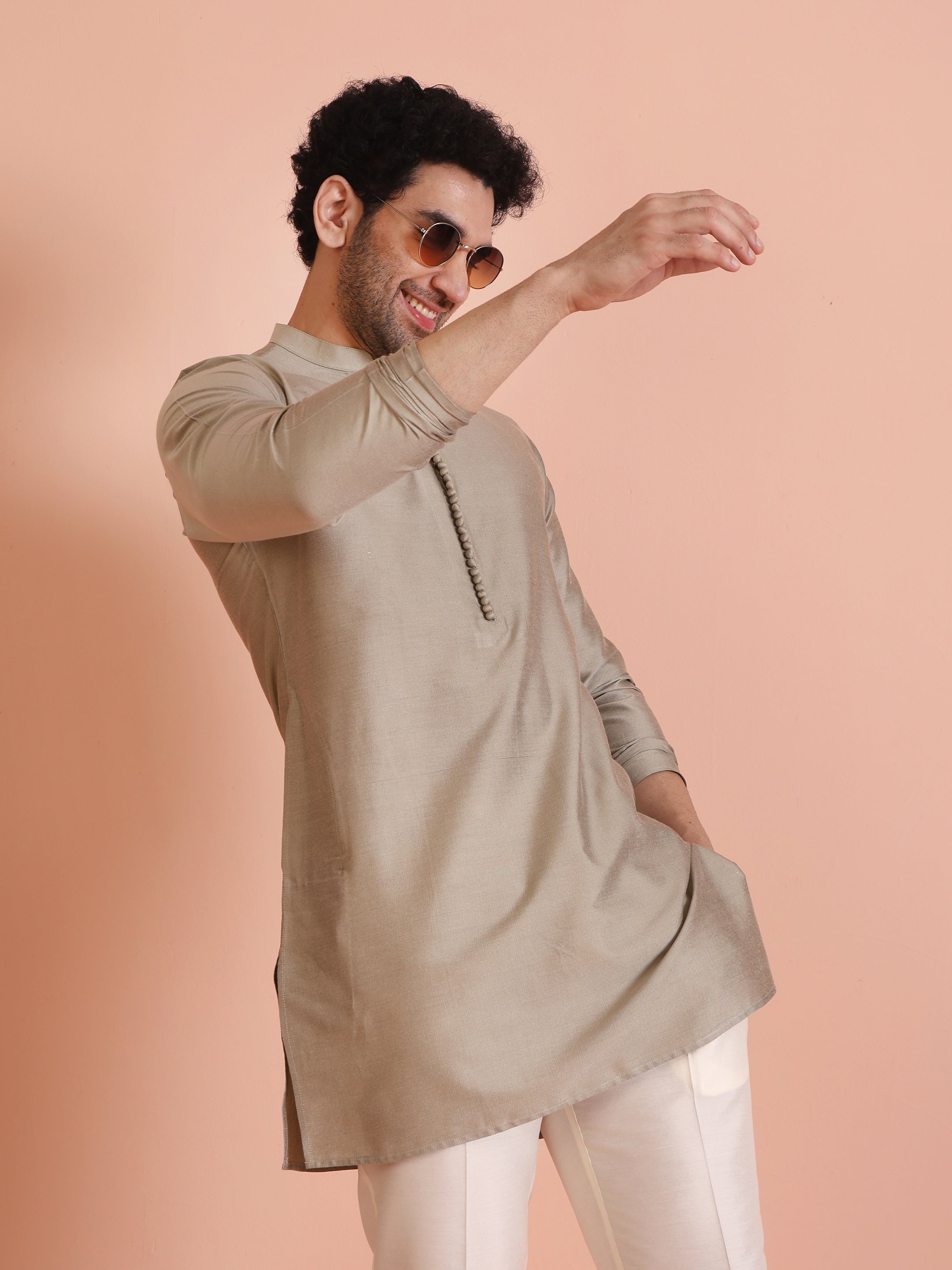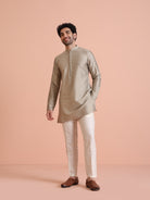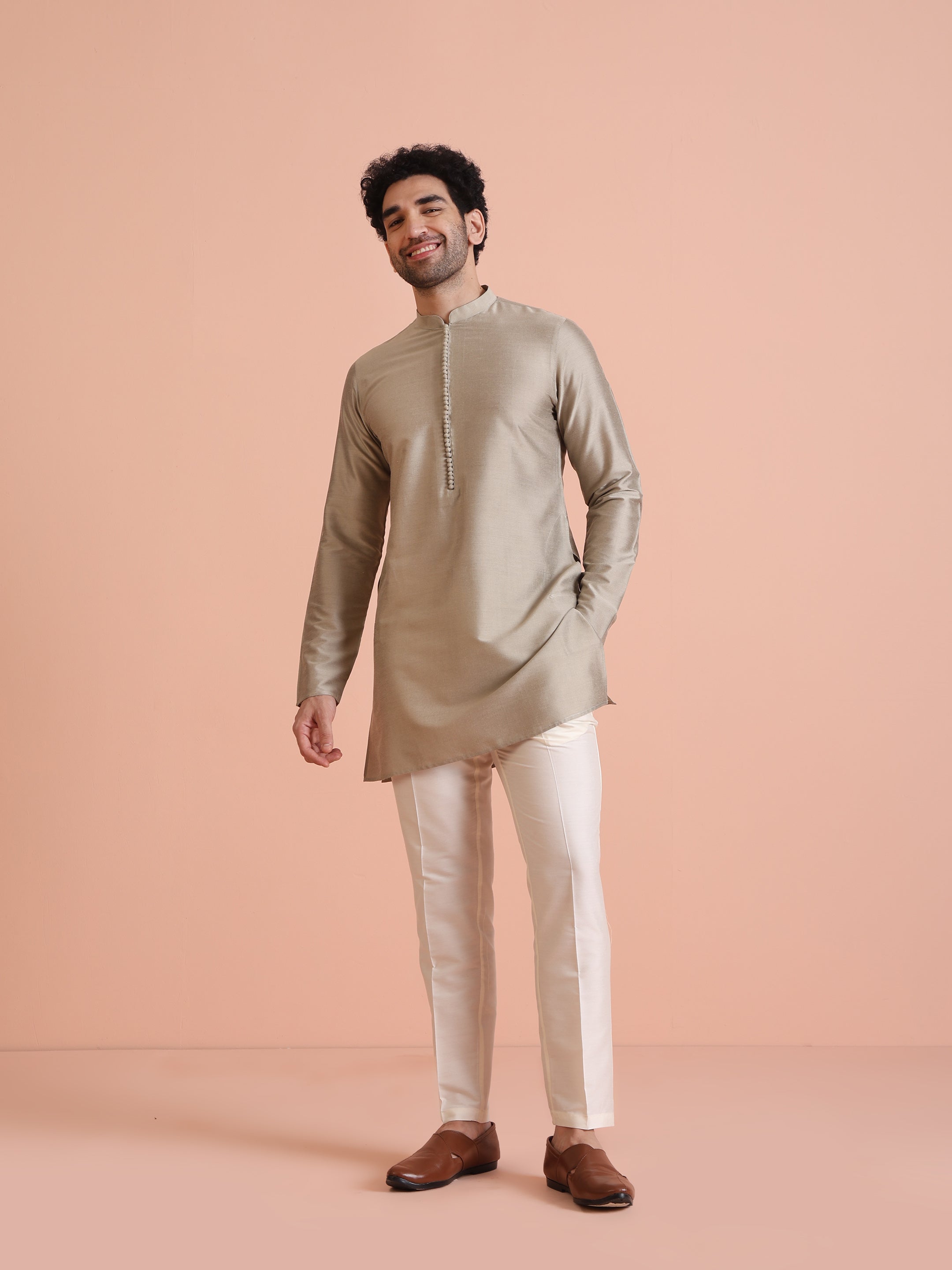 Grey poly silk solid kurta trouser set for men. Perfect blend of elegance and comfort for festive or semi-formal occasions.