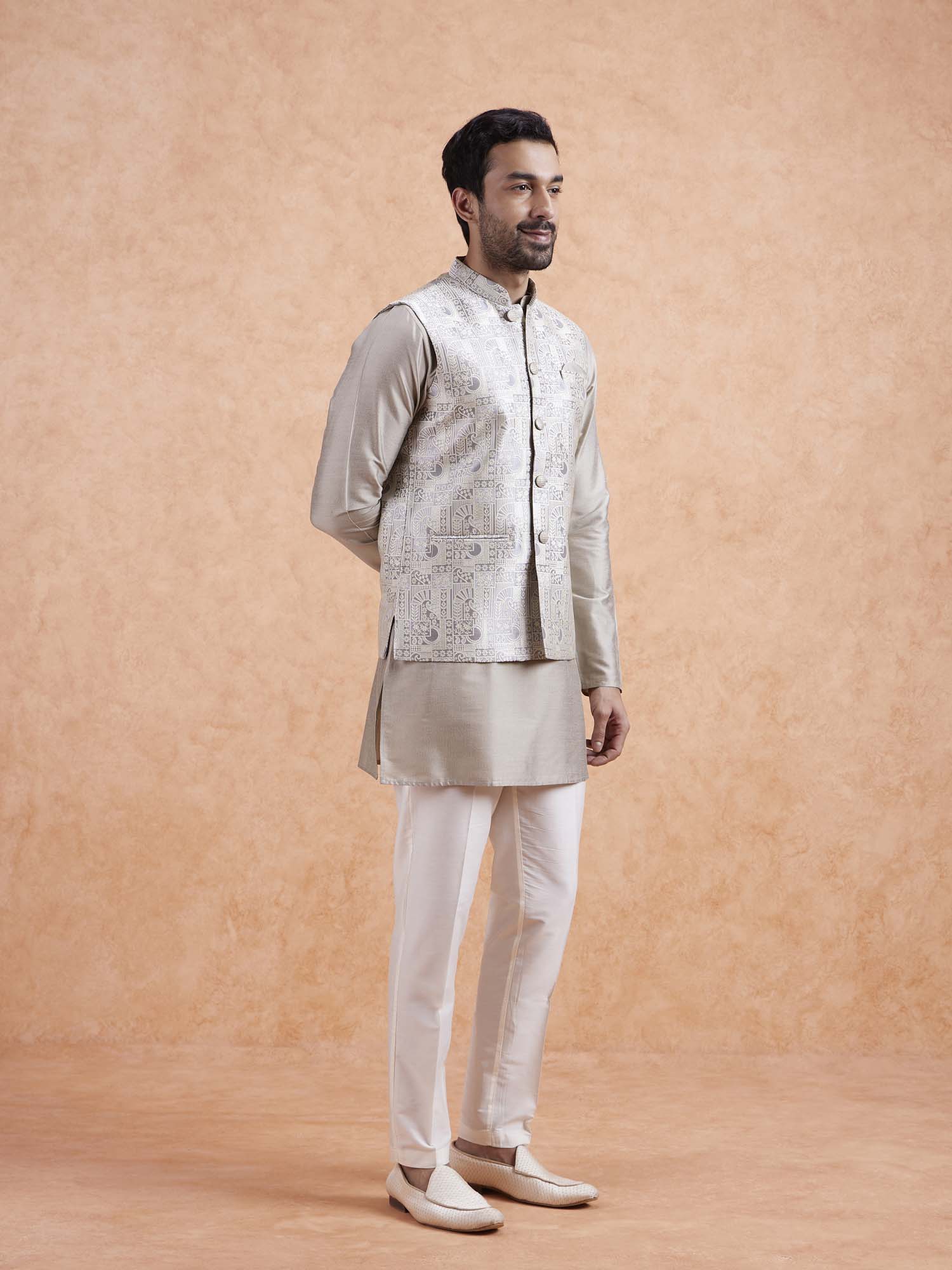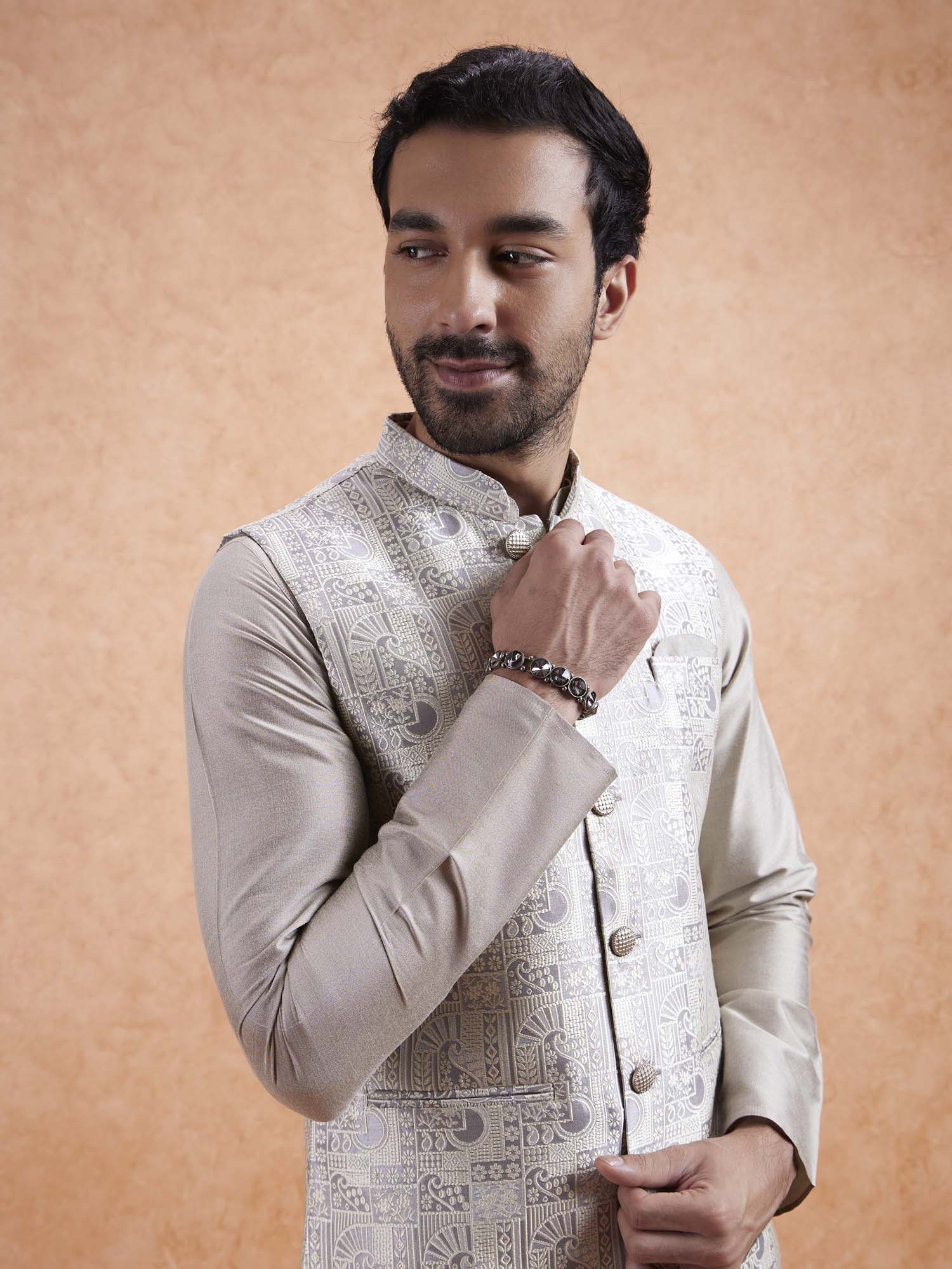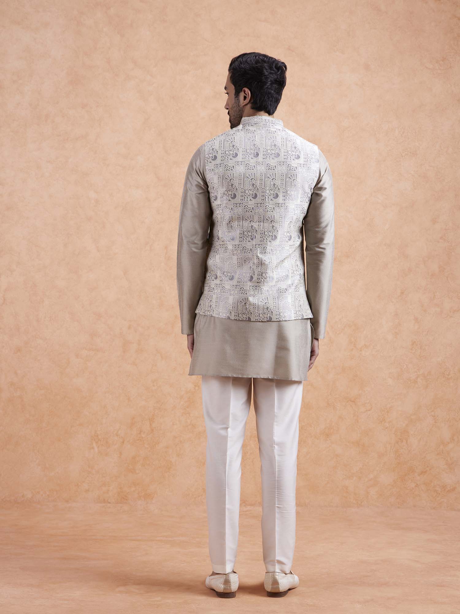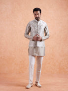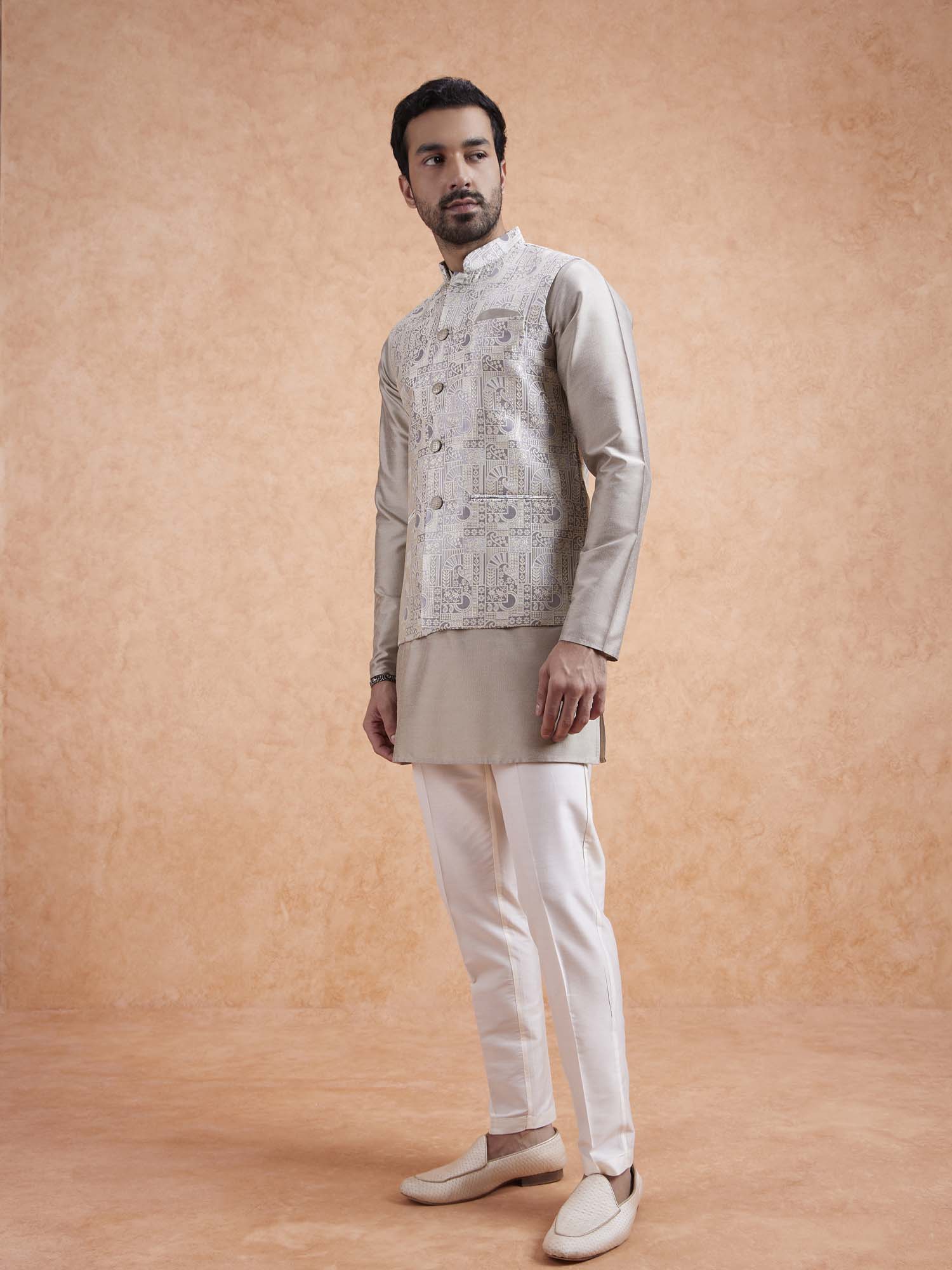 Grey Silk Blend Textured Mid Kurta Jacket Trouser Set, Perfect festive ethnic wear for men, ideal festive and casual occasions.