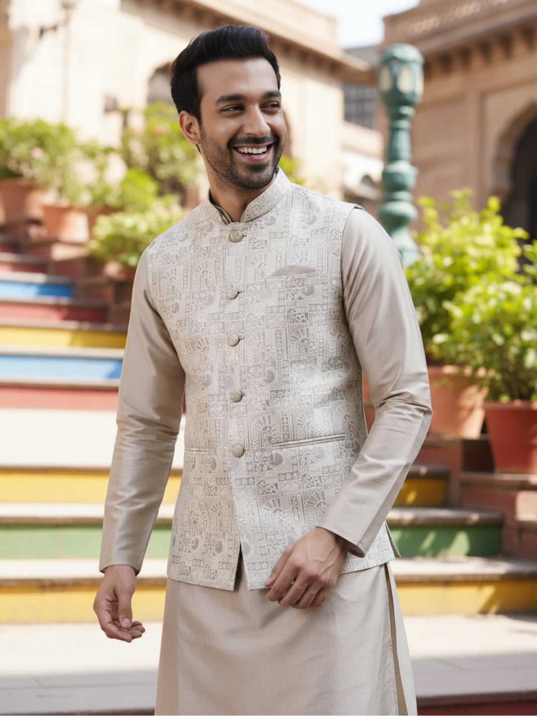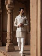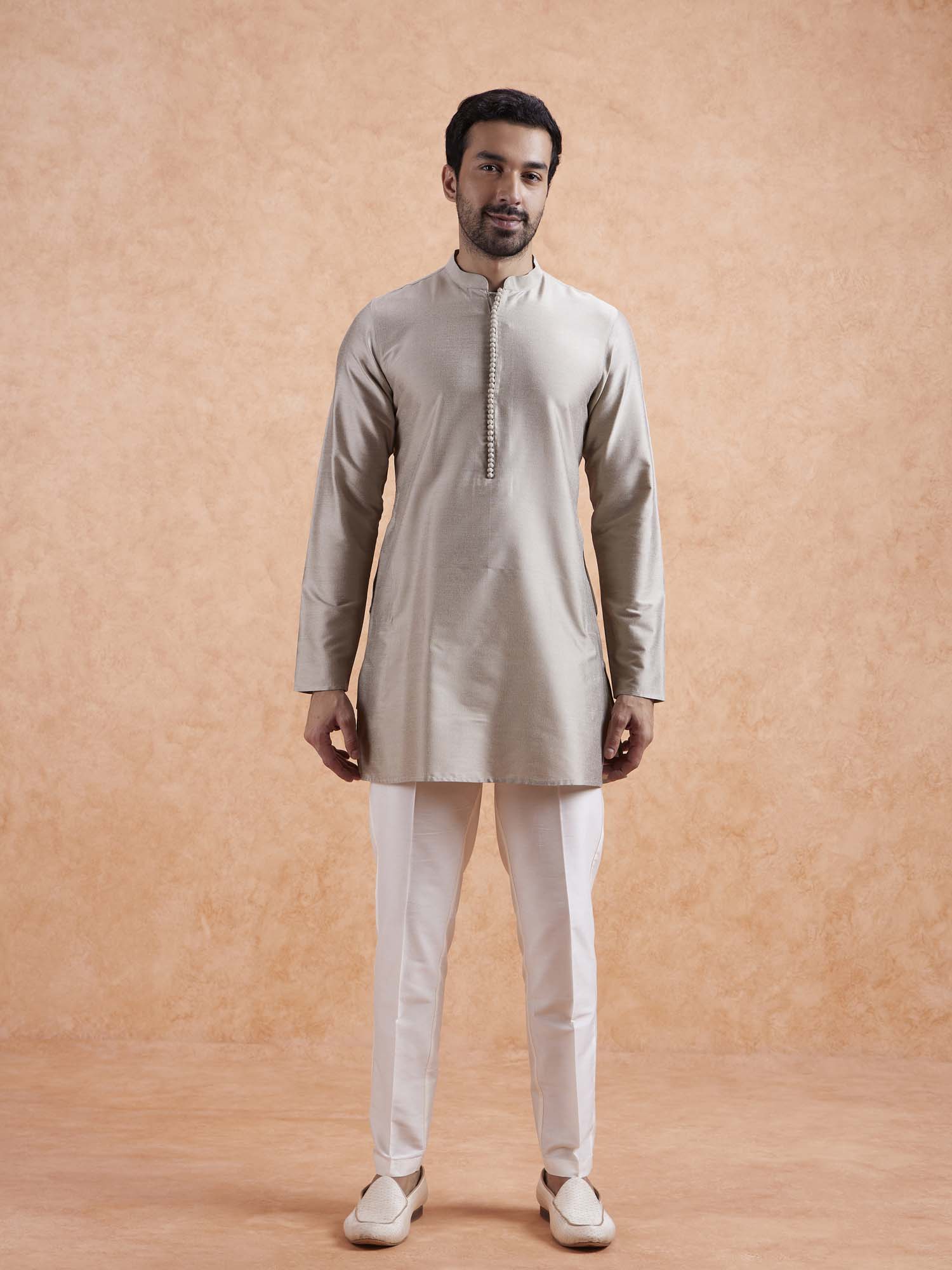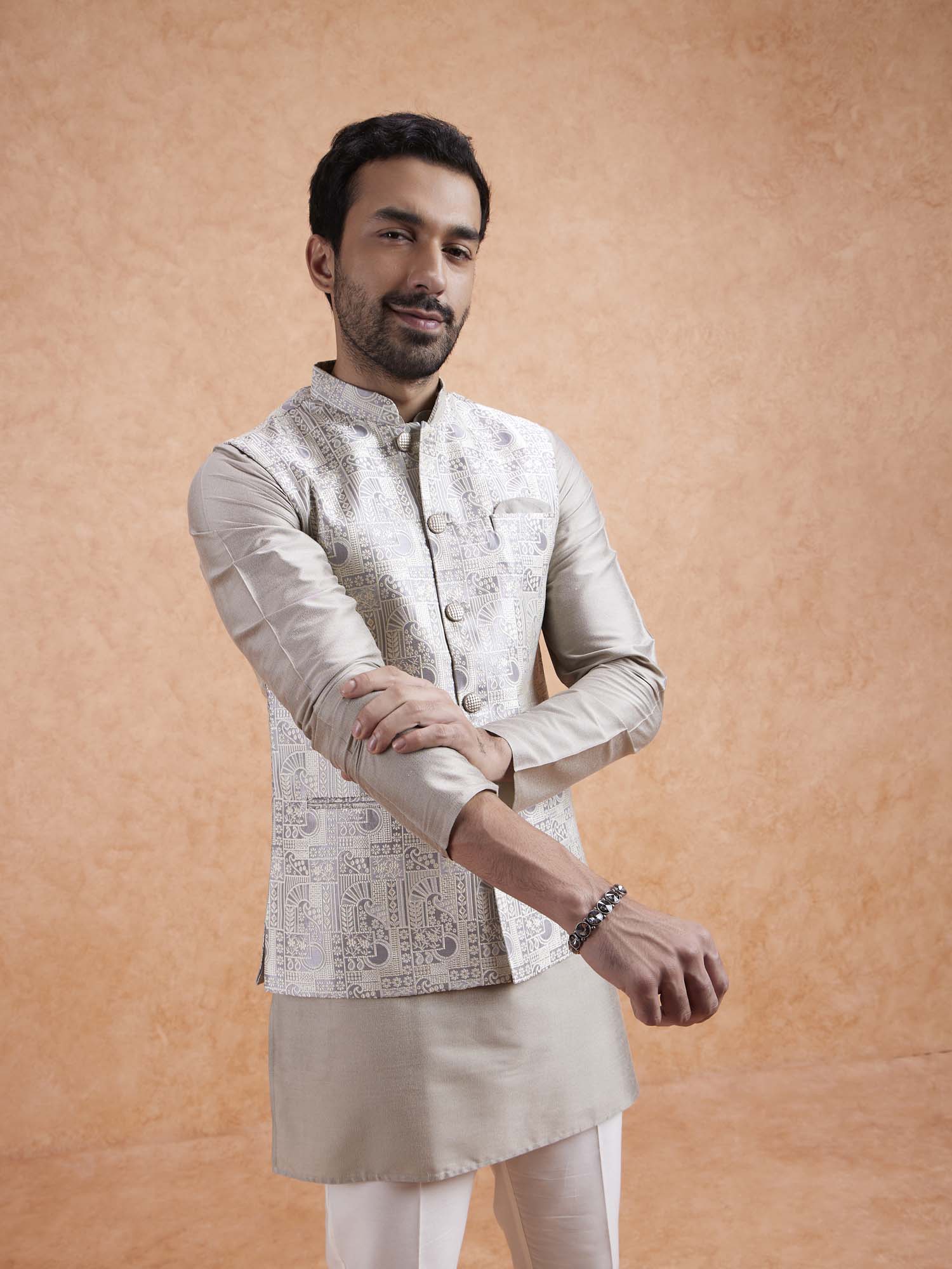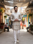 Grey Silk Blend Textured Mid Kurta Jacket Trouser Set, Perfect festive ethnic wear for men, ideal festive and casual occasions.
