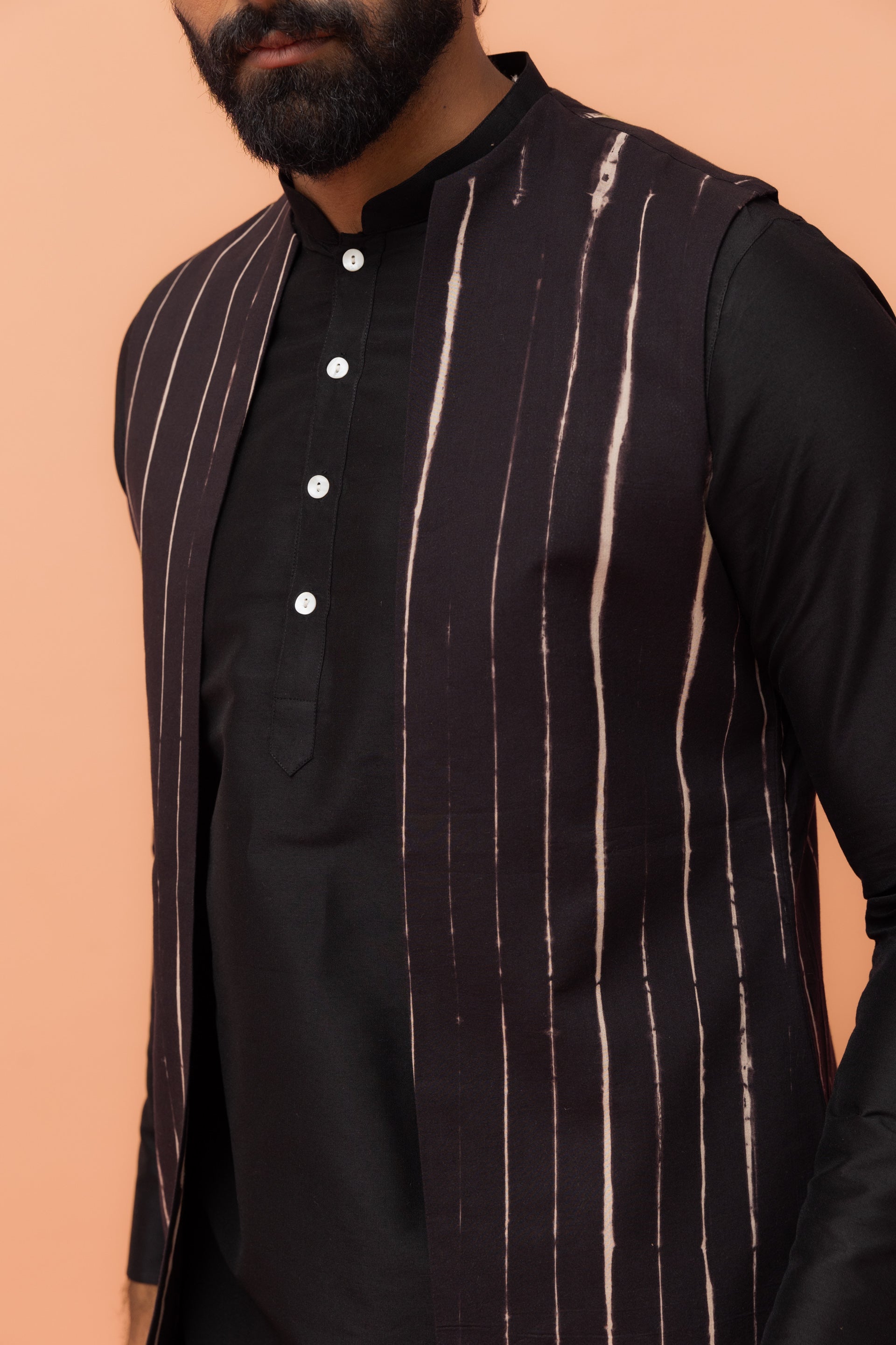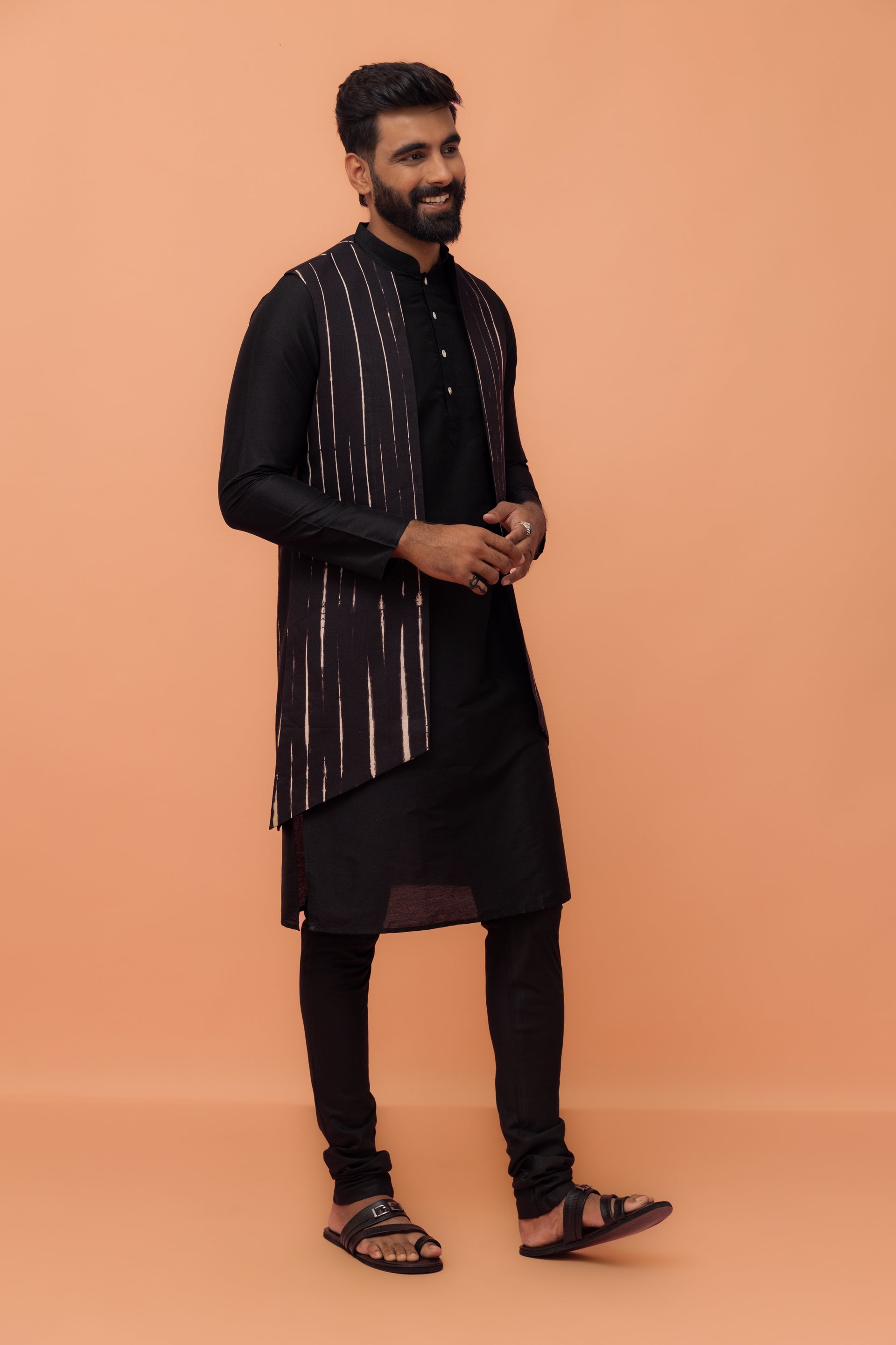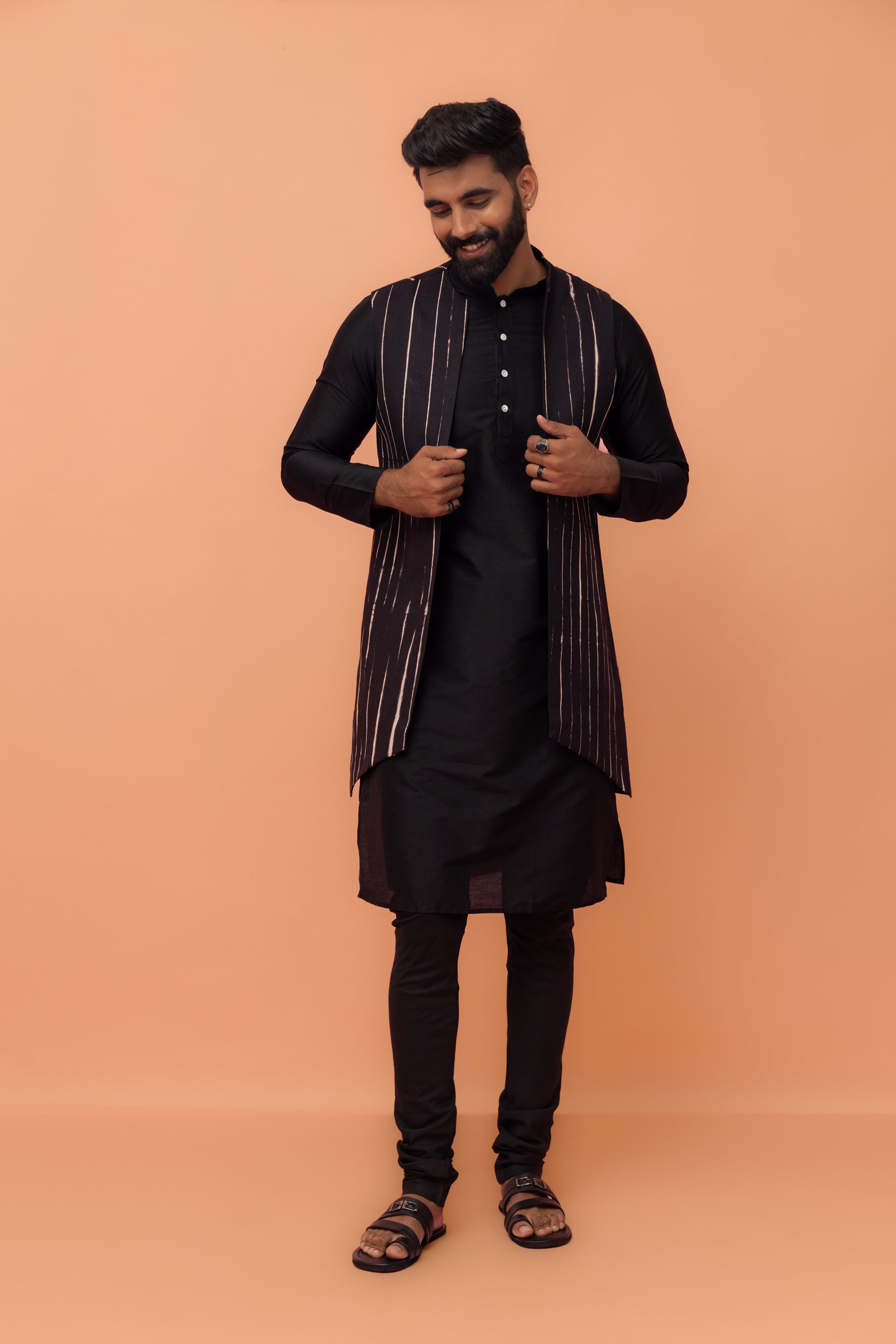 This black cotton blend kurta, jacket, and churidar set features a printed design and regular fit. Ideal for traditional occasions, it offers a stylish and comfortable ethnic look.