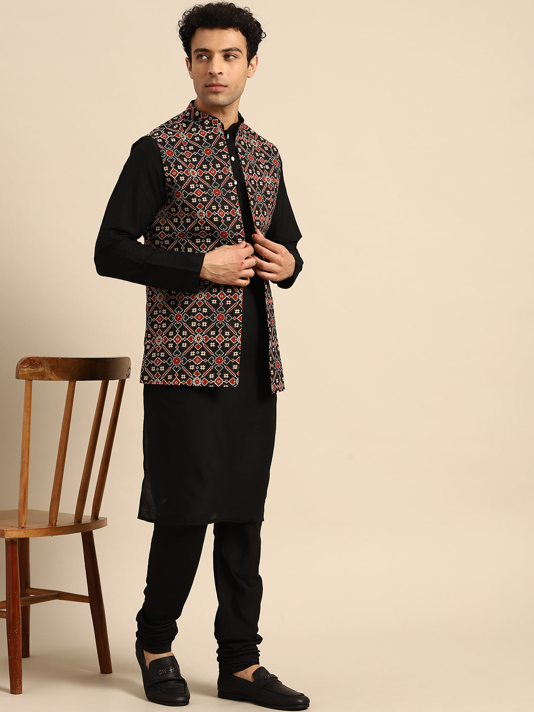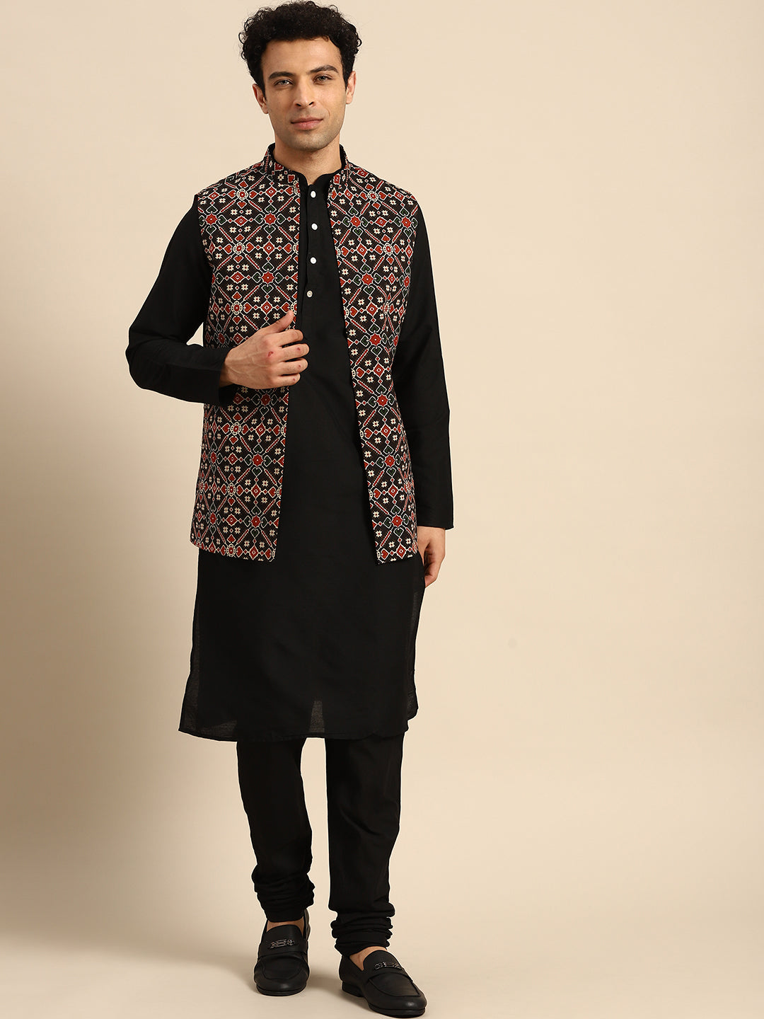 Black Cotton Silk Geometric Printed Nehru Jacket Kurta Churidar