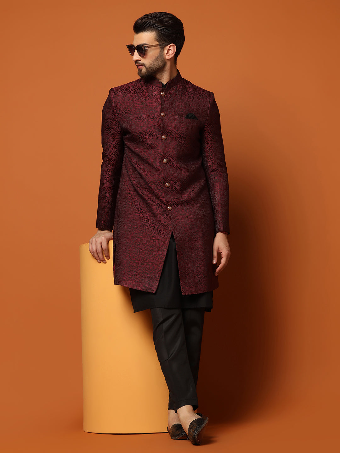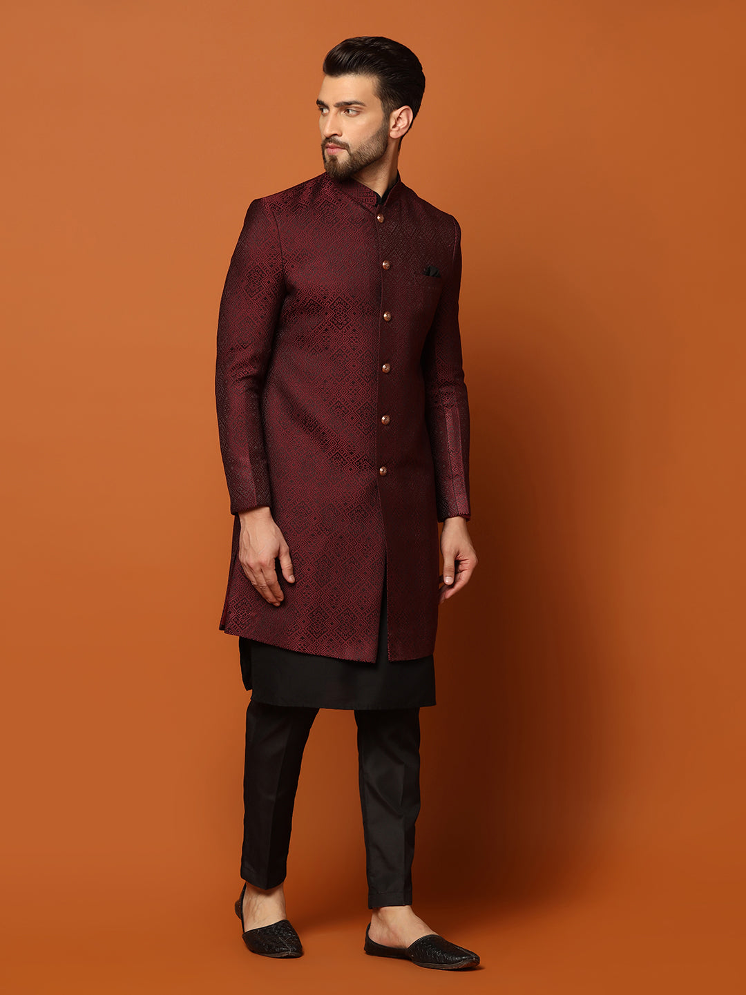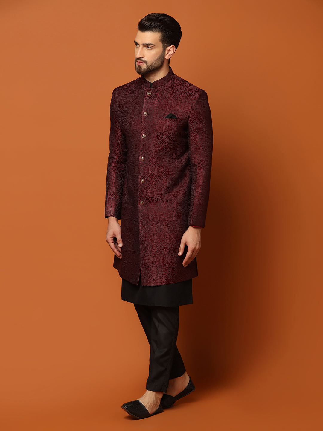 Upgrade your festive look with this maroon silk blend jacquard kurta, Indowestern, and trouser set. The textured fabric and regular fit ensure a regal appearance.