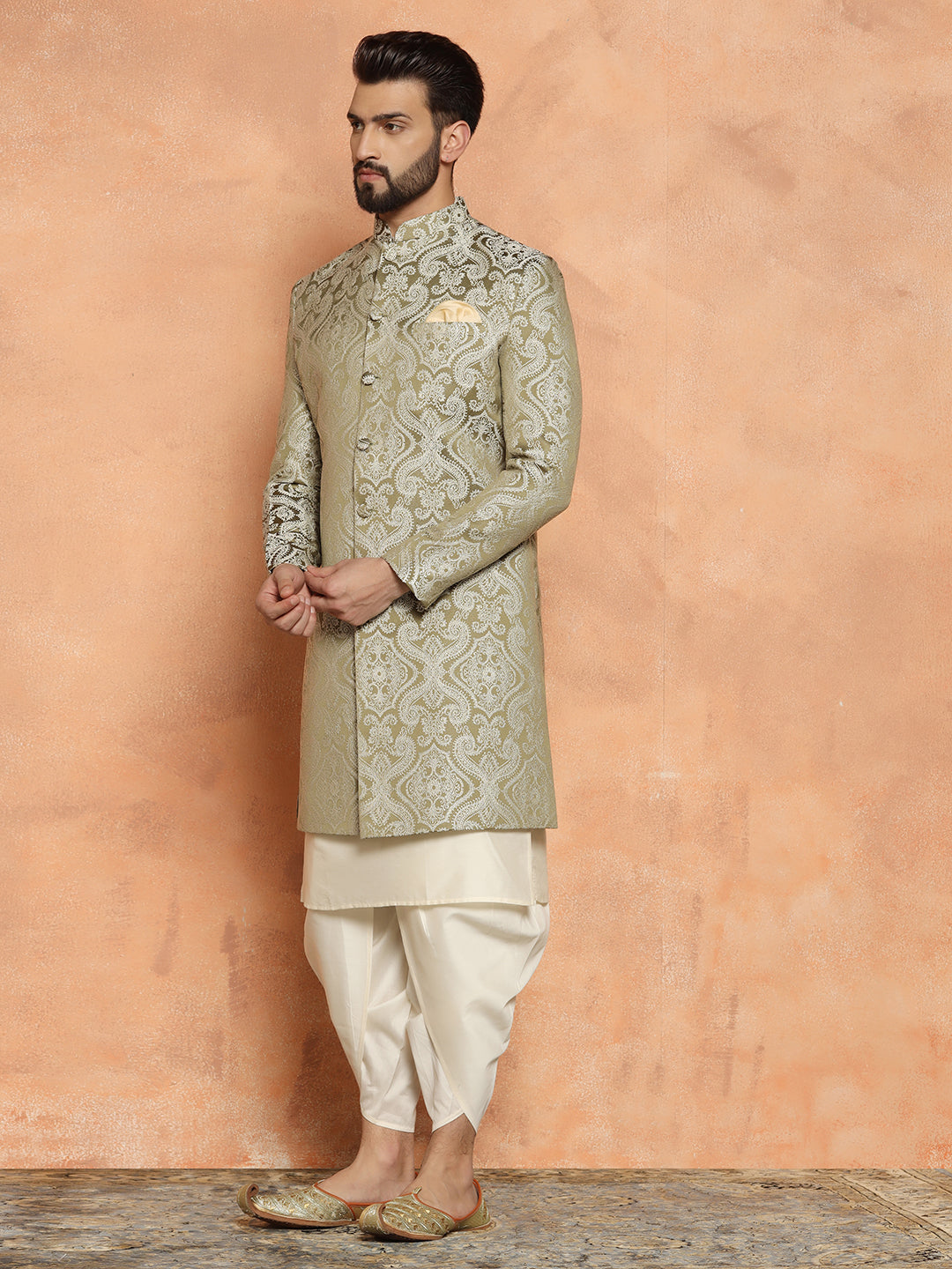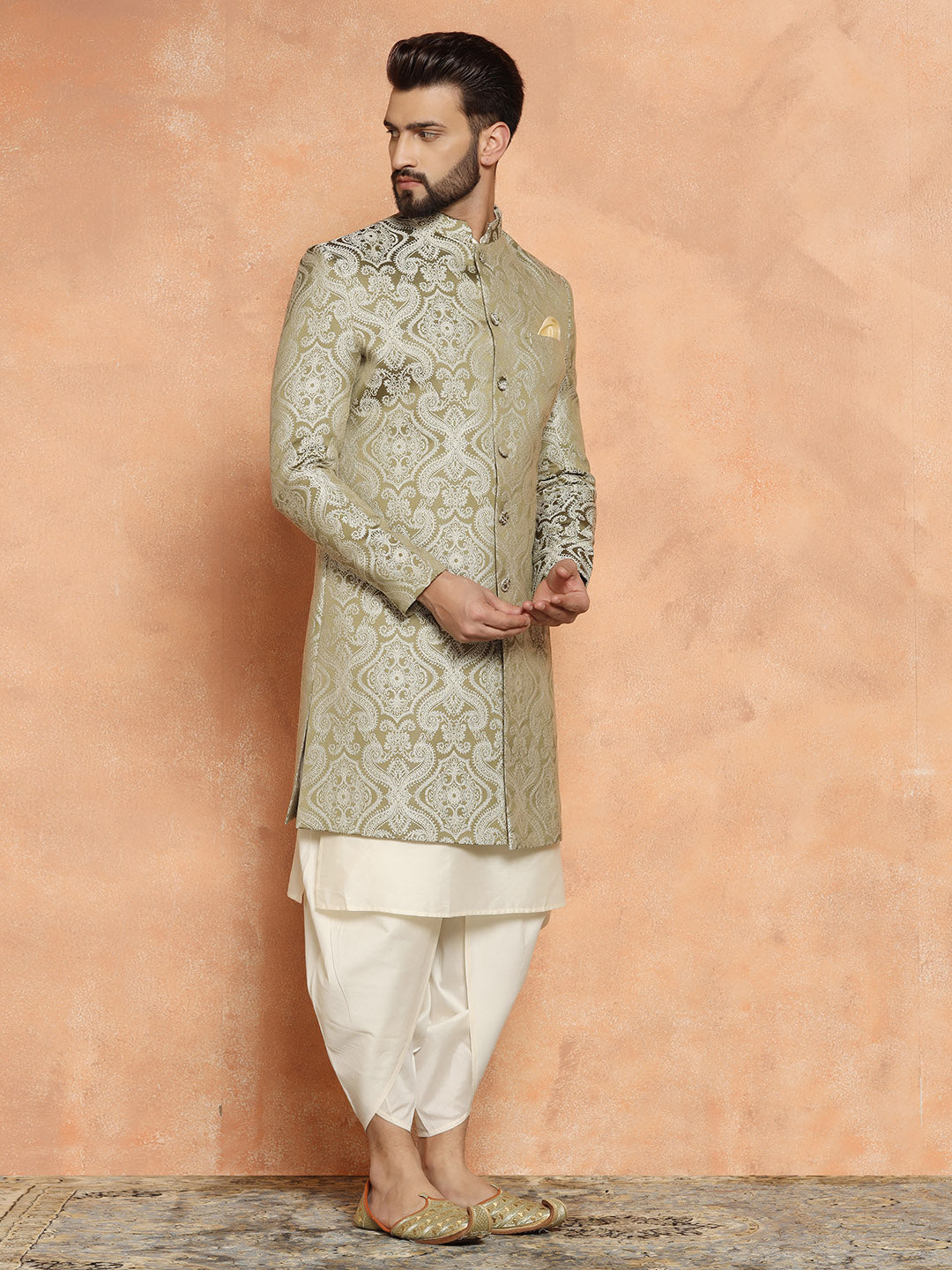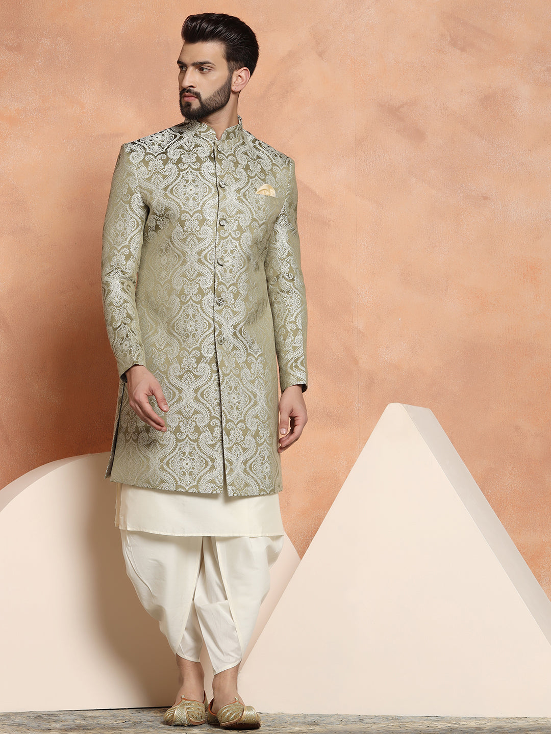 Step up your ethnic style with this olive green silk blend kurta, Indowestern, and dhoti set. The embroidery detailing and regular fit add a touch of luxury to any traditional event.