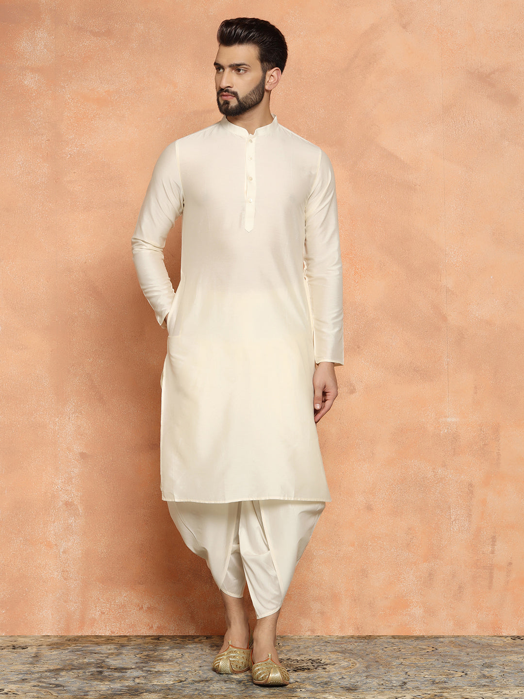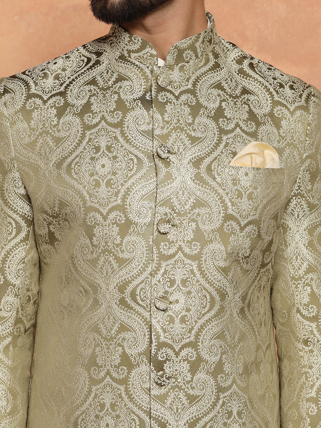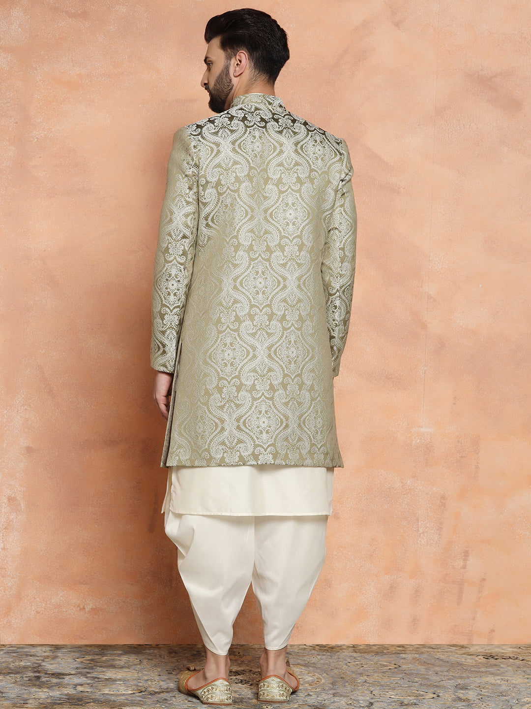 Step up your ethnic style with this olive green silk blend kurta, Indowestern, and dhoti set. The embroidery detailing and regular fit add a touch of luxury to any traditional event.