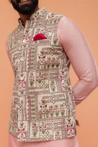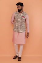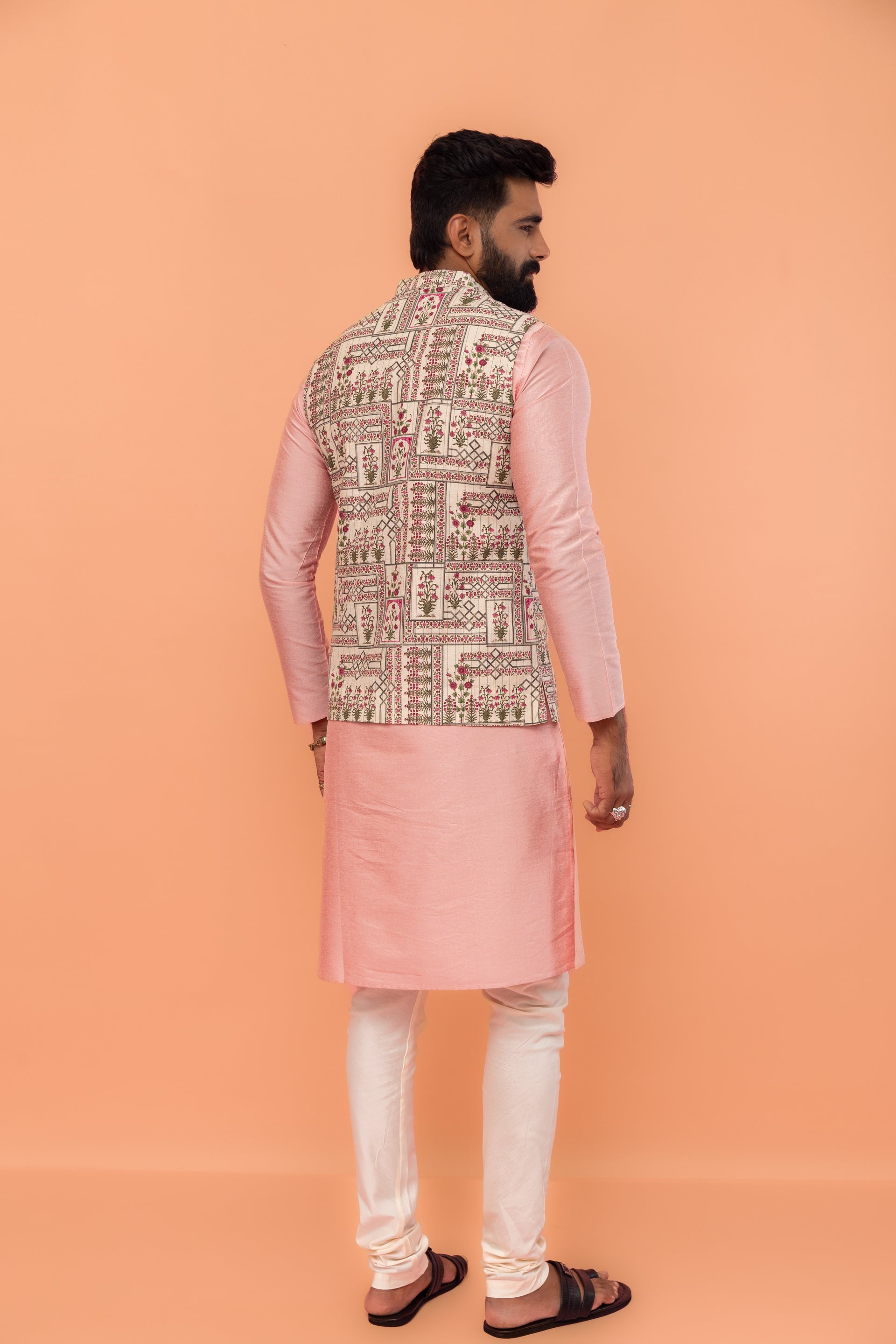 Elevate your ethnic wear with this white and pink cotton blend kurta, jacket, and churidar set. Featuring a printed design and regular fit, it’s ideal for festive occasions.