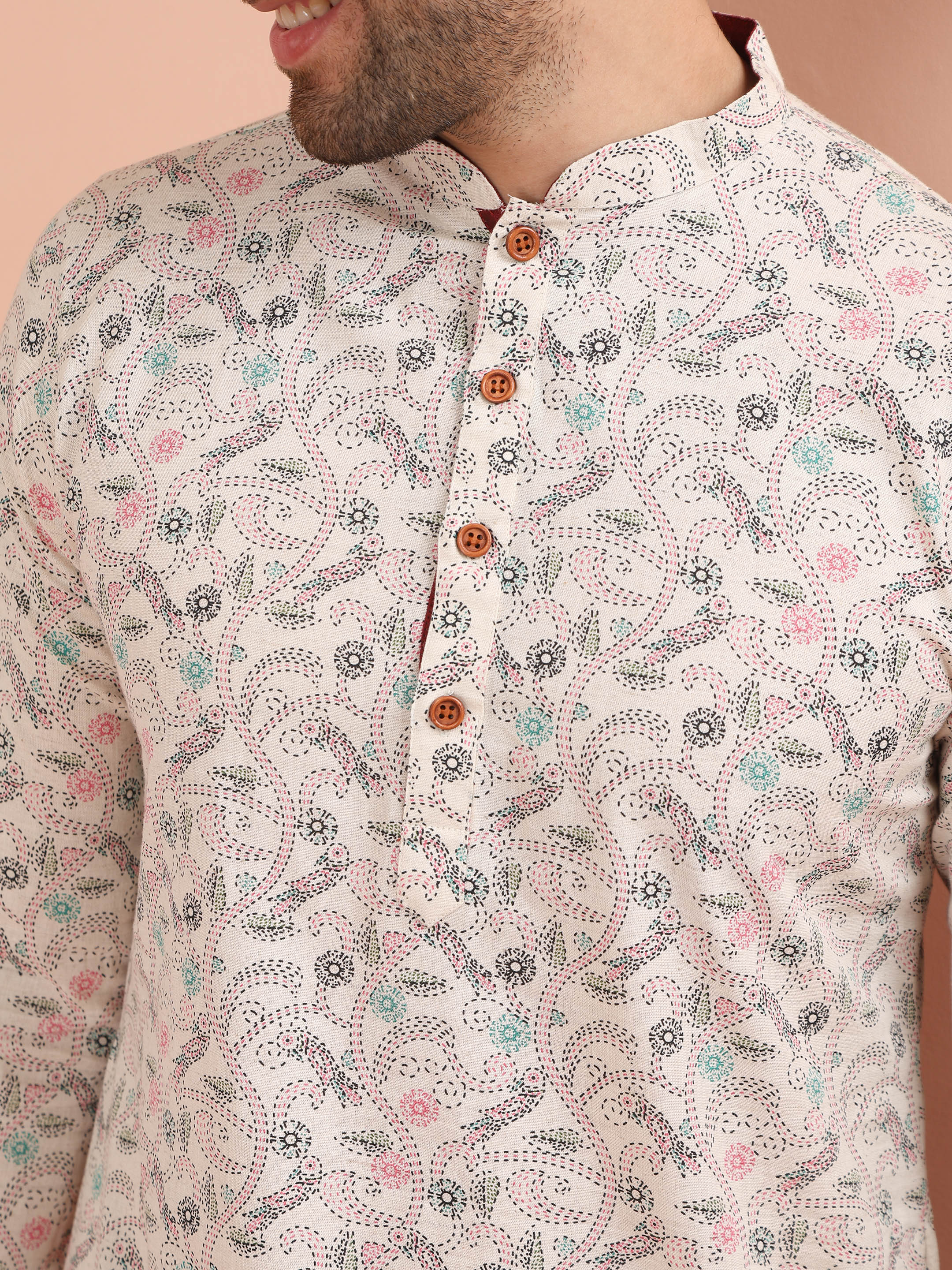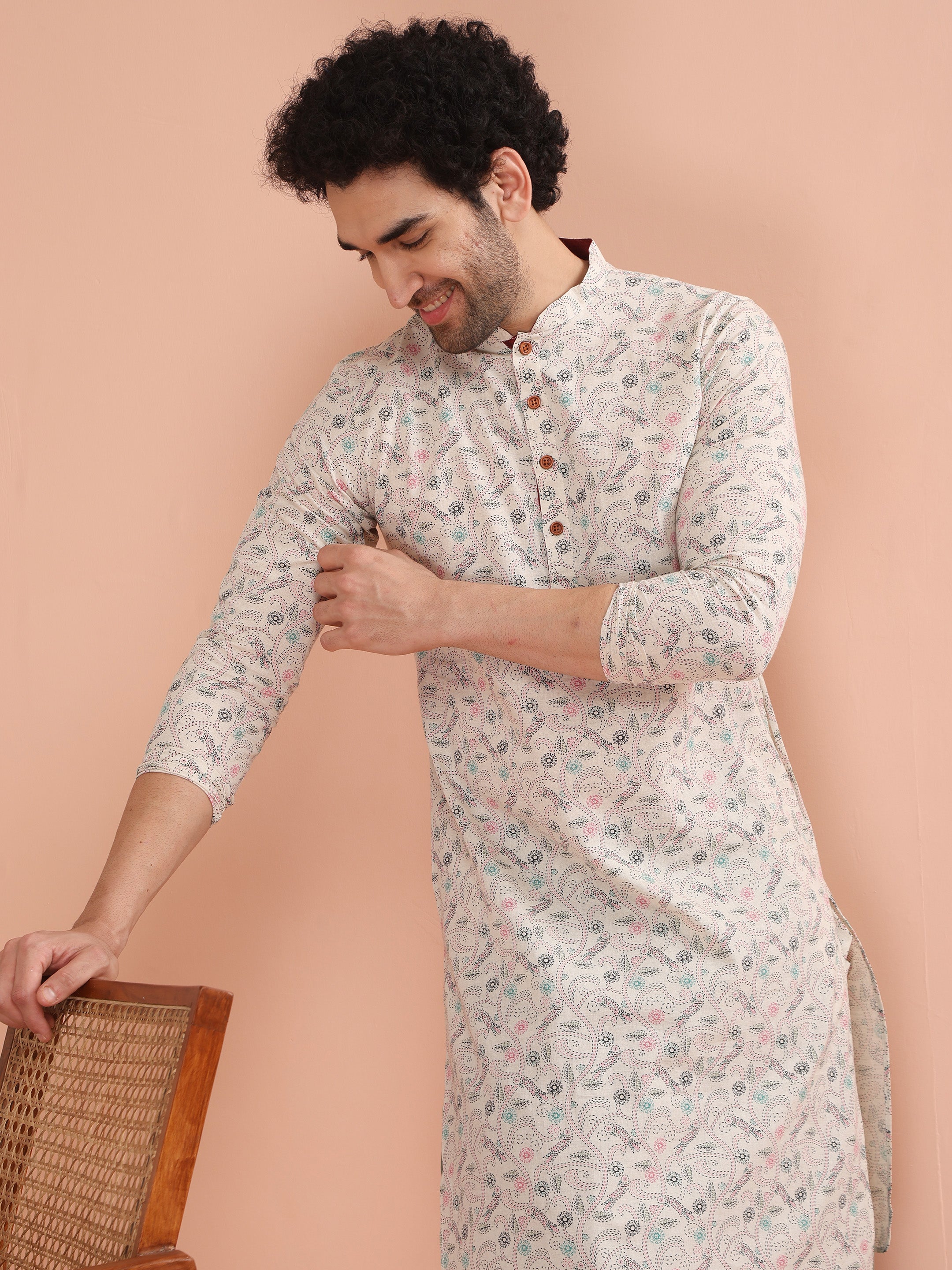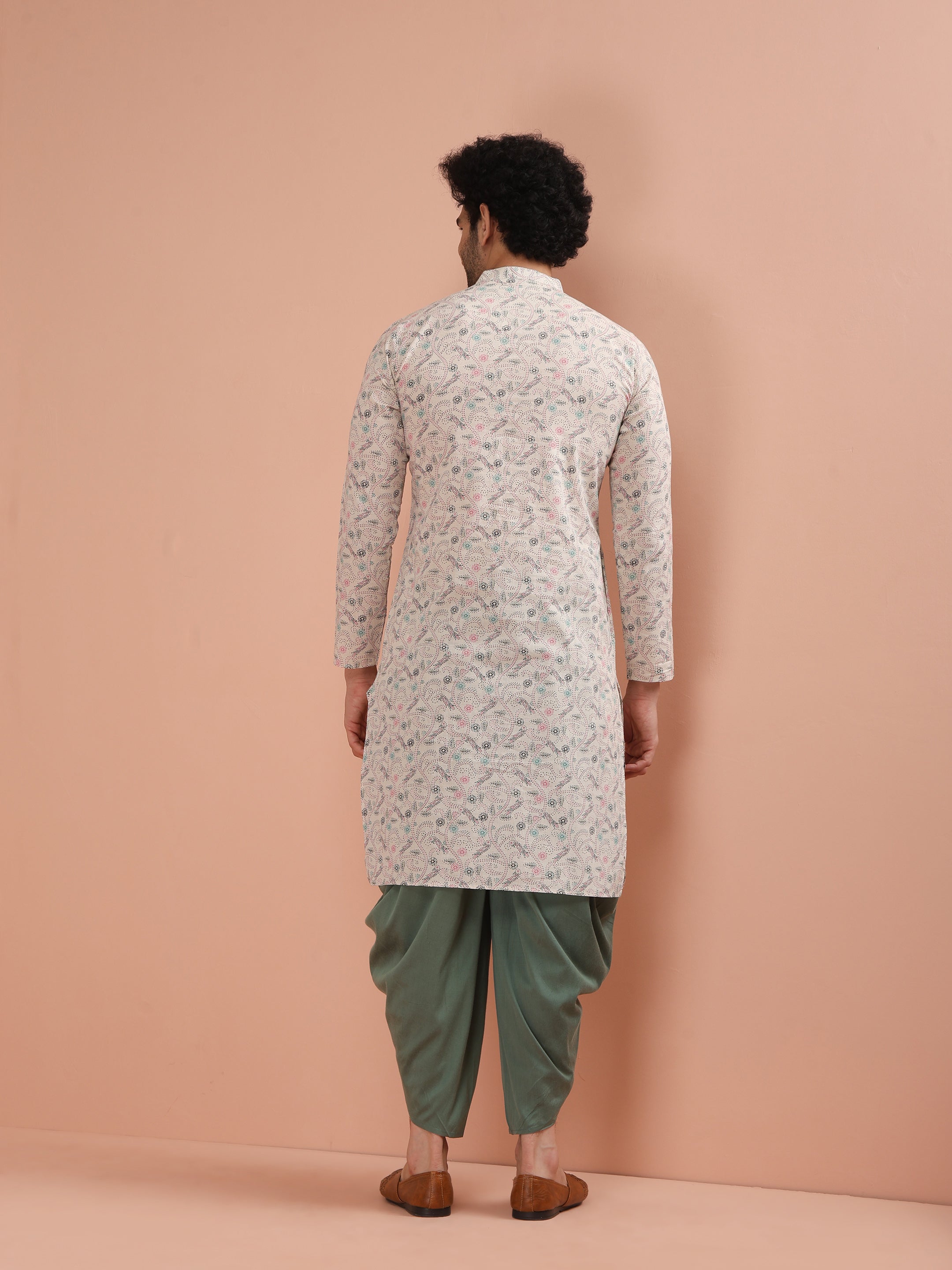 Experience classic elegance with this Men Multi Printed Kurta Dhoti Set with Kantha Print. The breathable Silk Blend fabric ensures comfort throughout the day. Ideal for festive events or casual wear.