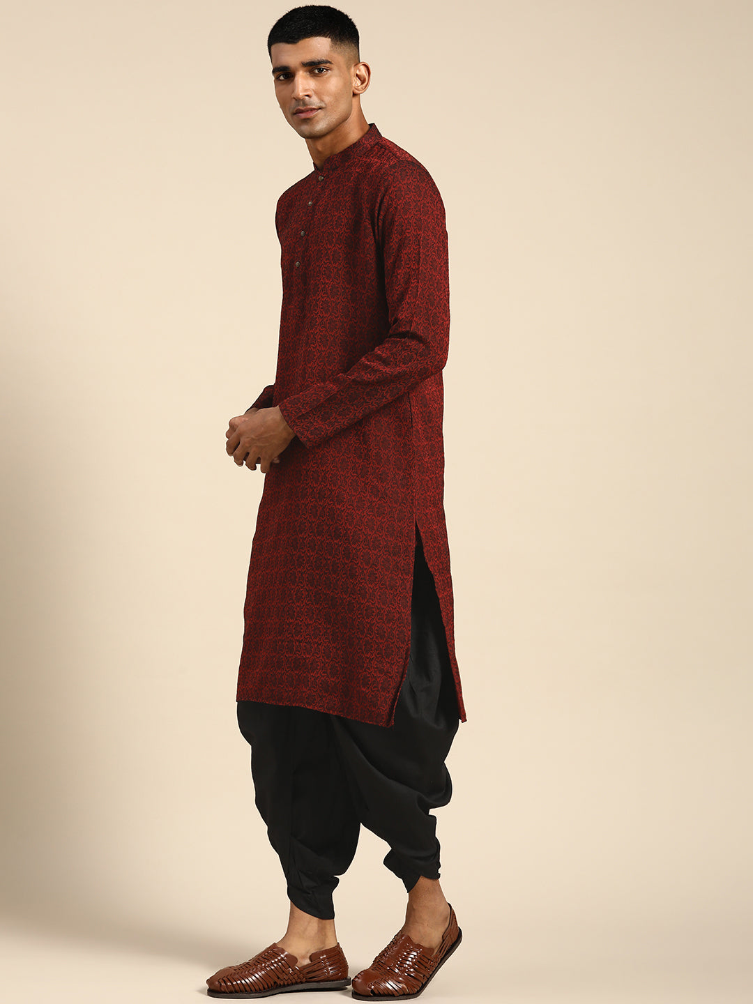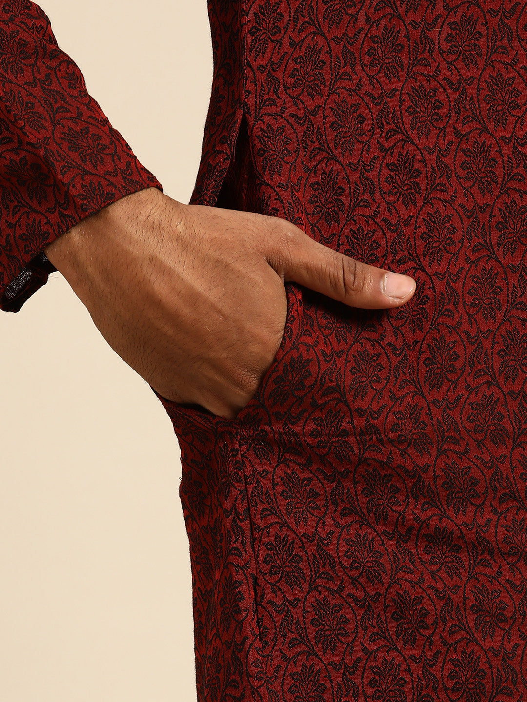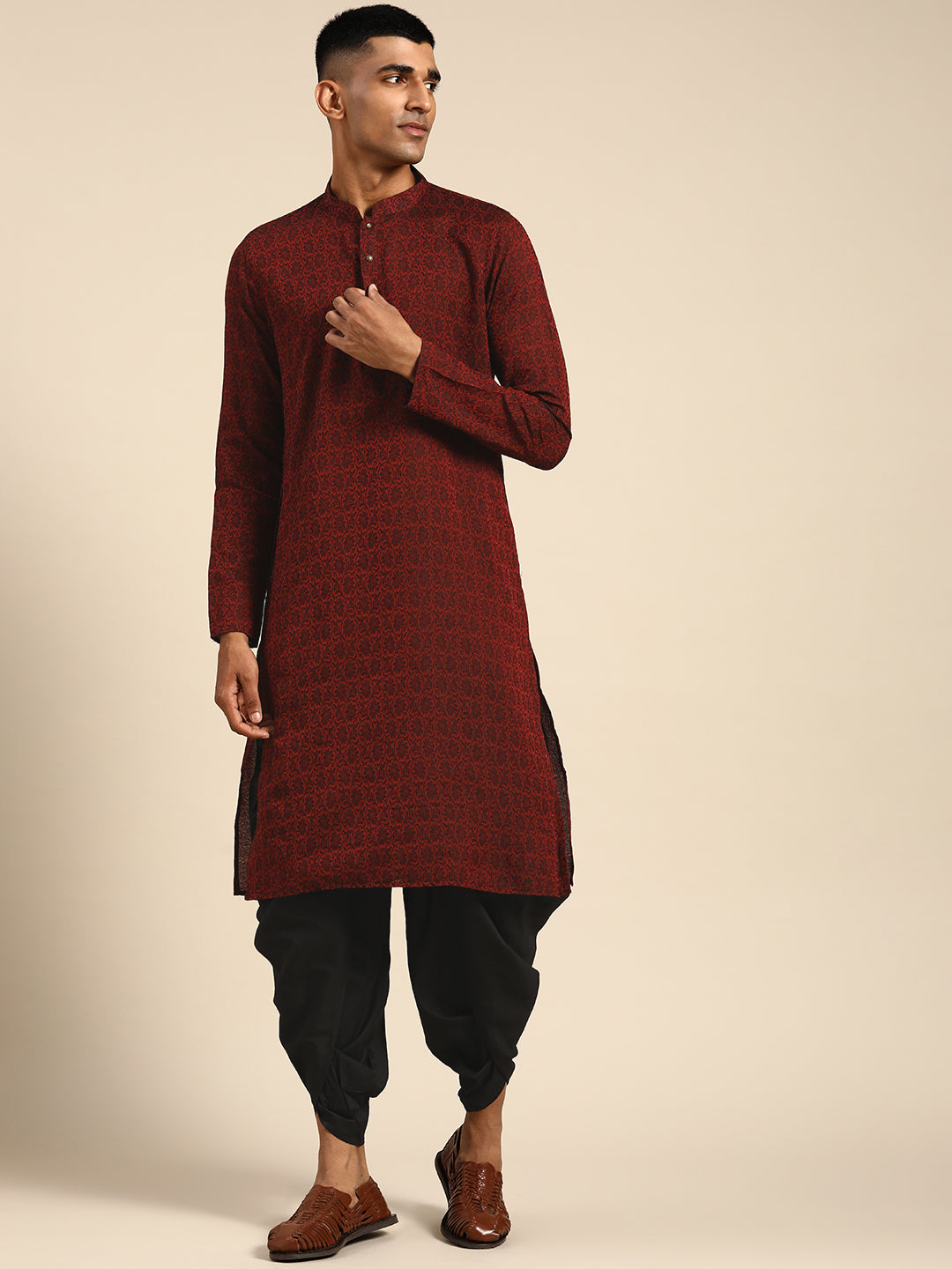Enhance your ethnic wardrobe with this Maroon Cotton Blend Textured Kurta. The textured design adds depth and interest, while the regular fit ensures comfort. Whether for festive occasions or cultural gatherings, this kurta brings a touch of sophistication to your look.