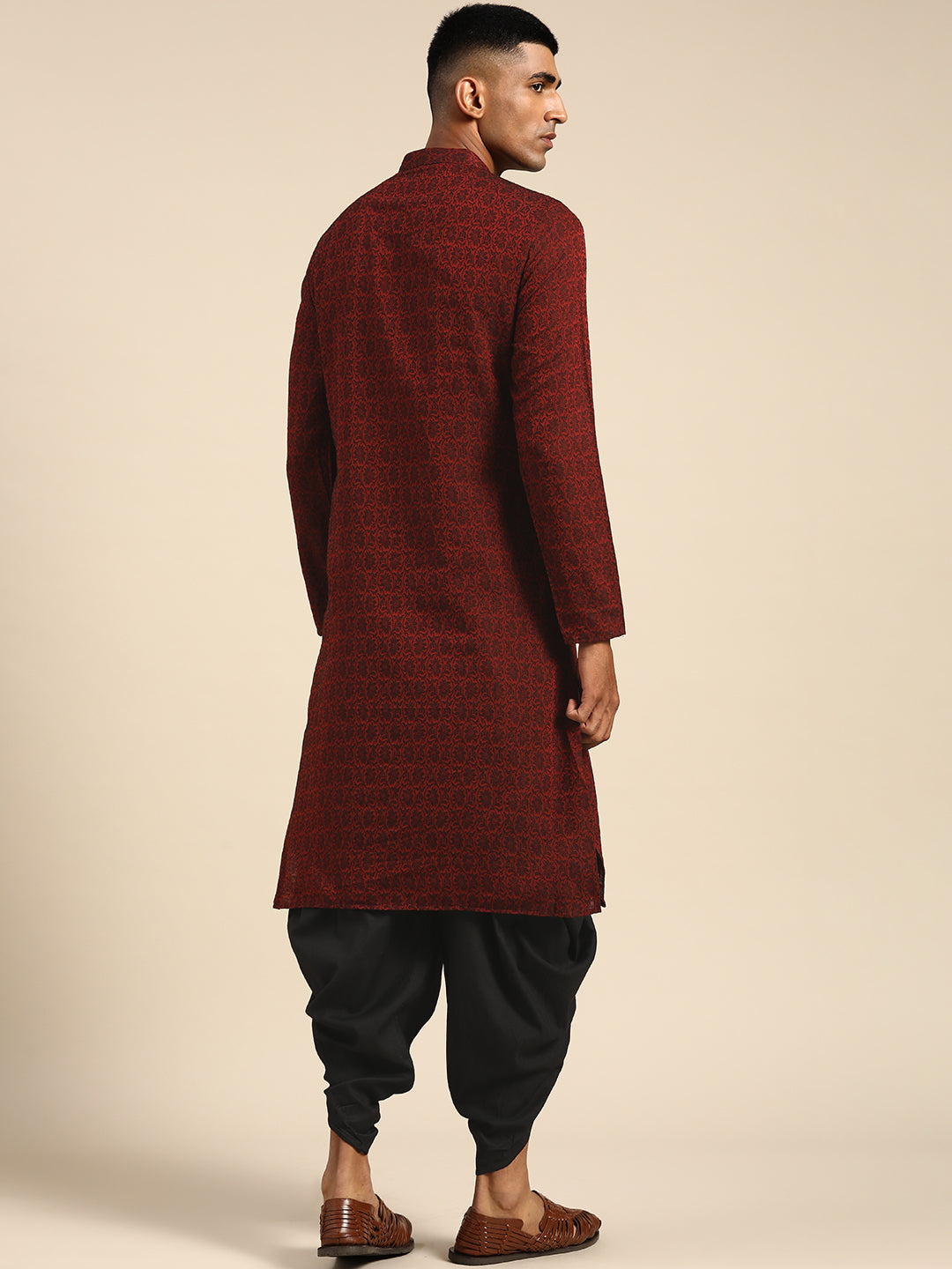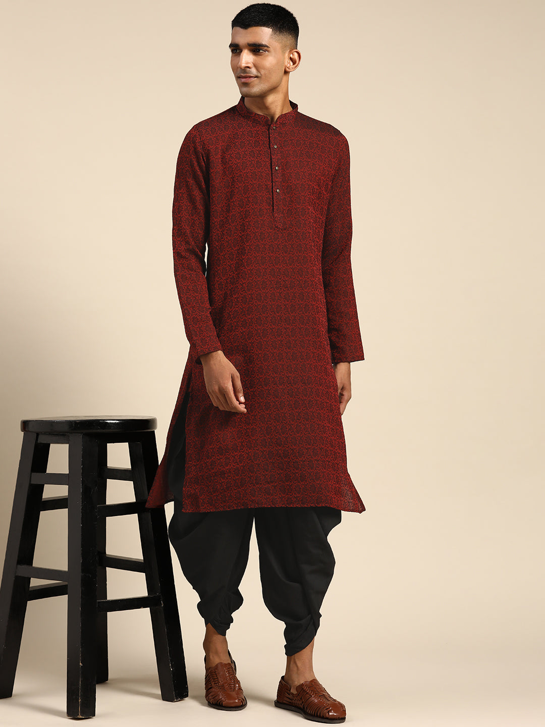 Make a bold statement with this Maroon Cotton Blend Kurta and Dhoti set. The textured design offers a unique flair, while the regular fit ensures comfort. Ideal for weddings or festive celebrations, this set adds a touch of traditional elegance to your wardrobe.