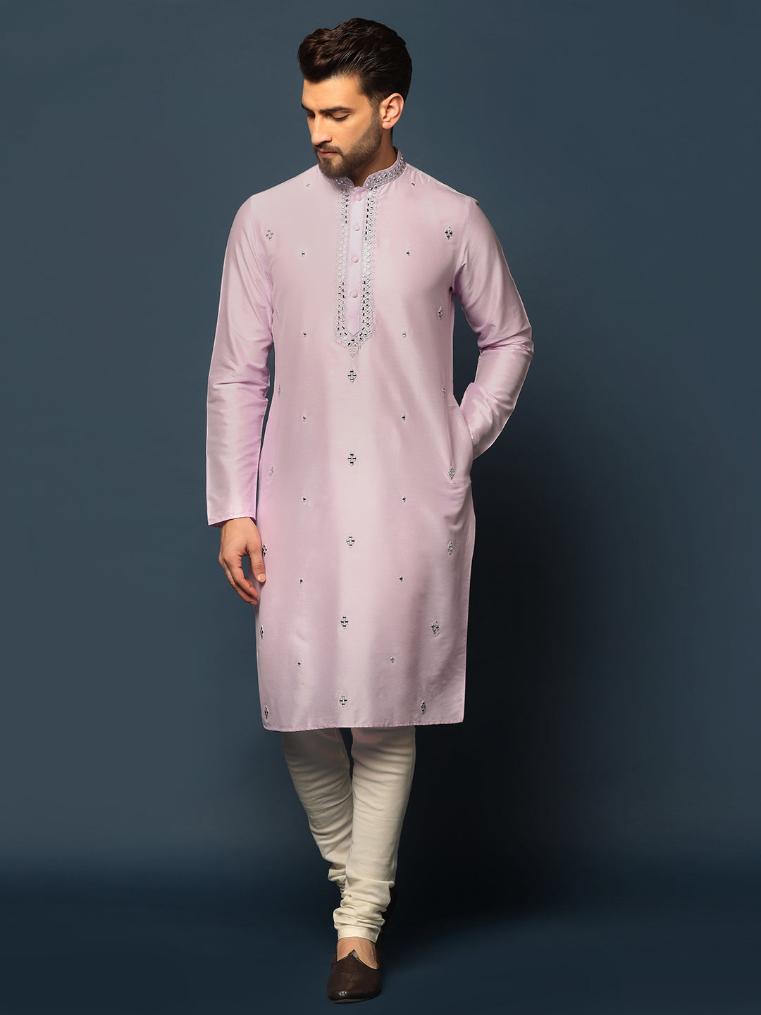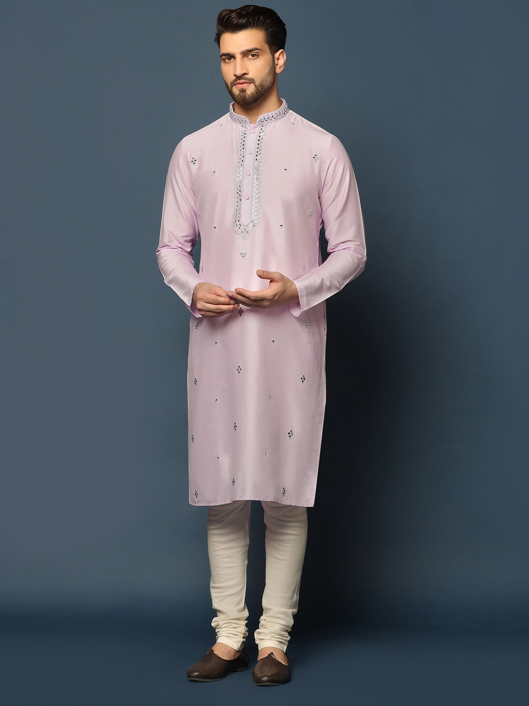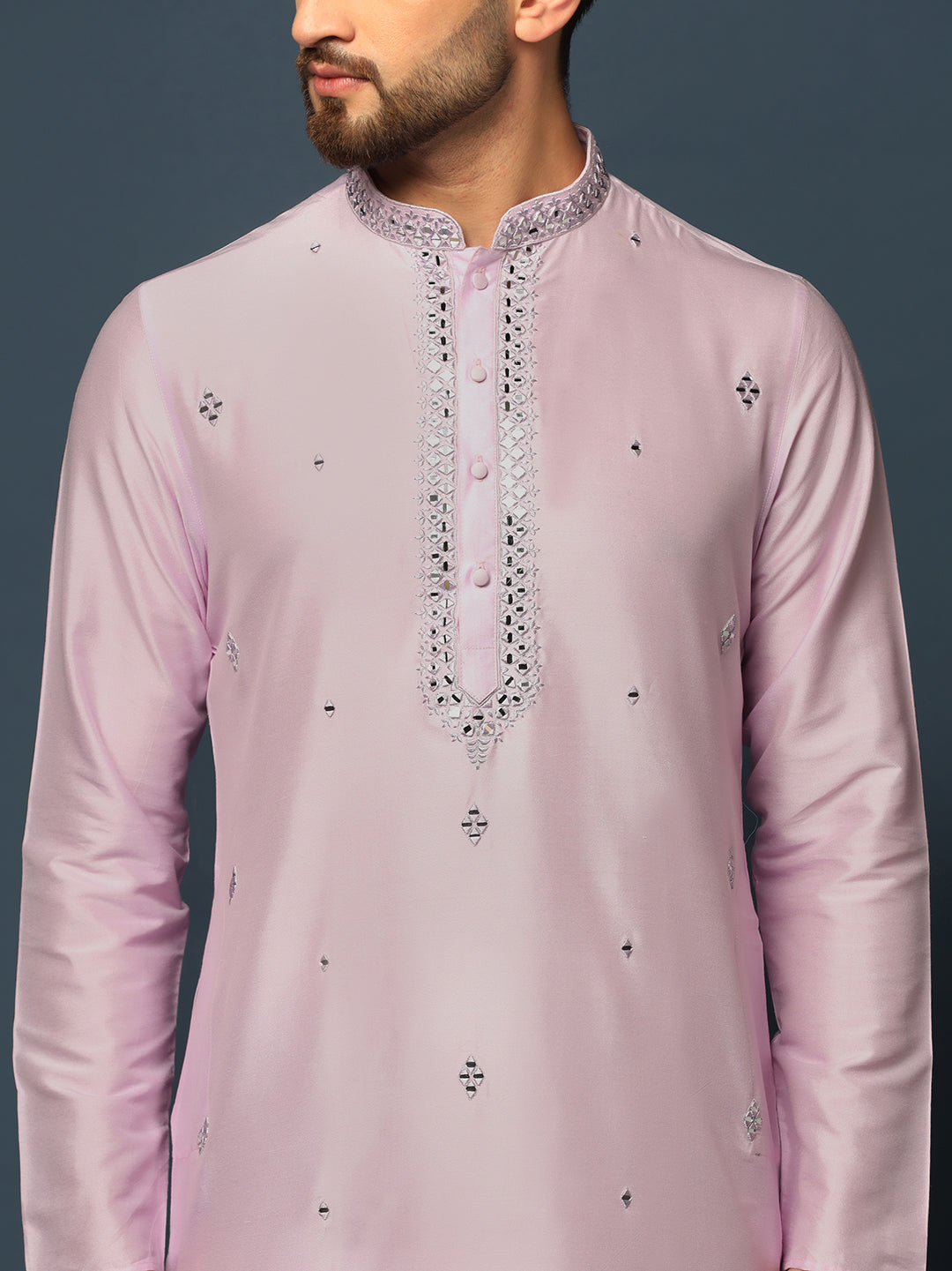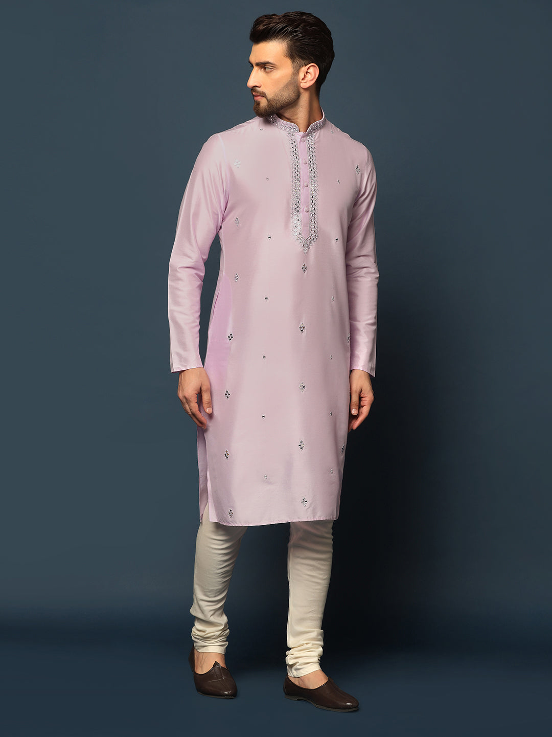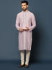 Men Light Pink Mirror Work Elegant Festive Kurta Set with Churidar