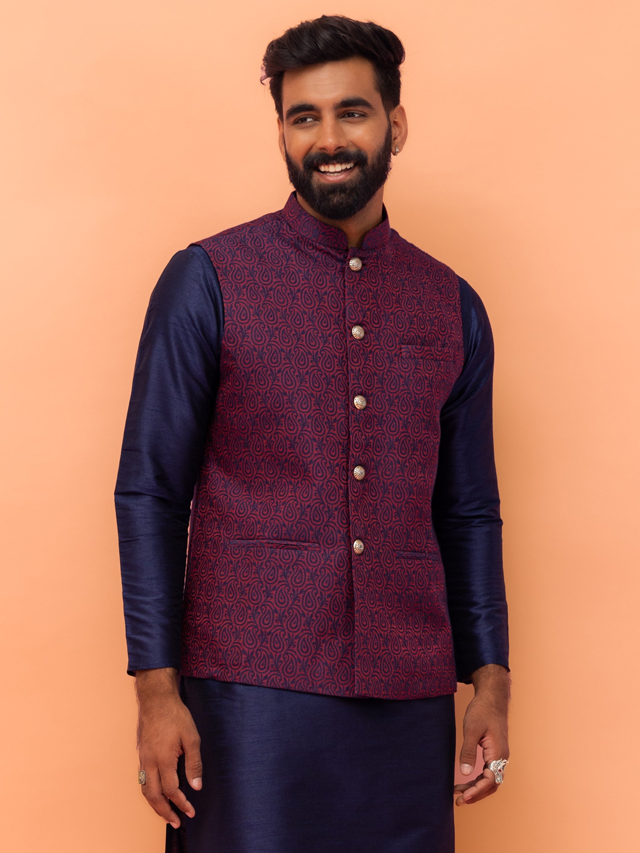 This maroon cotton blend jacket features a textured design and regular fit. Ideal for layering over your kurta, it adds a stylish touch to your ethnic wardrobe.