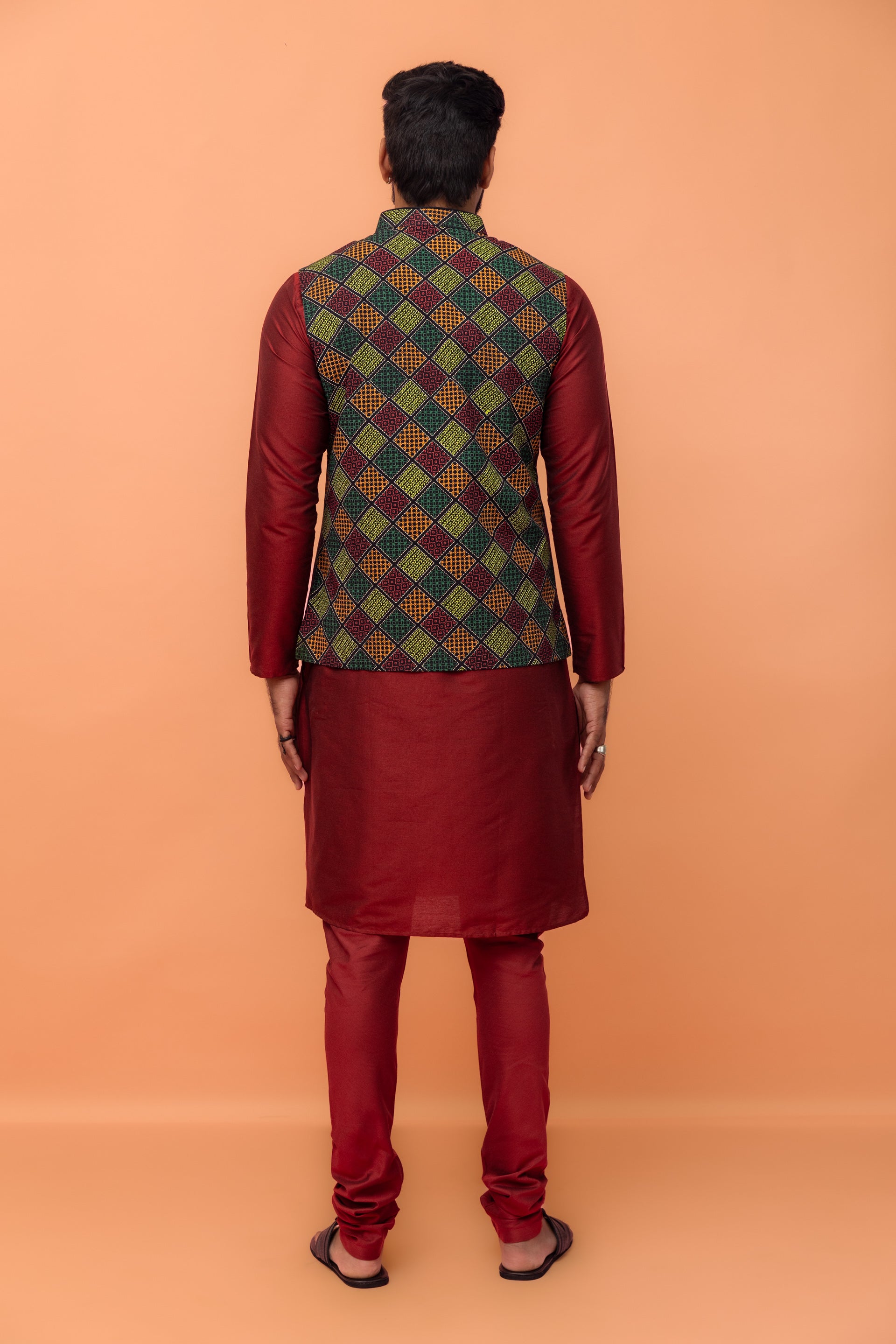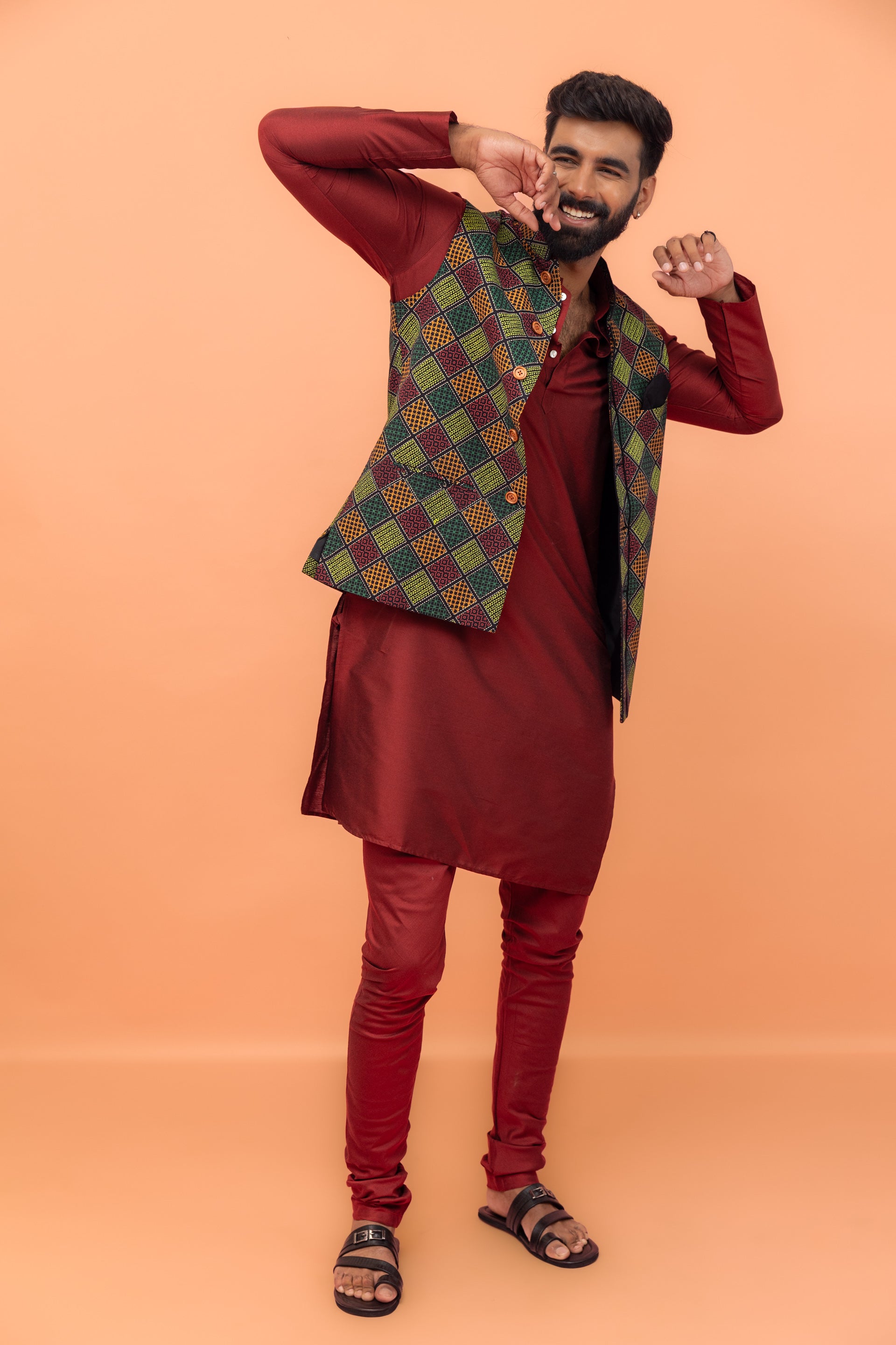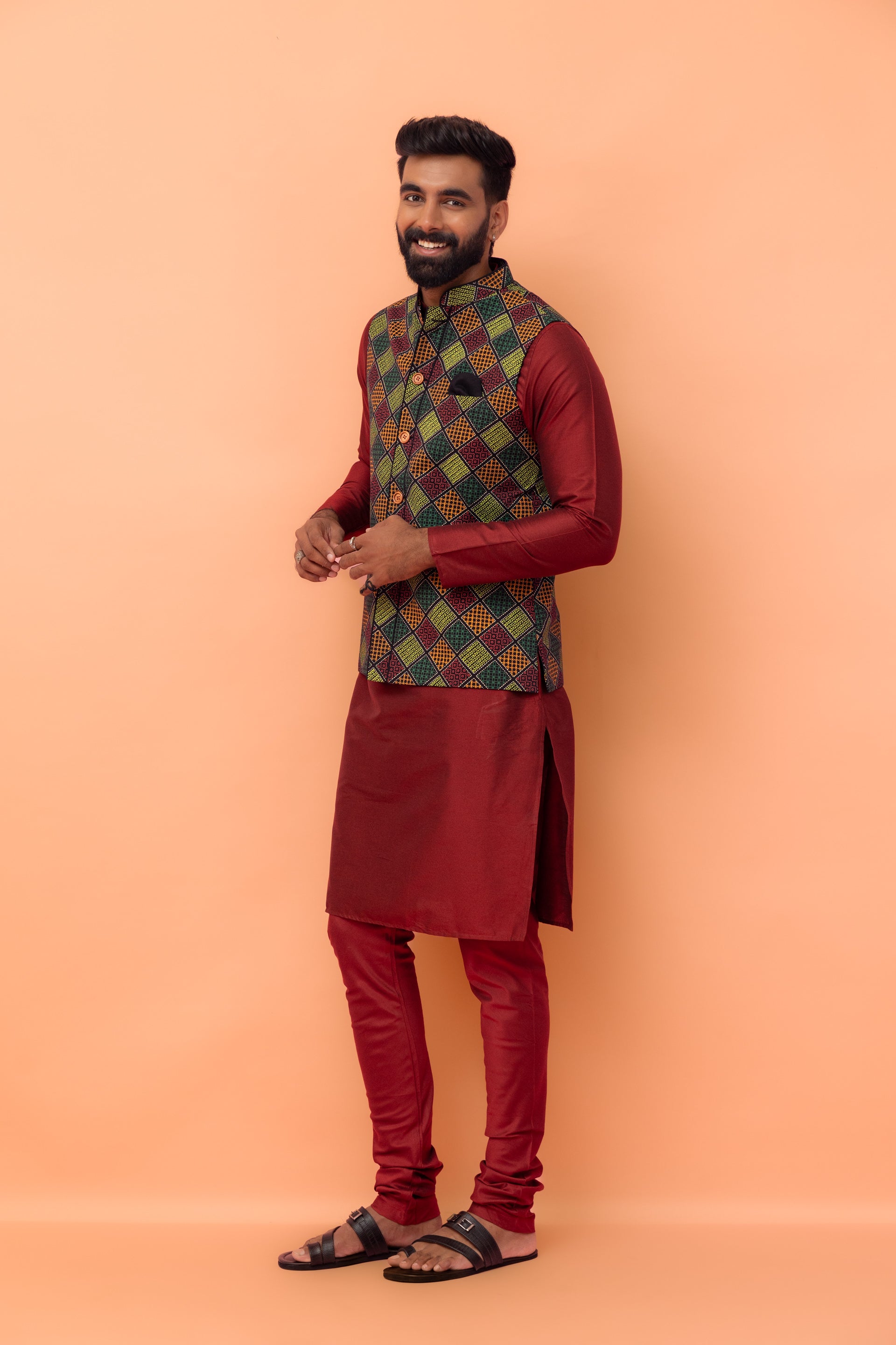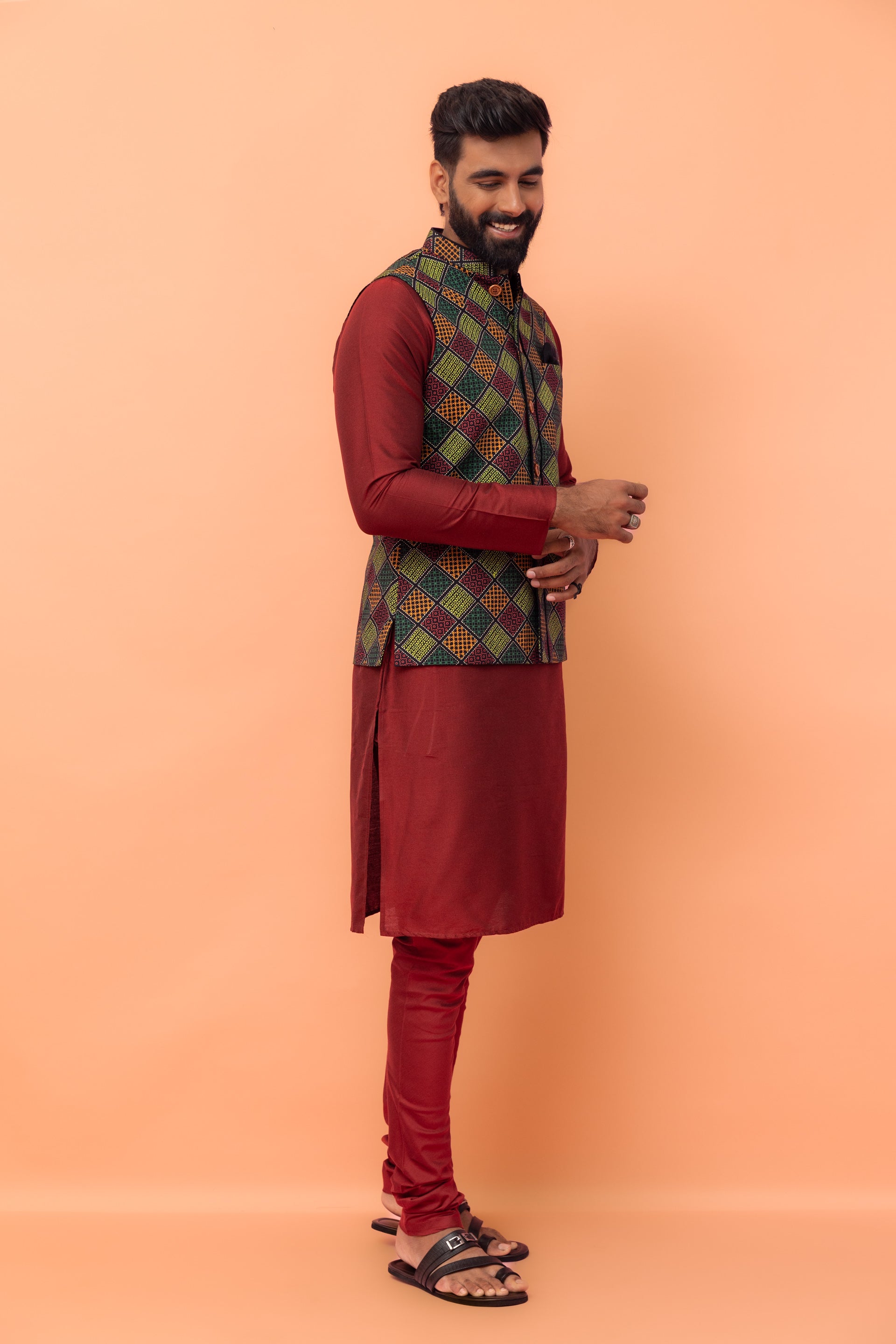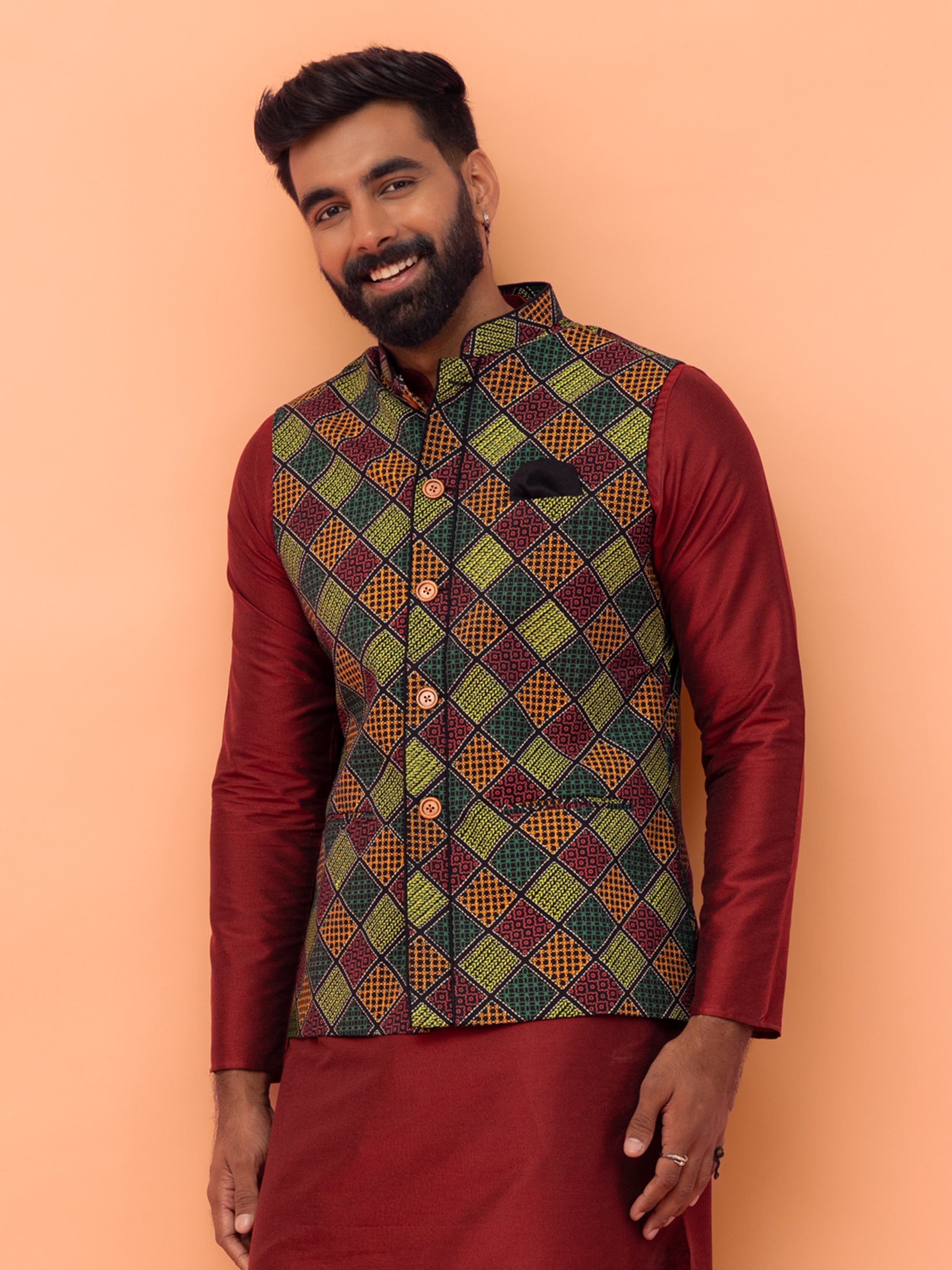 This multi-coloured cotton blend jacket features a printed design and regular fit. Perfect for layering over your kurta, it adds a vibrant and stylish touch to your ethnic collection.