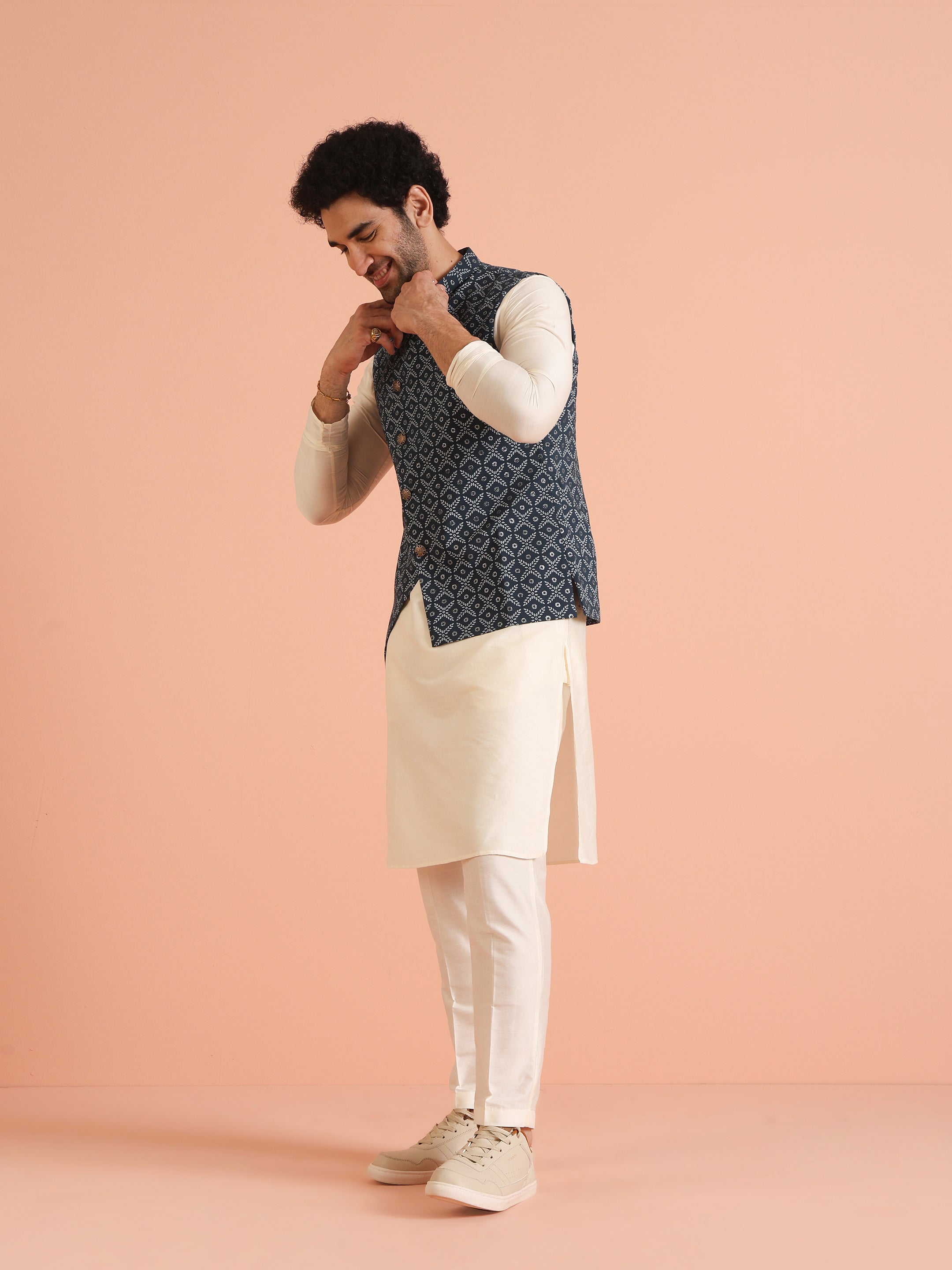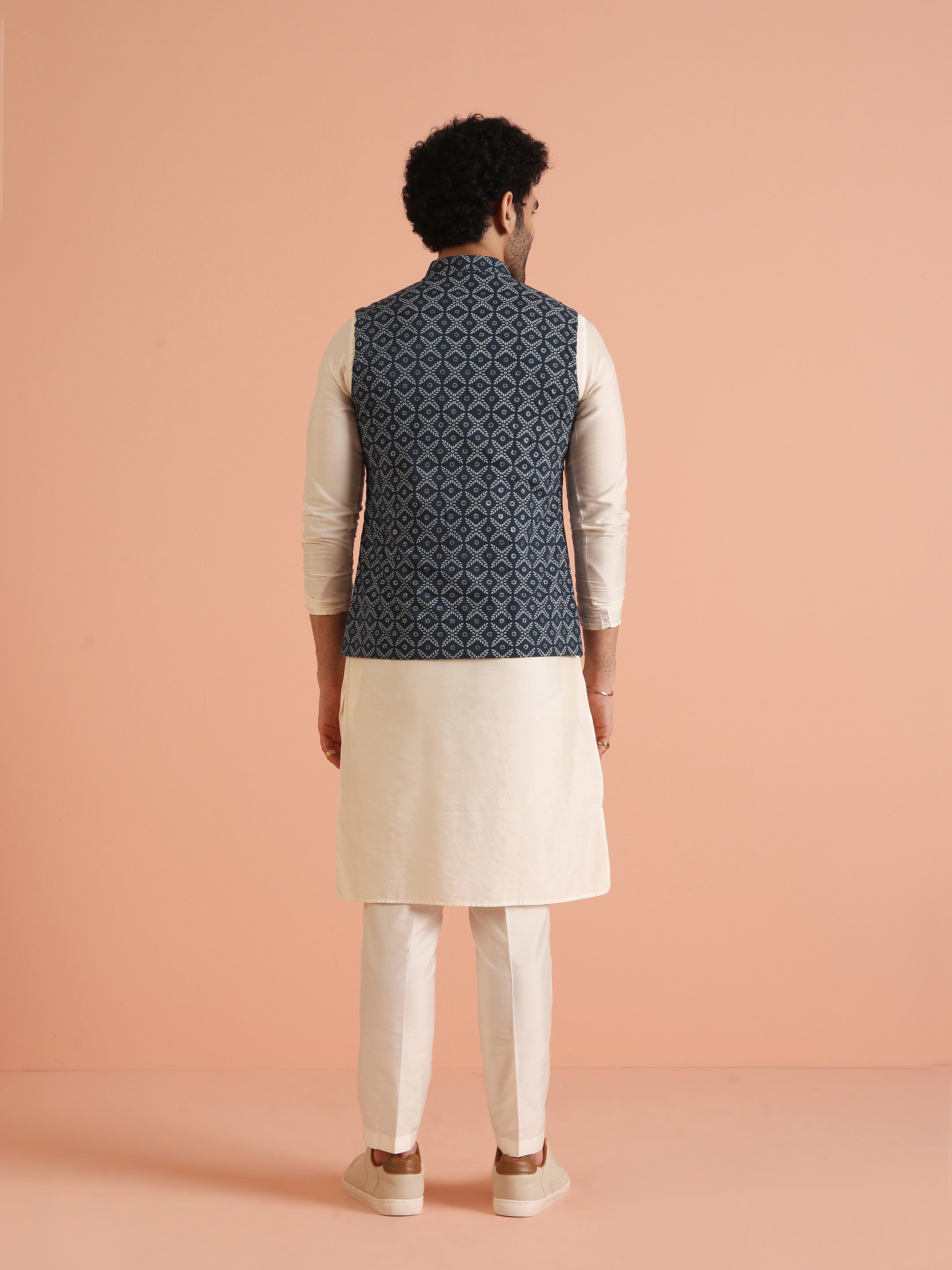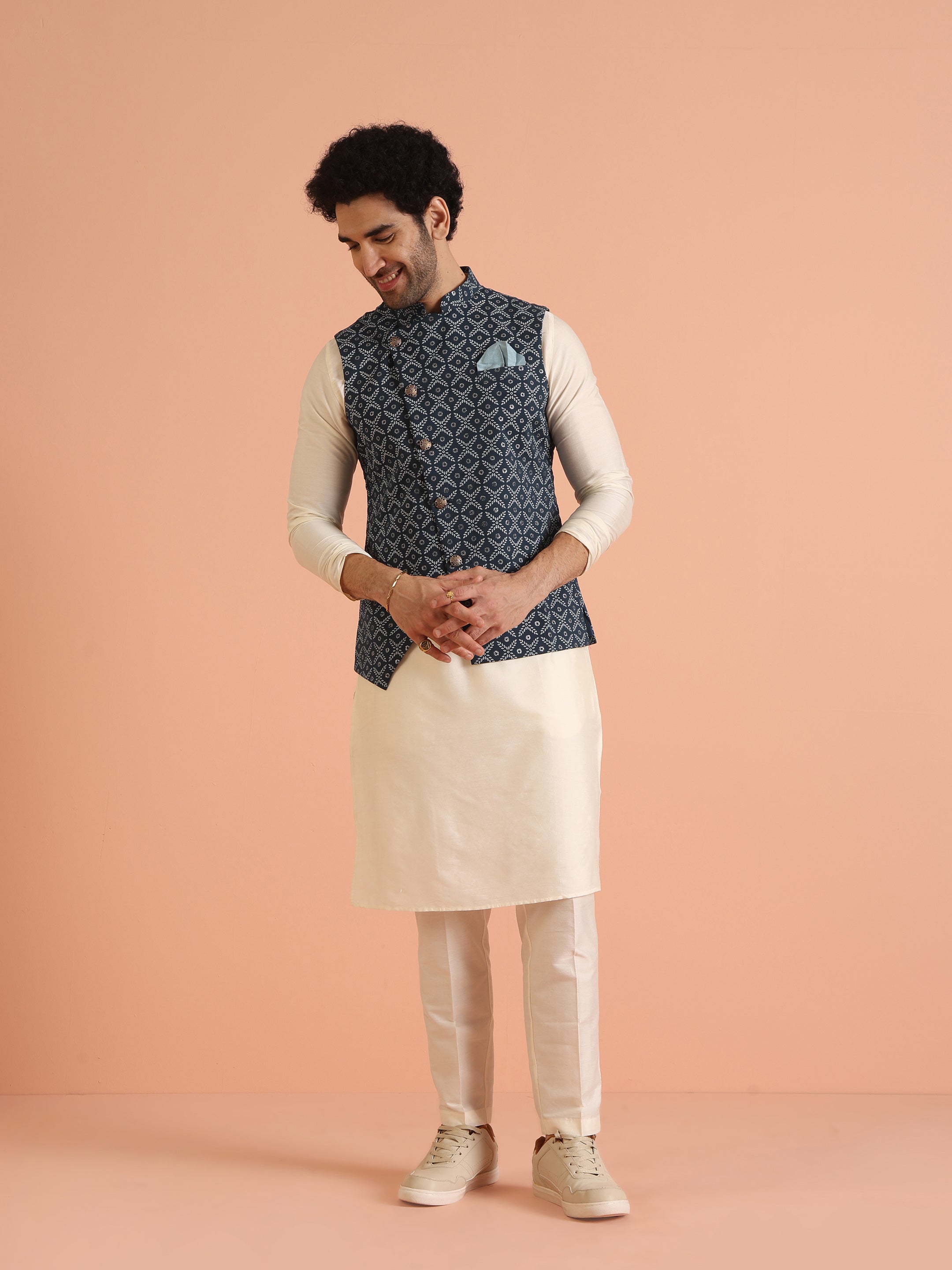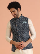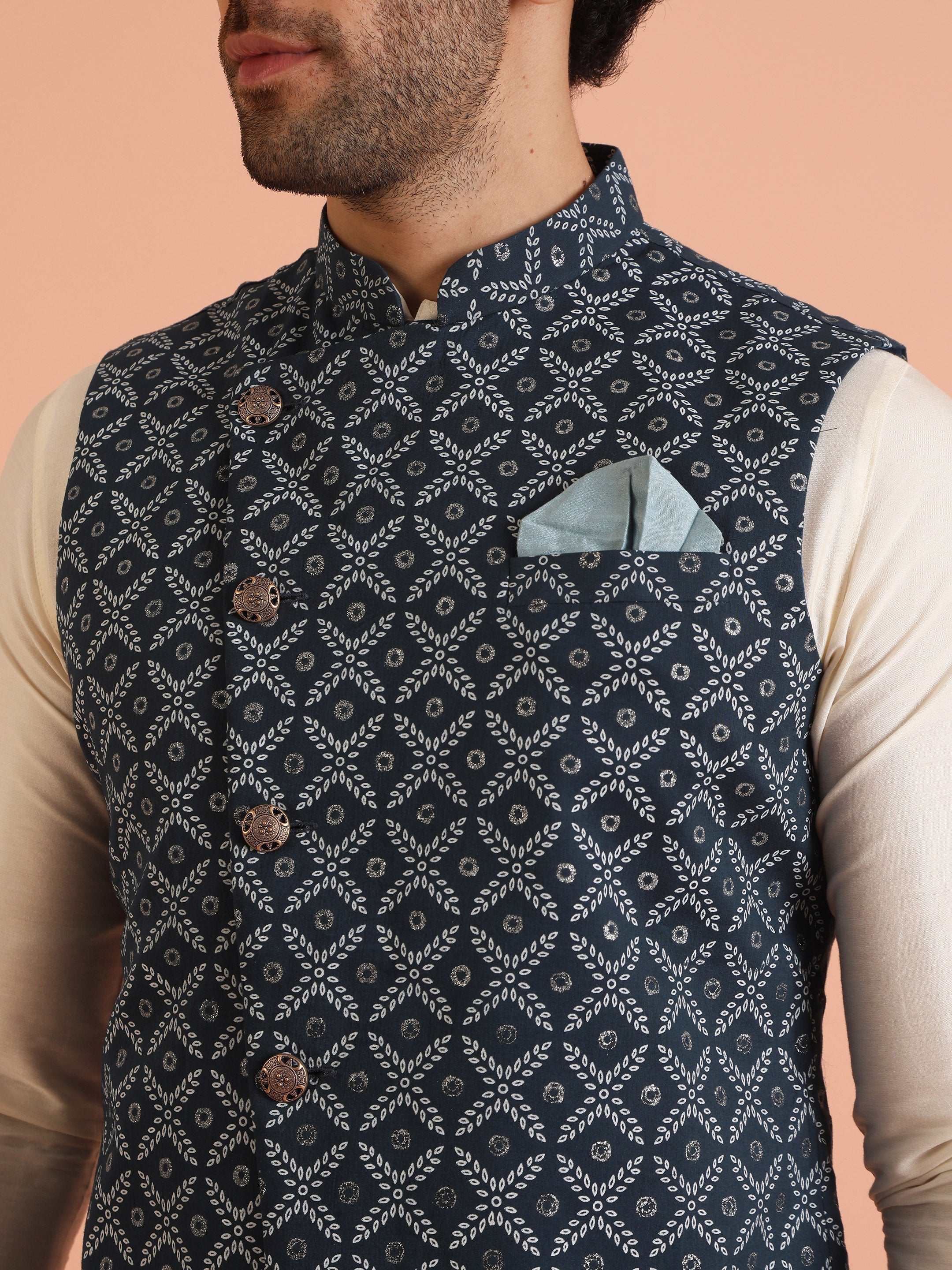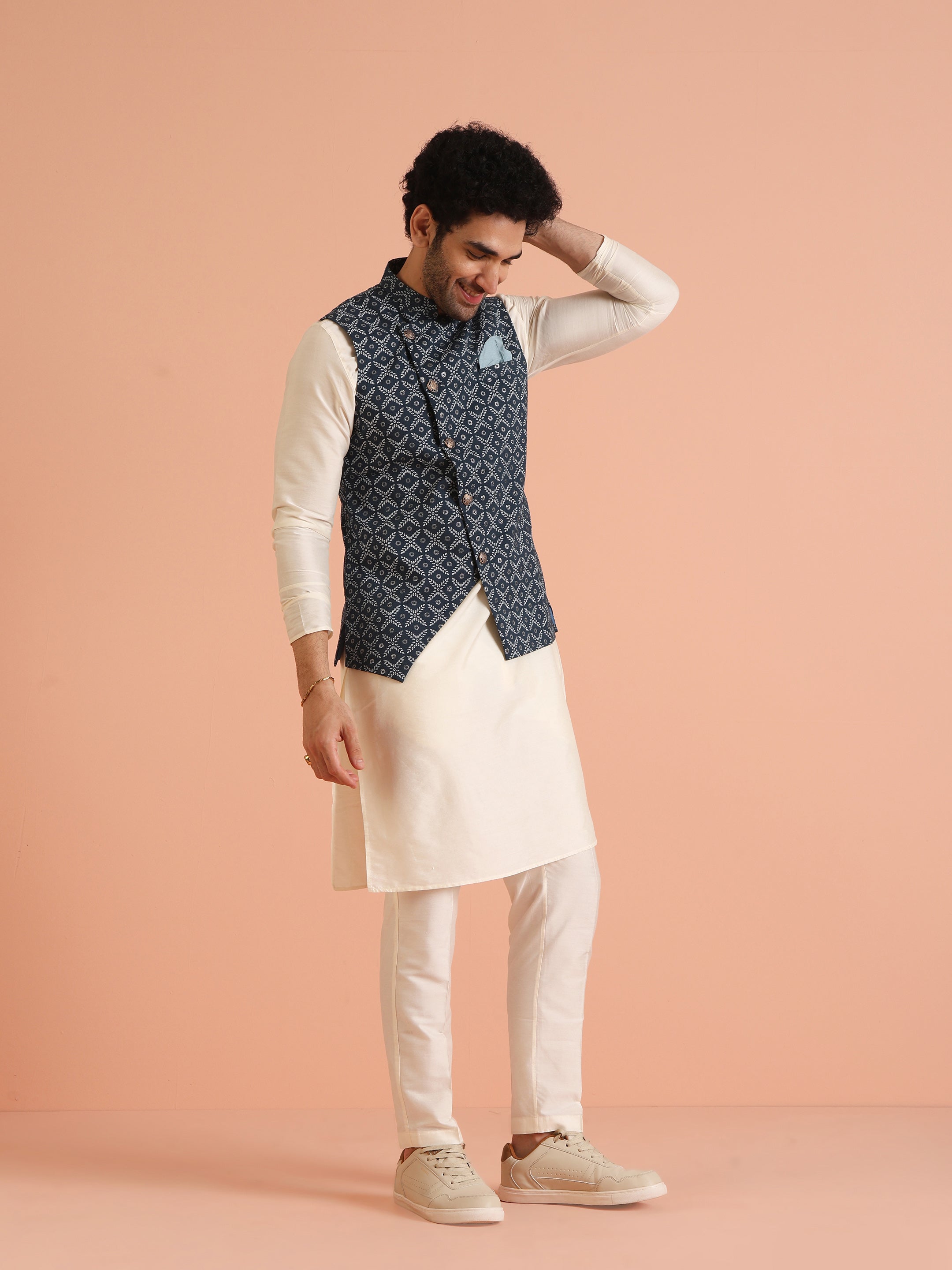 Add a unique touch with this blue silk blend jacket featuring an asymmetrical, printed design. The regular fit ensures comfort, making it a stylish addition to your ethnic wardrobe.