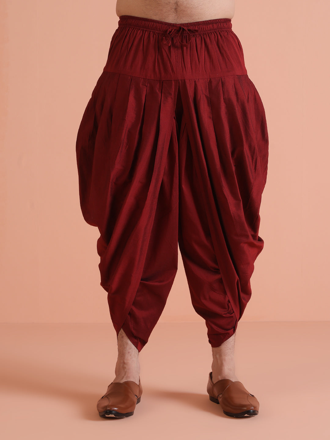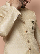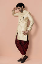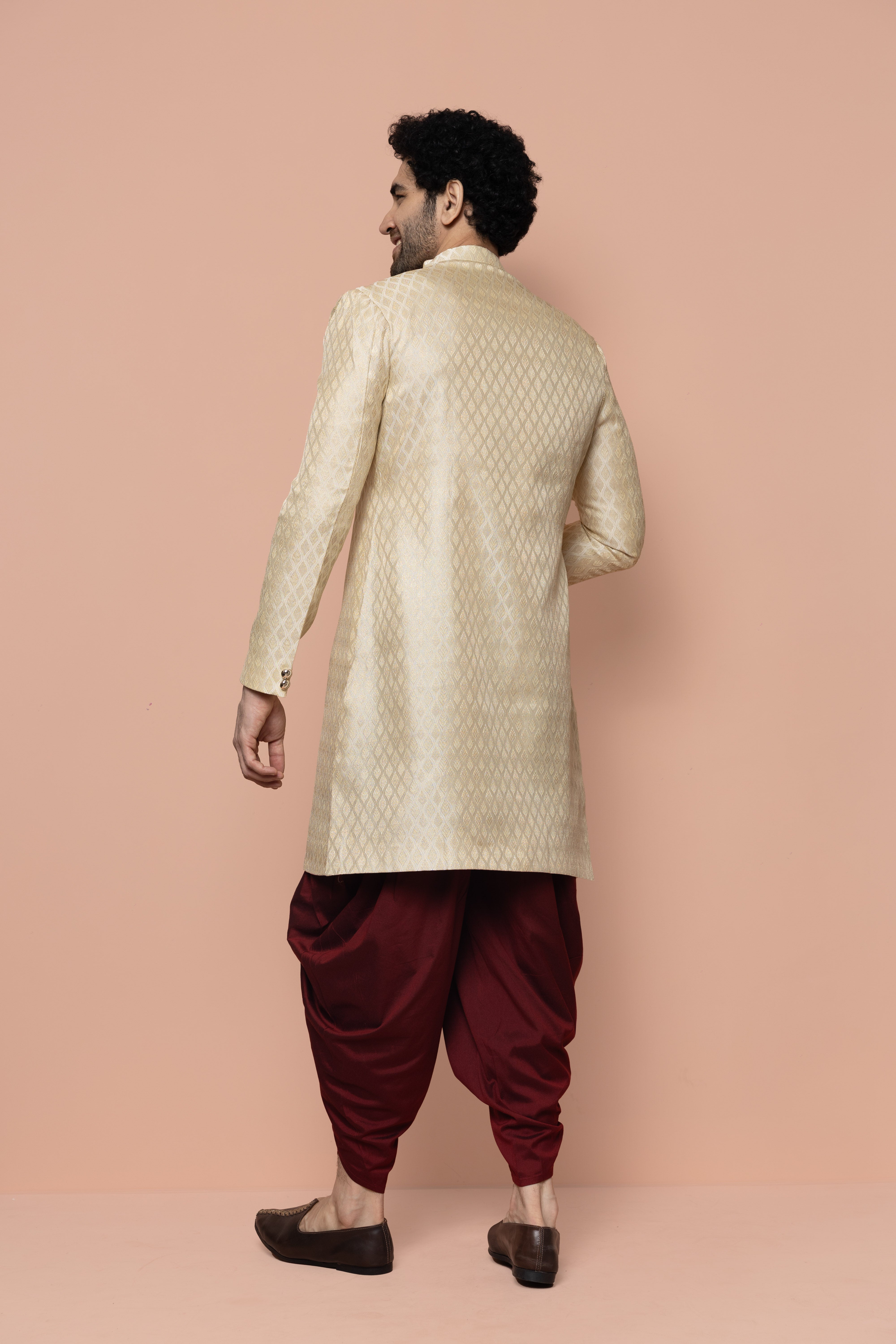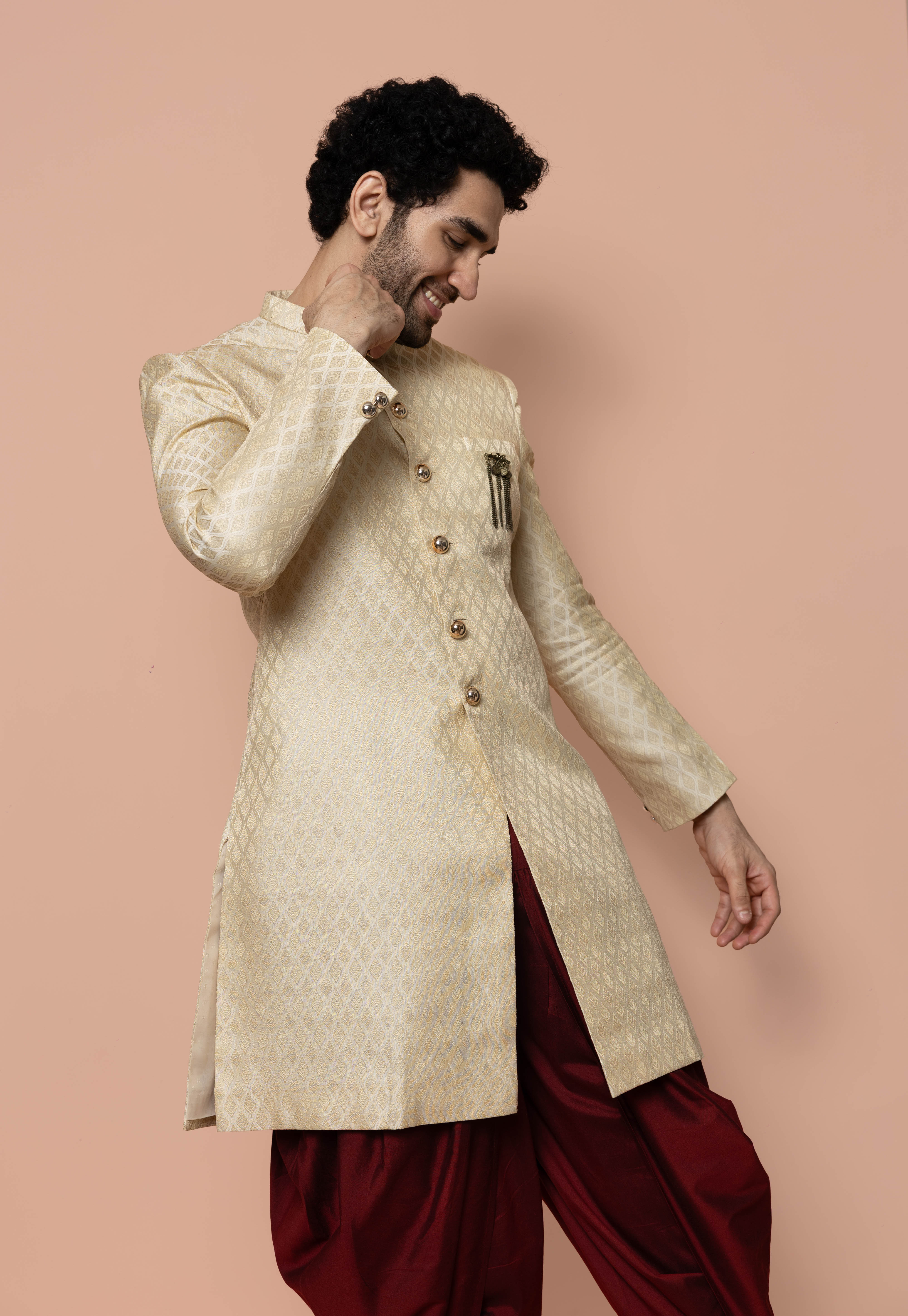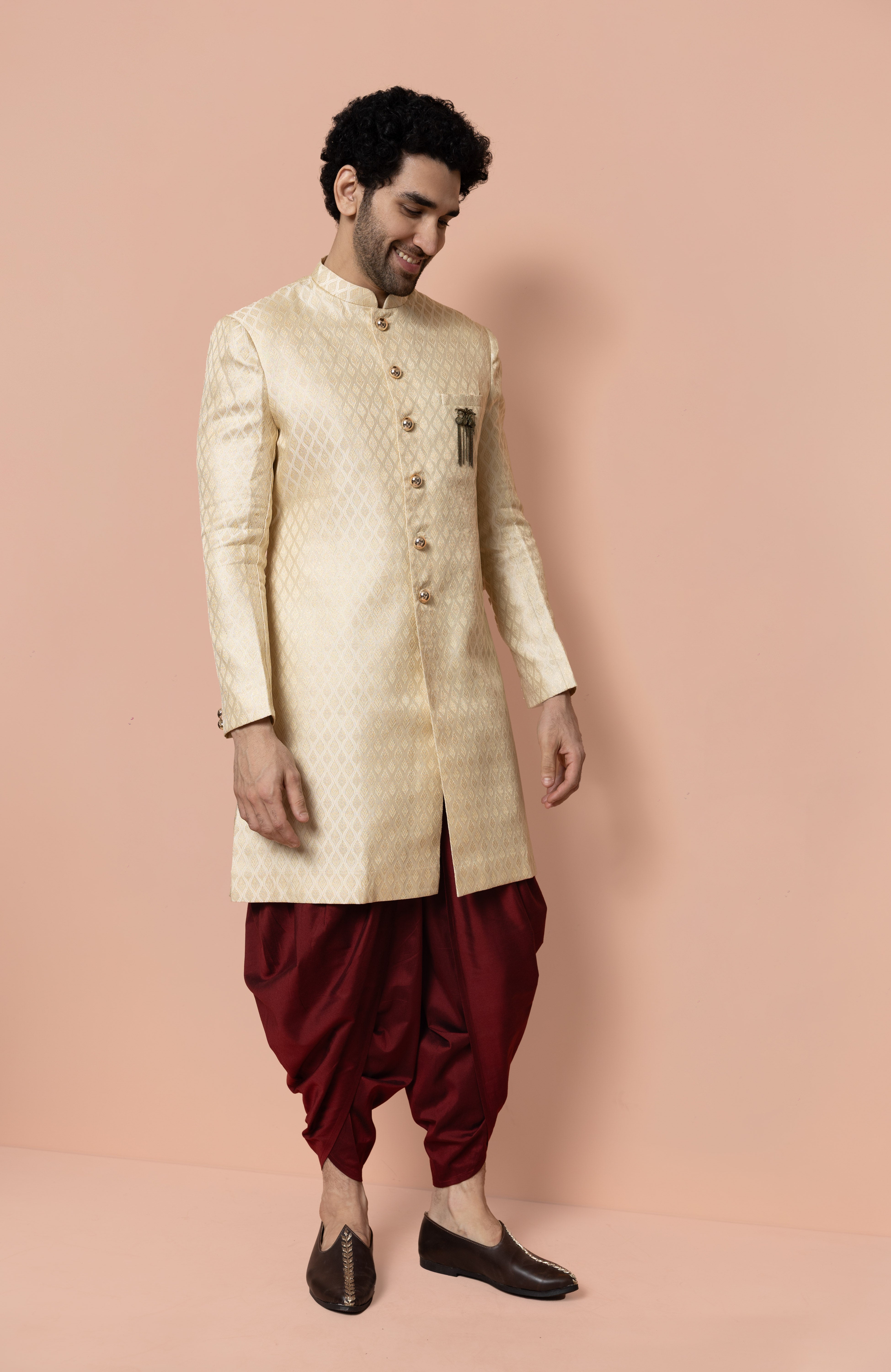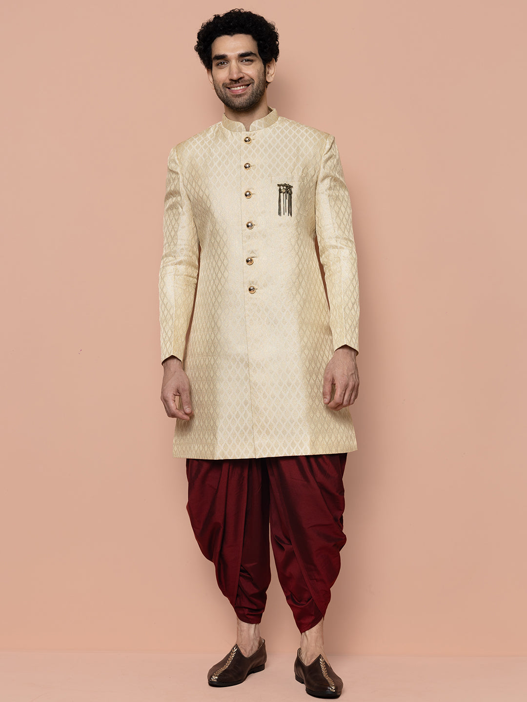 Bring elegance to your ethnic wear with this cream silk blend Indowestern and dhoti set. The textured design and regular fit make it ideal for traditional events.