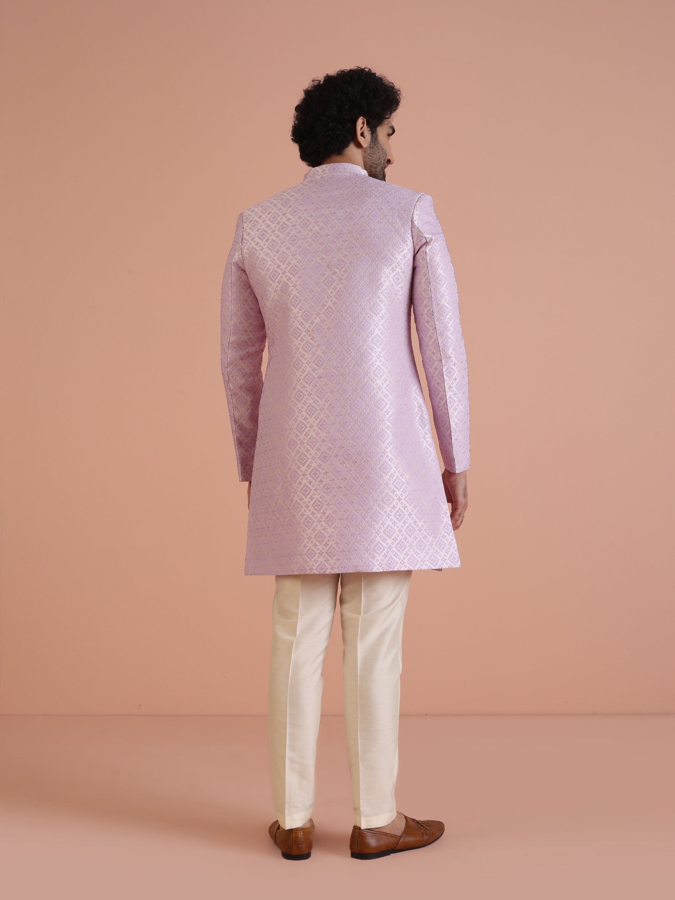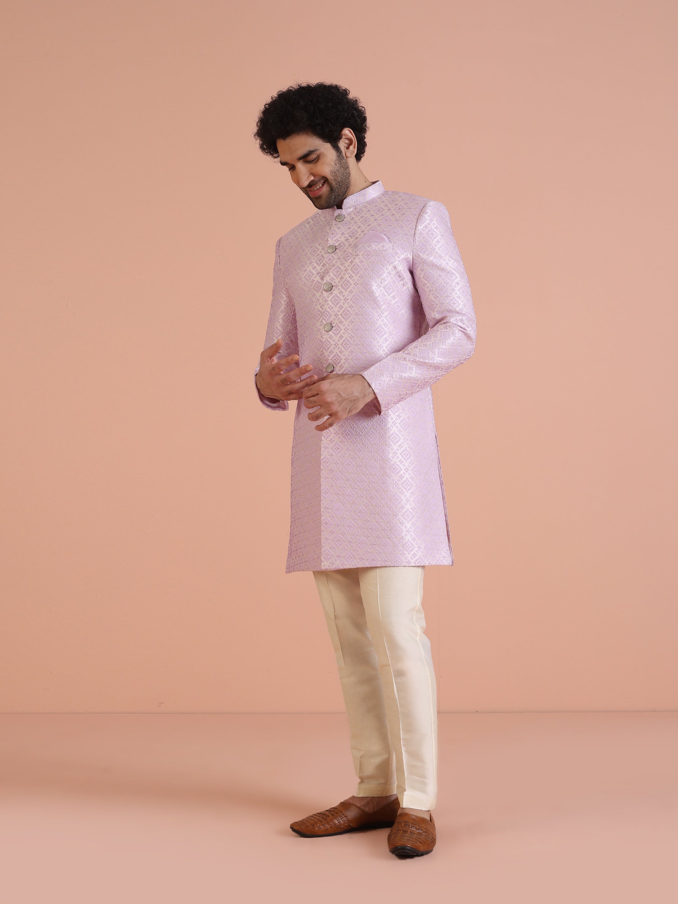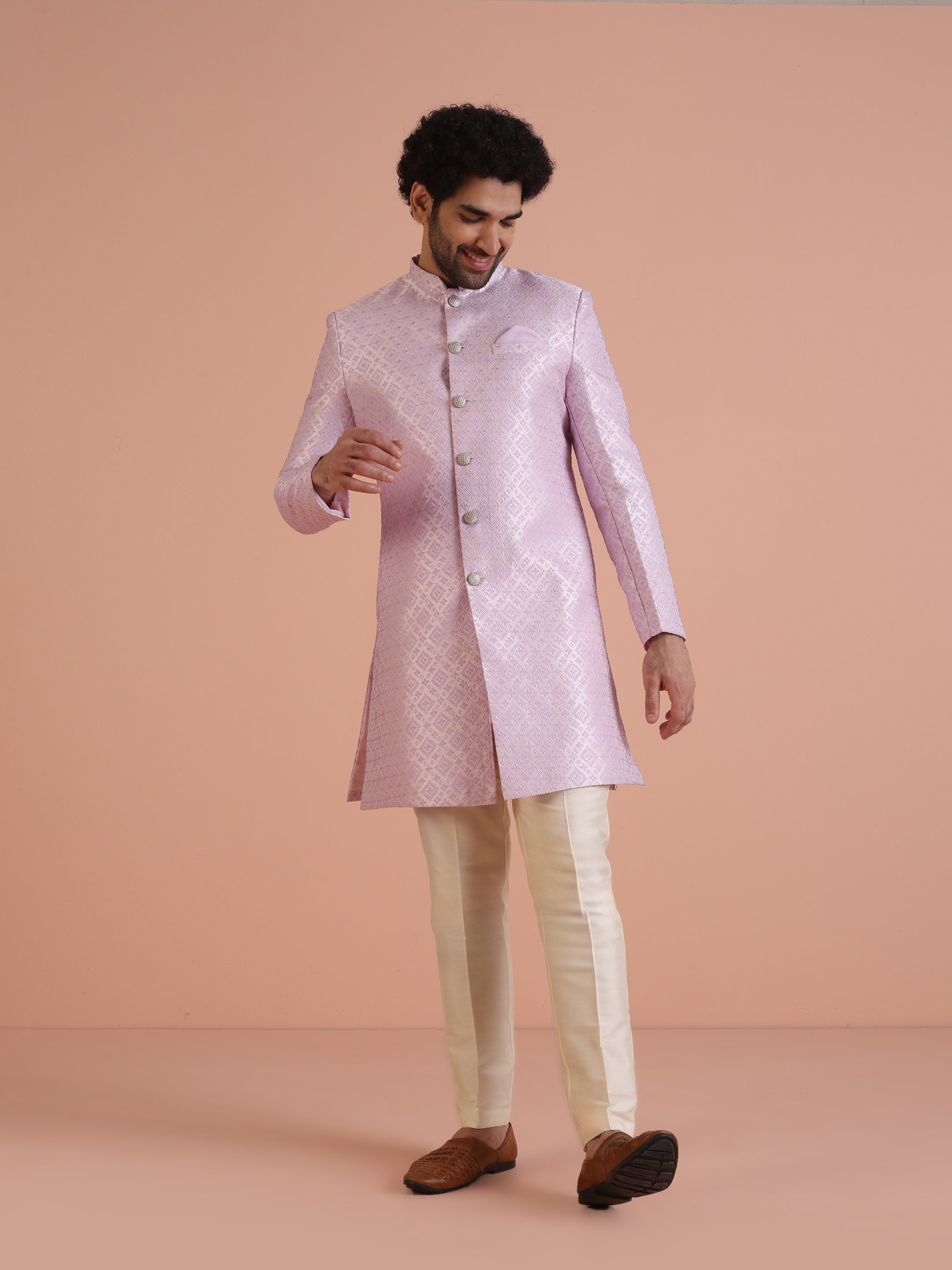 Experience classic elegance with this Men Lilac Woven Design Indowestern Sherwani Trouser Set. The Woven Design Pattern adds a refined touch, while the breathable fabric ensures comfort throughout the day. Ideal for festive events or casual wear.