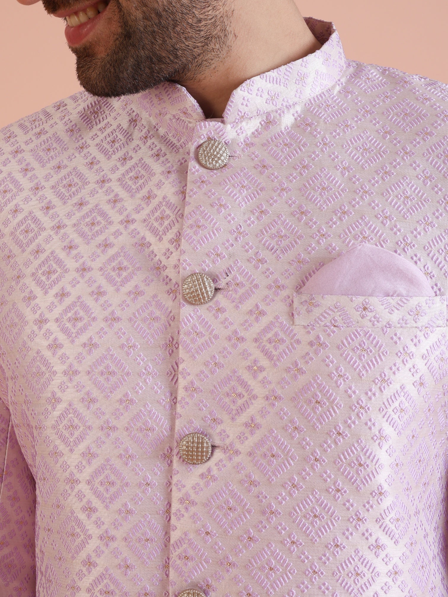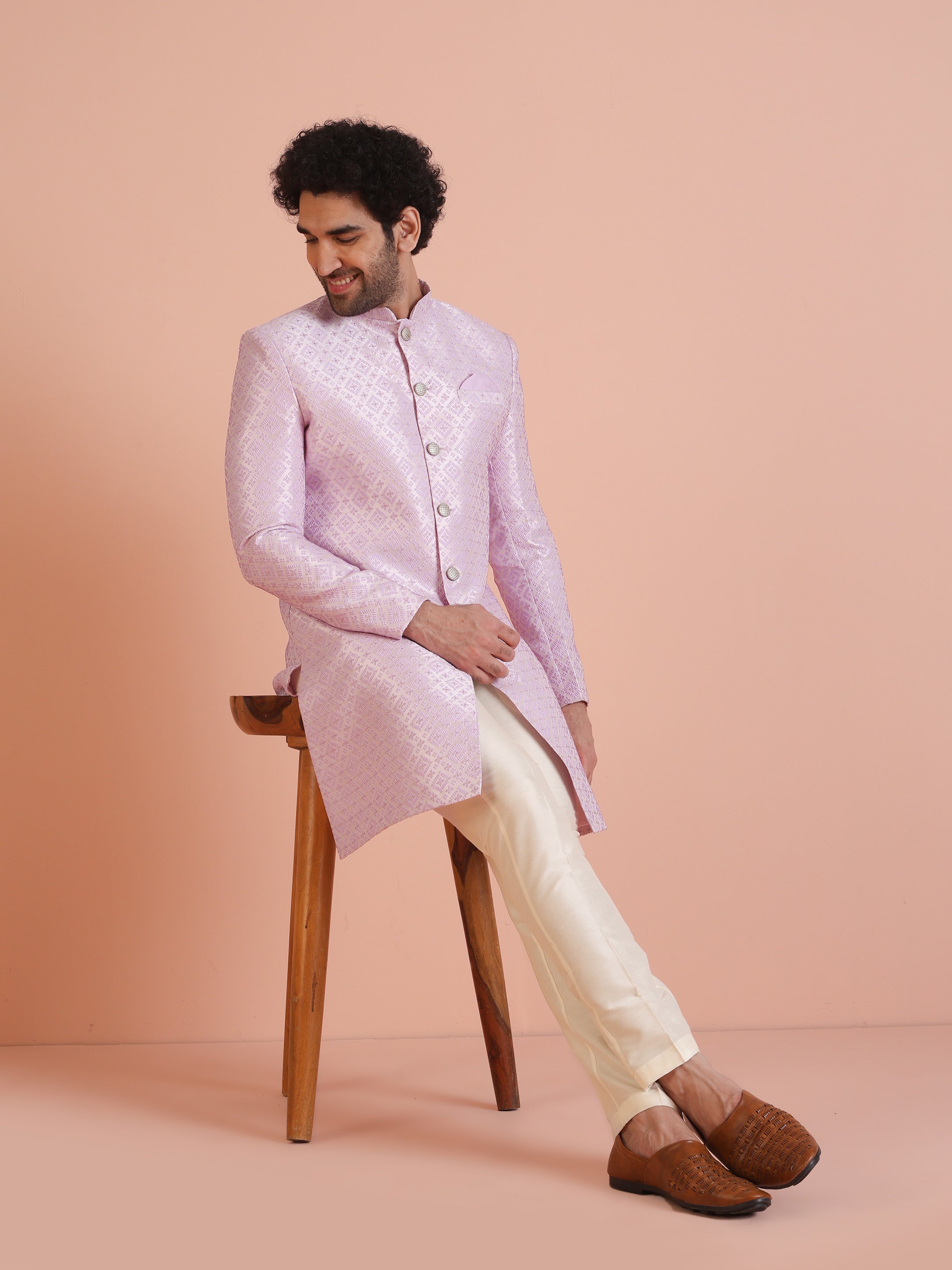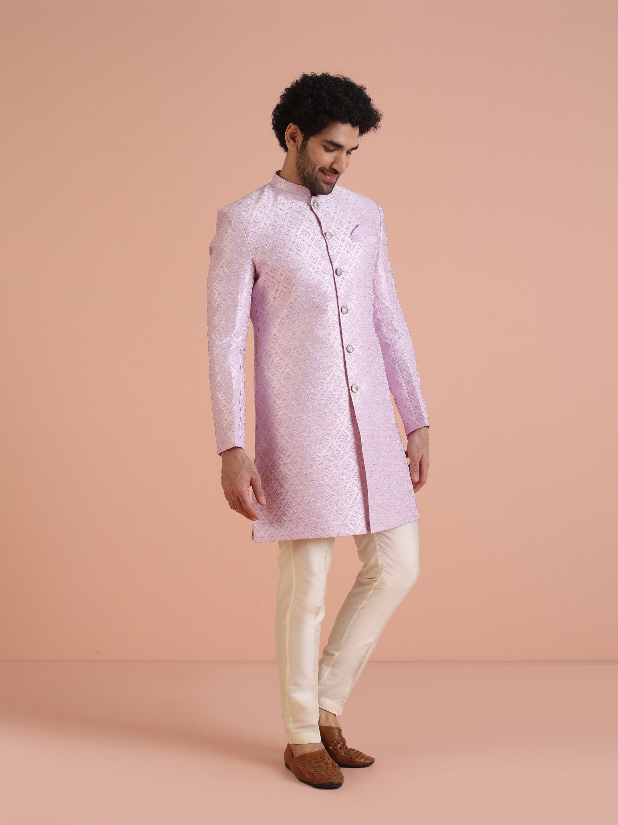 Experience classic elegance with this Men Lilac Woven Design Indowestern Sherwani Trouser Set. The Woven Design Pattern adds a refined touch, while the breathable fabric ensures comfort throughout the day. Ideal for festive events or casual wear.