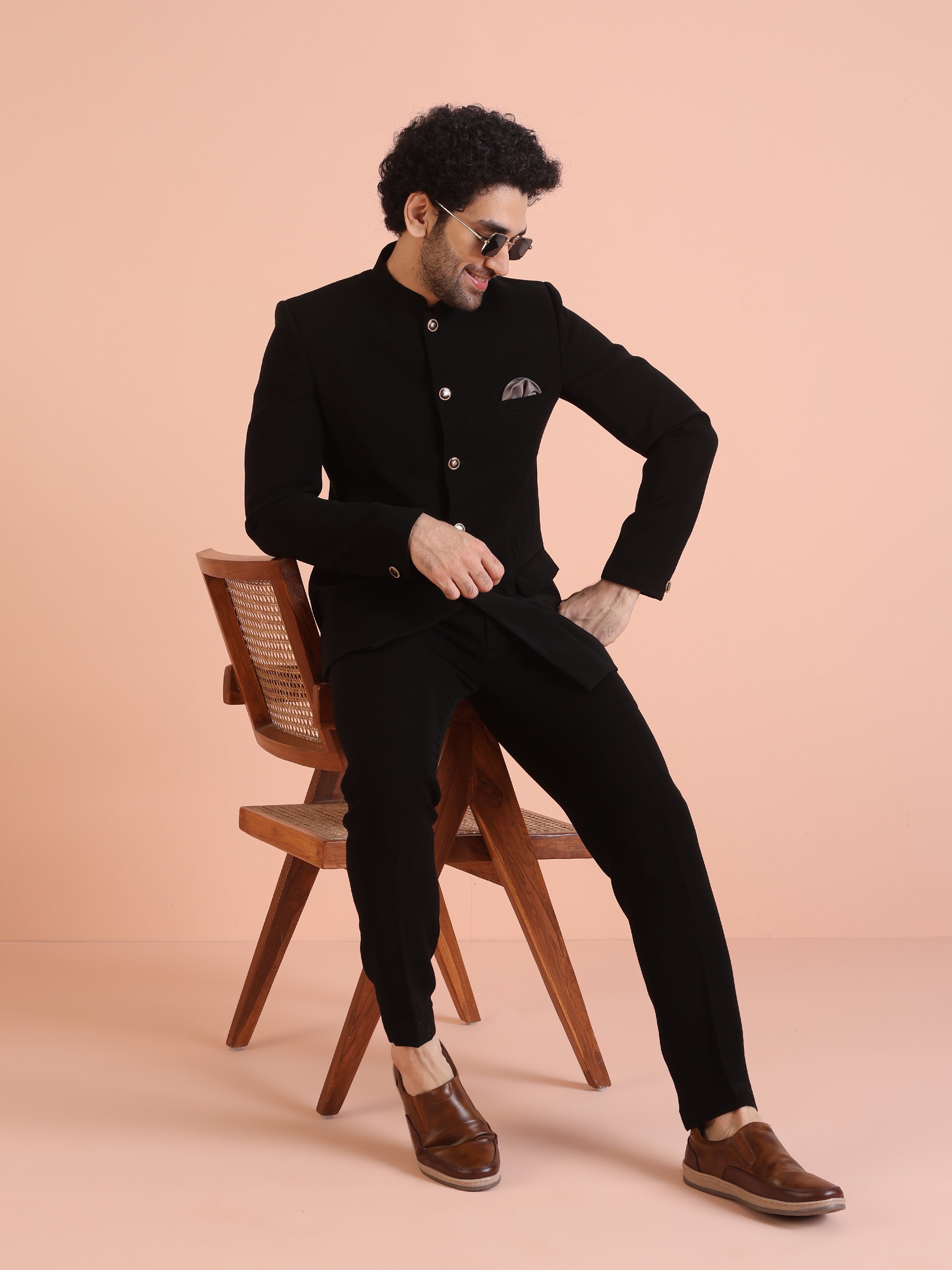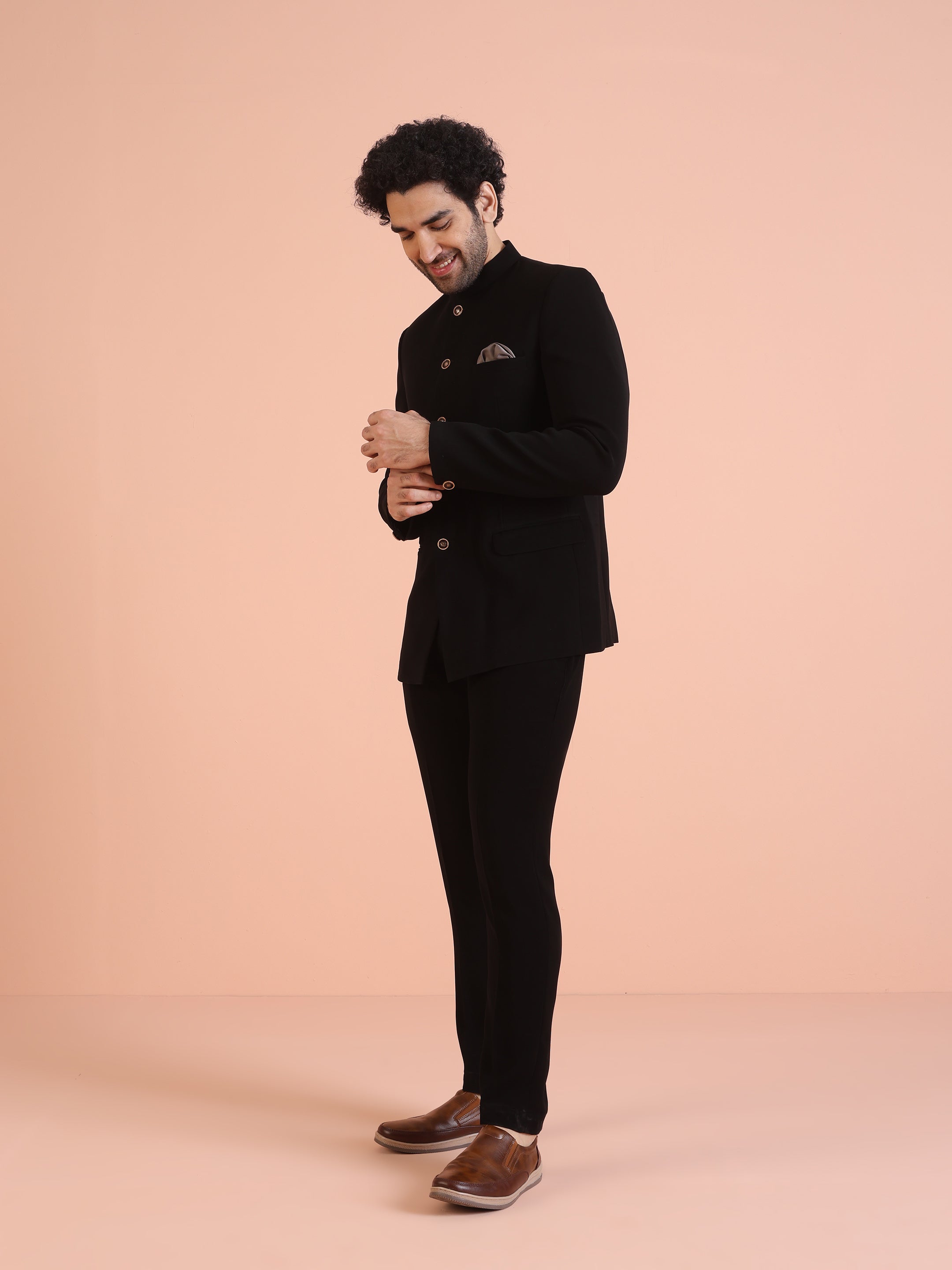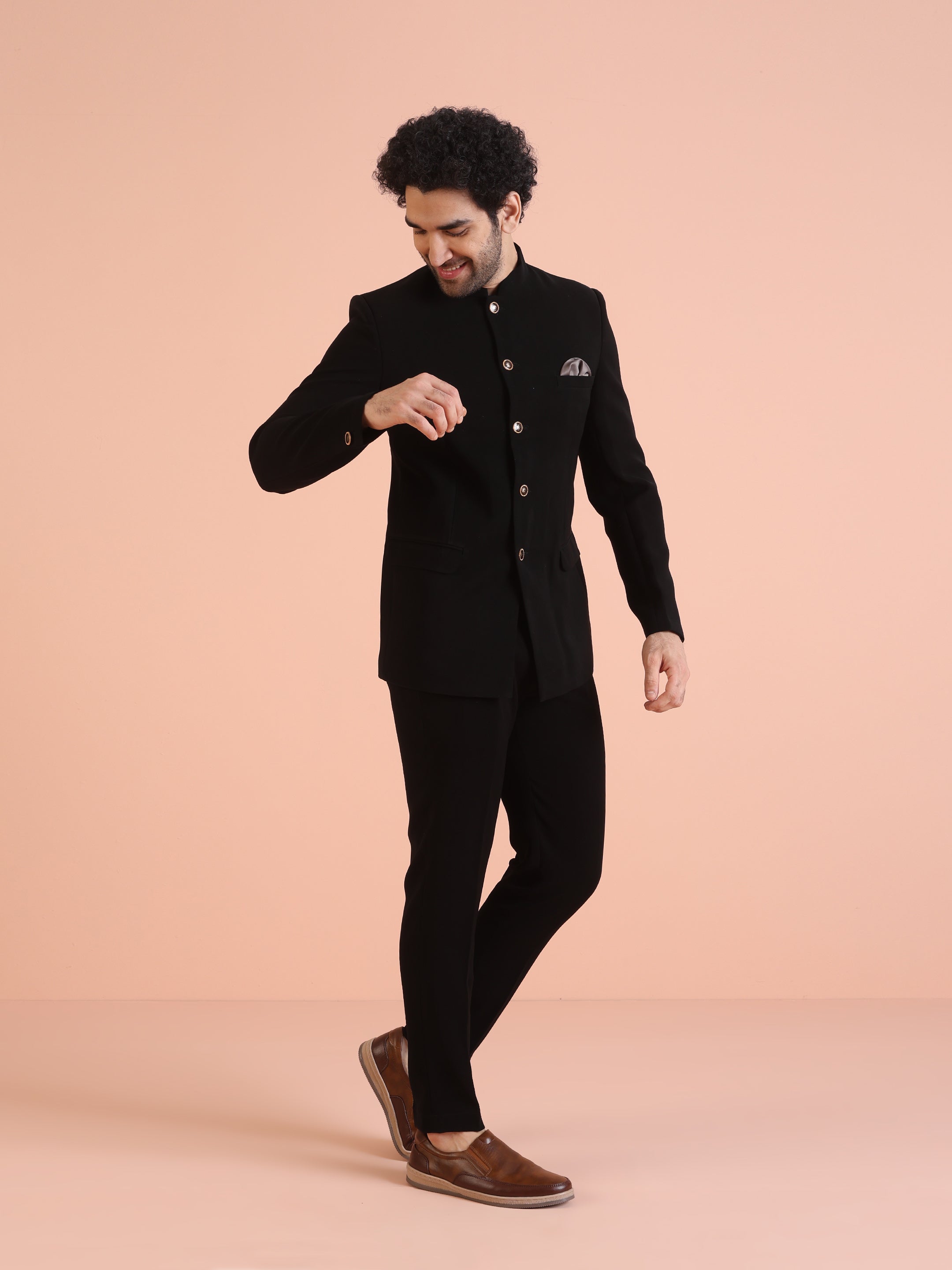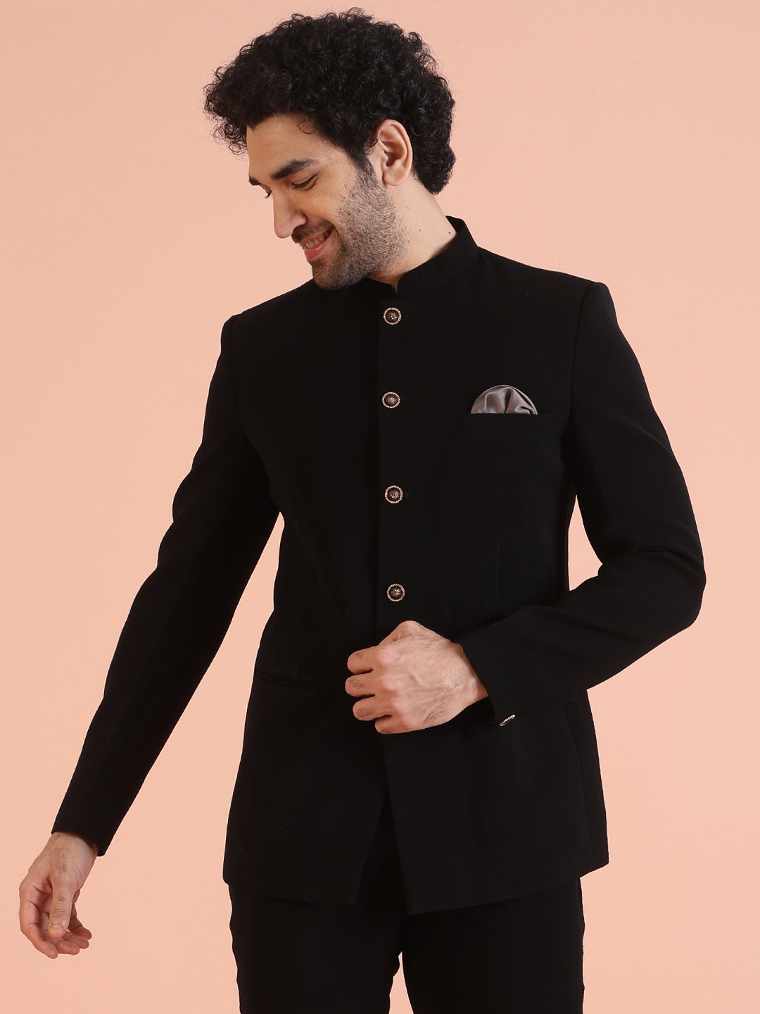 Experience classic elegance with this Men Black Solid Jodhpuri Bandhgala. The Solid Pattern adds a refined touch, while the breathable fabric ensures comfort throughout the day. Ideal for festive events or casual wear.