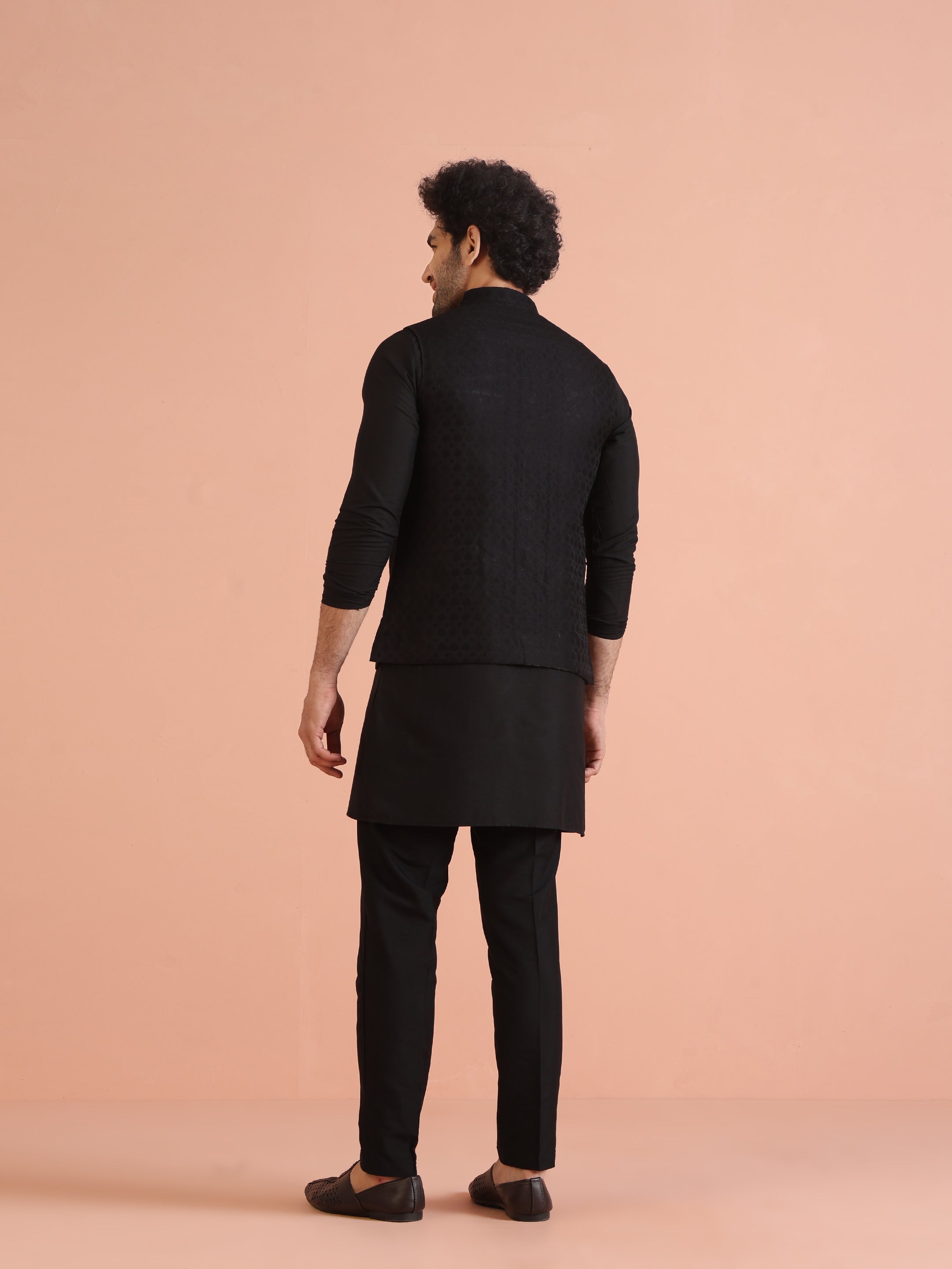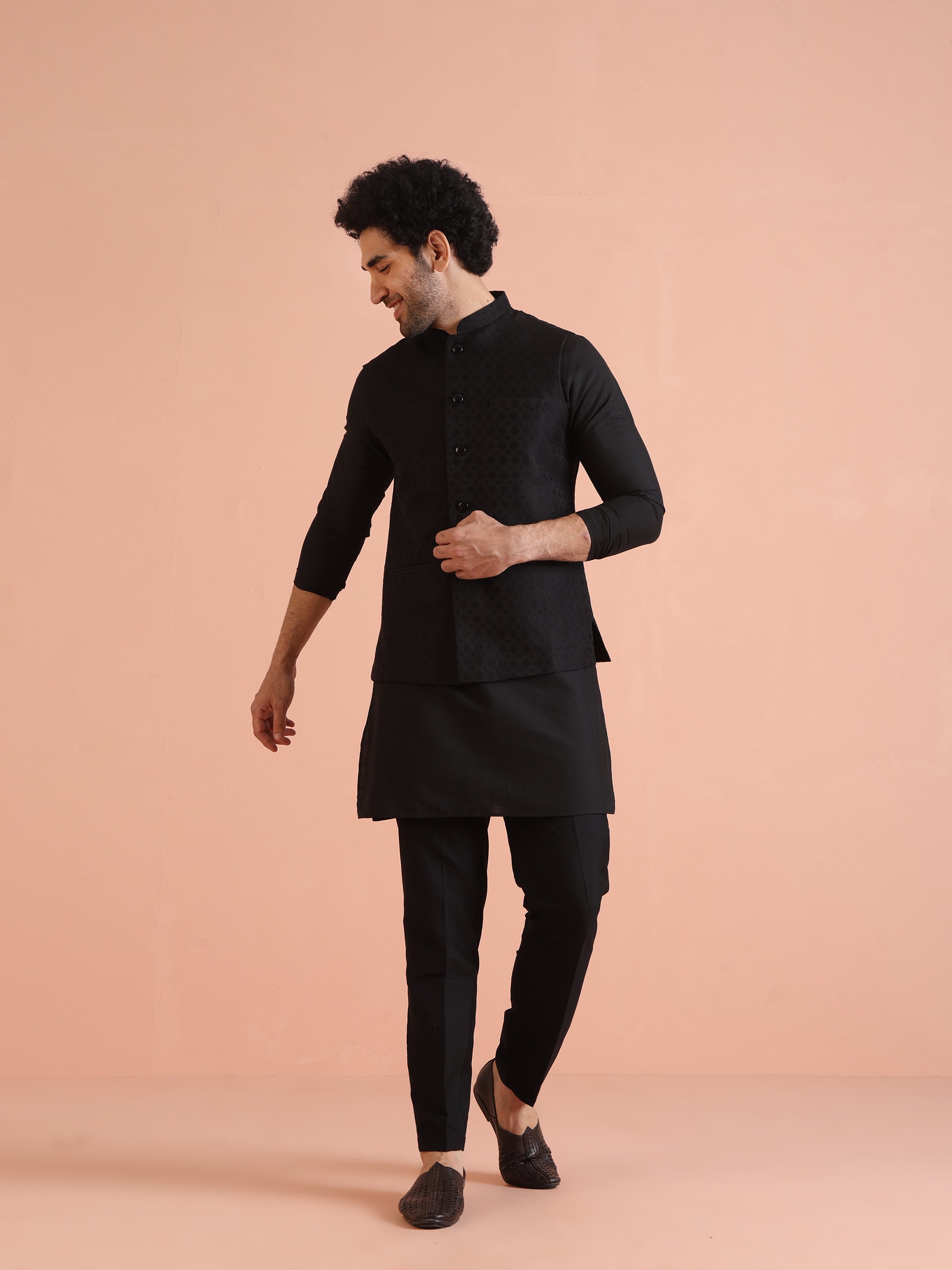 Kisah black textured silk blend Nehru jacket with mandarin collar and matte buttons, designed for weddings, cocktail evenings, festive parties, and modern ethnic styling.