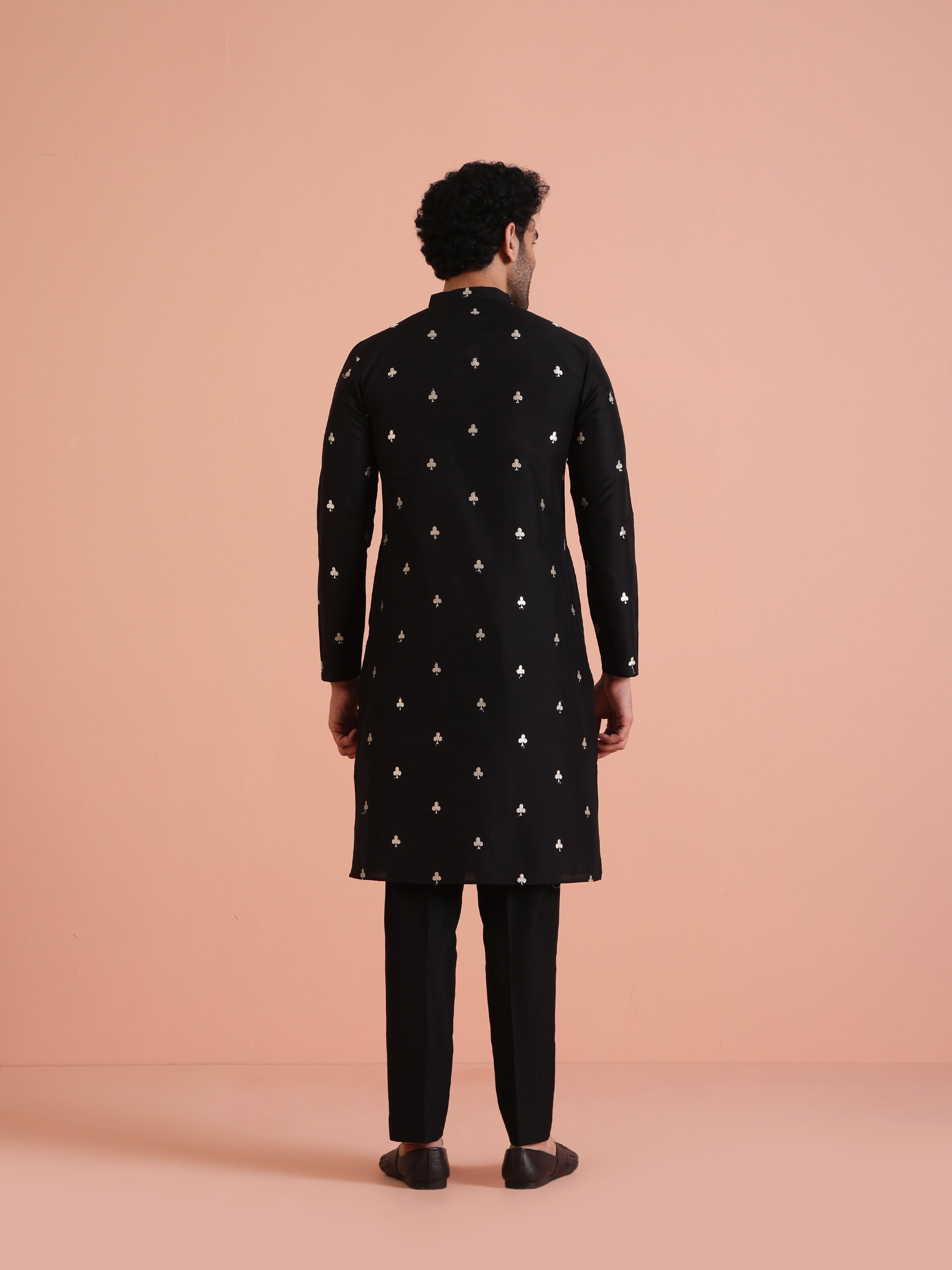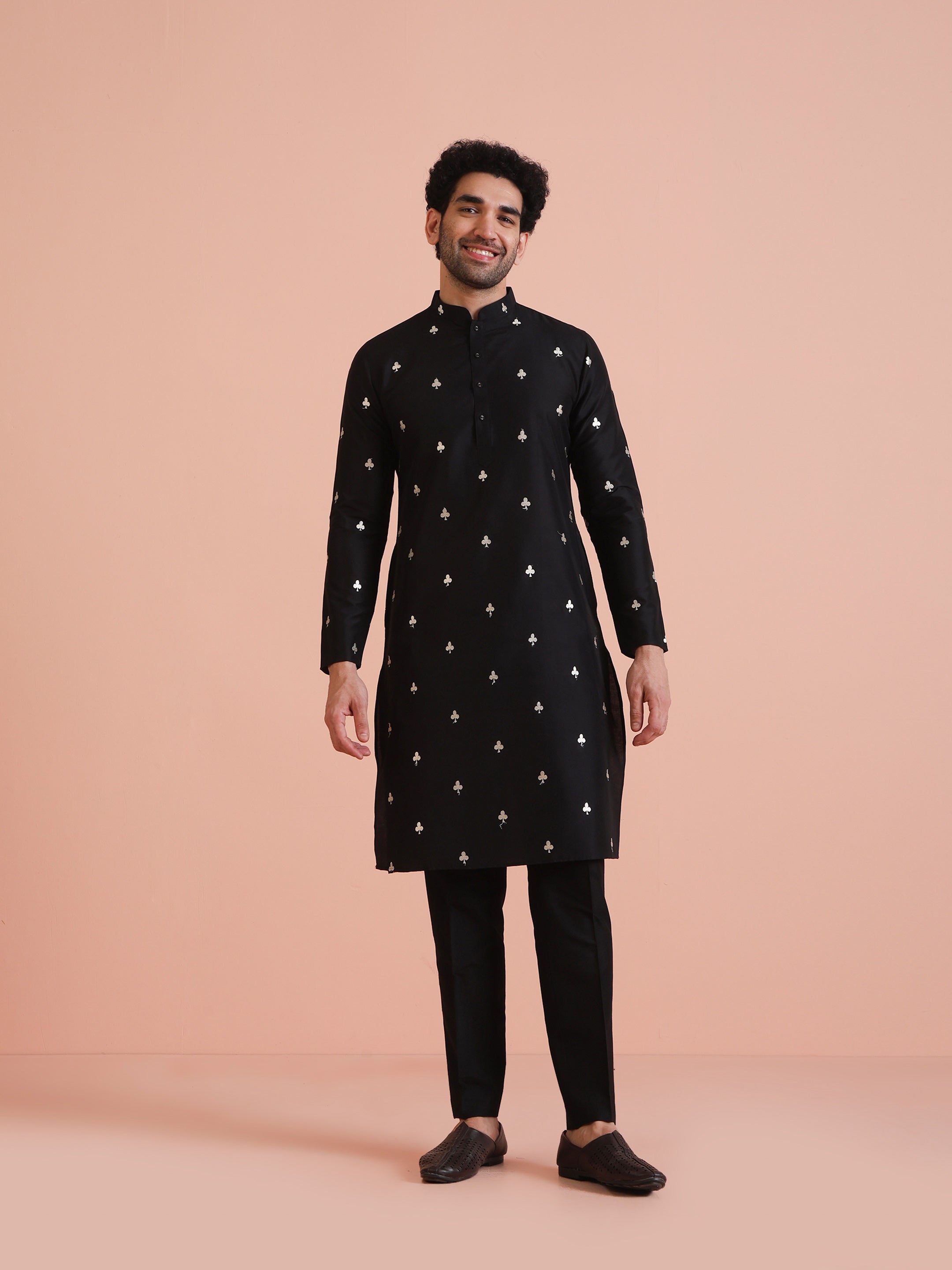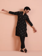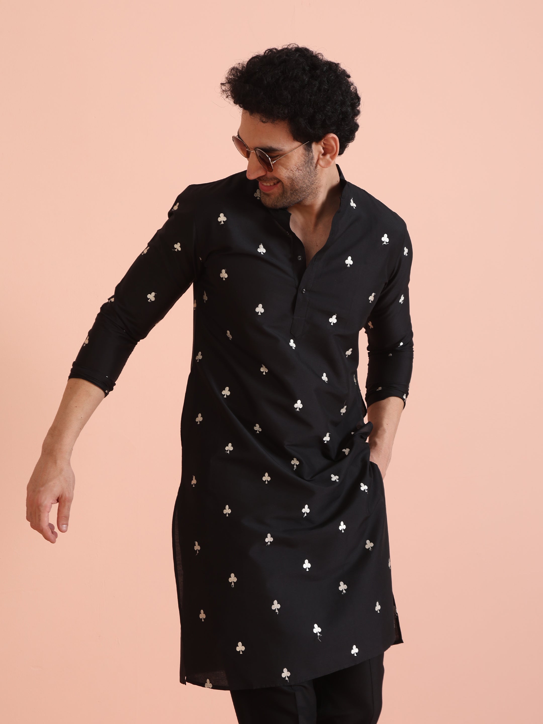 This black cotton blend kurta with intricate embroidery offers a regular fit and stylish design. Ideal for traditional events or casual outings, it combines elegance with comfort.