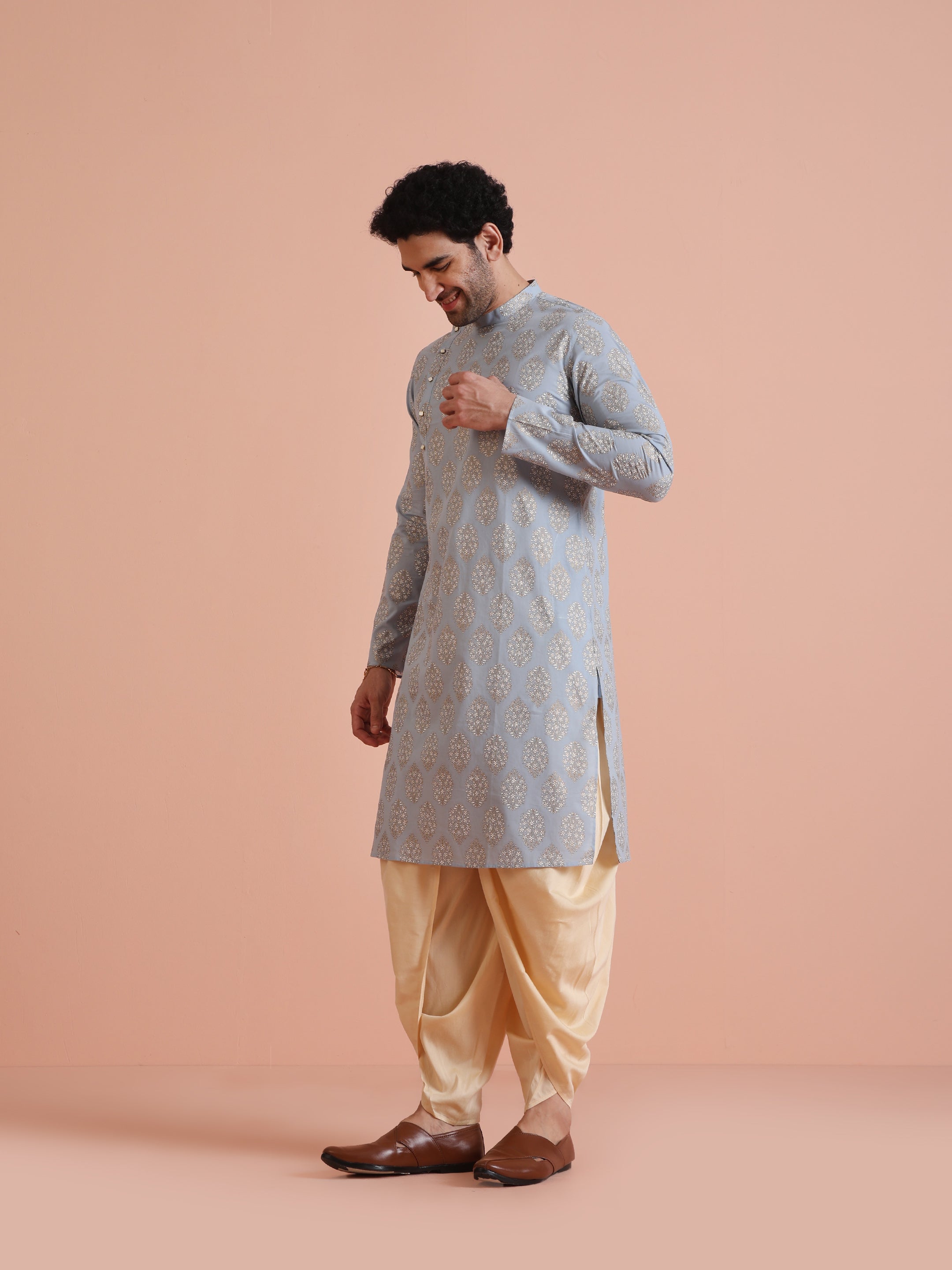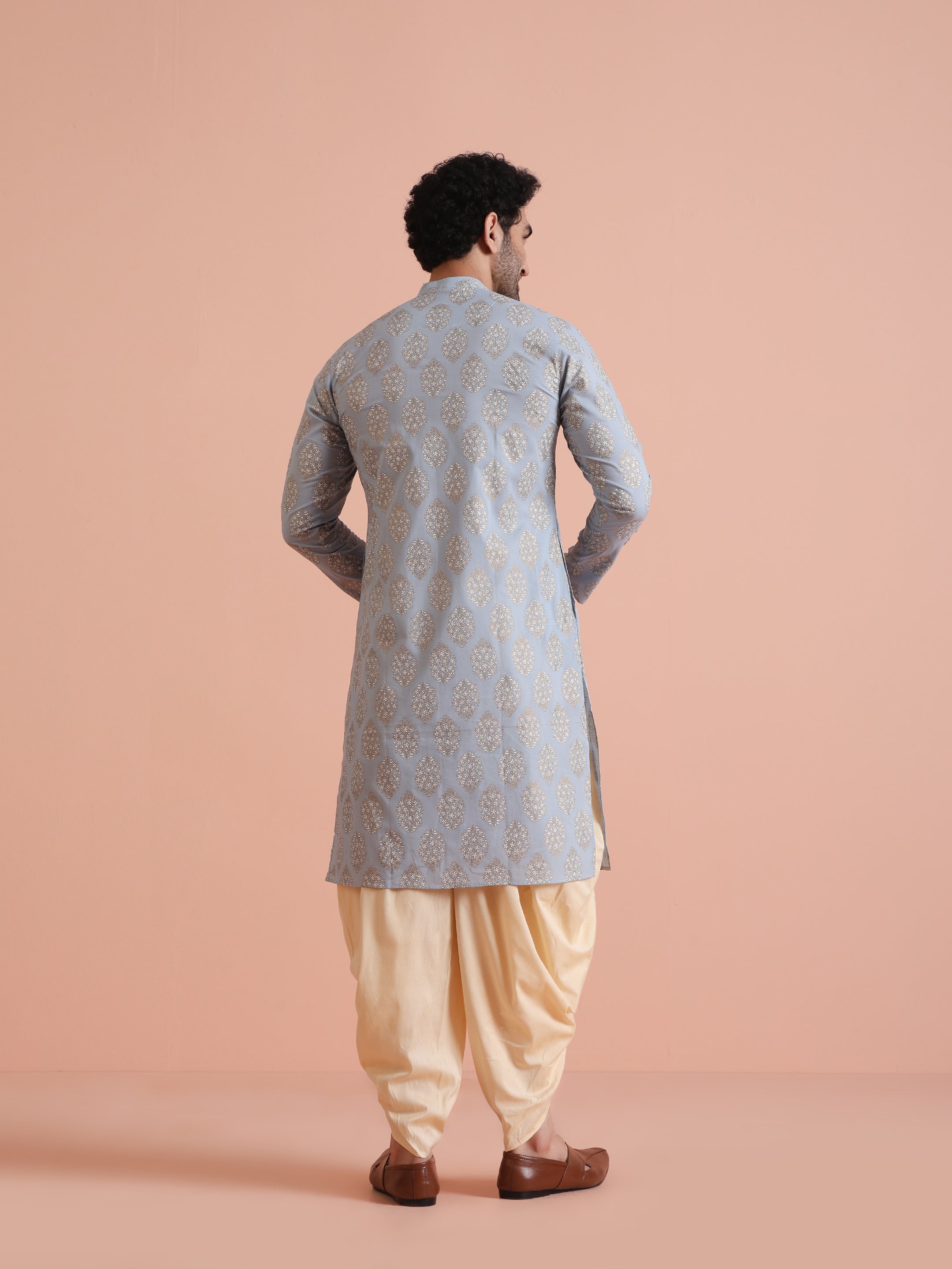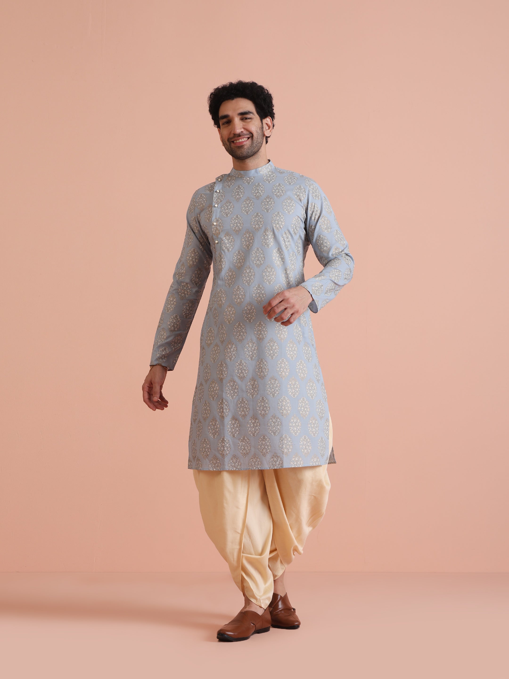 Dress to impress with our Blue Printed Kurta & Dhoti set. Made from a comfortable cotton blend, this regular-fit ensemble is perfect for festive events, blending modern prints with traditional styles.